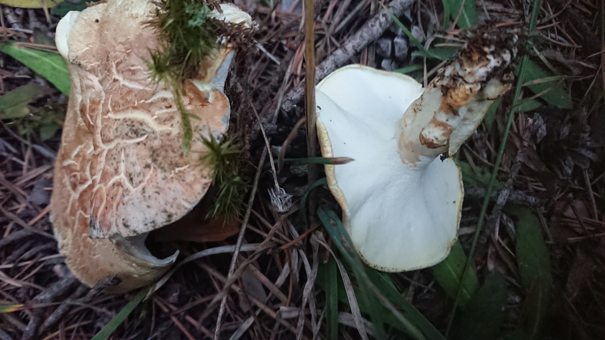Hut: jung gewölbt mit eingerolltem Rand, dann flach bis schwach trichterig, meist unregelmässig verbogen, jung kalkweiss und feinfilzig, später gelblich und felderig aufreissend.