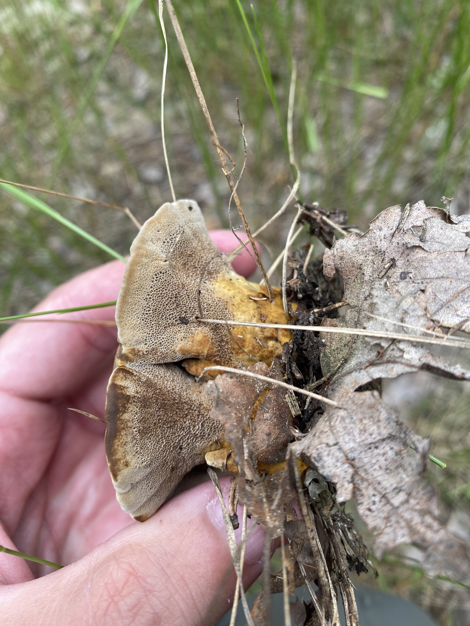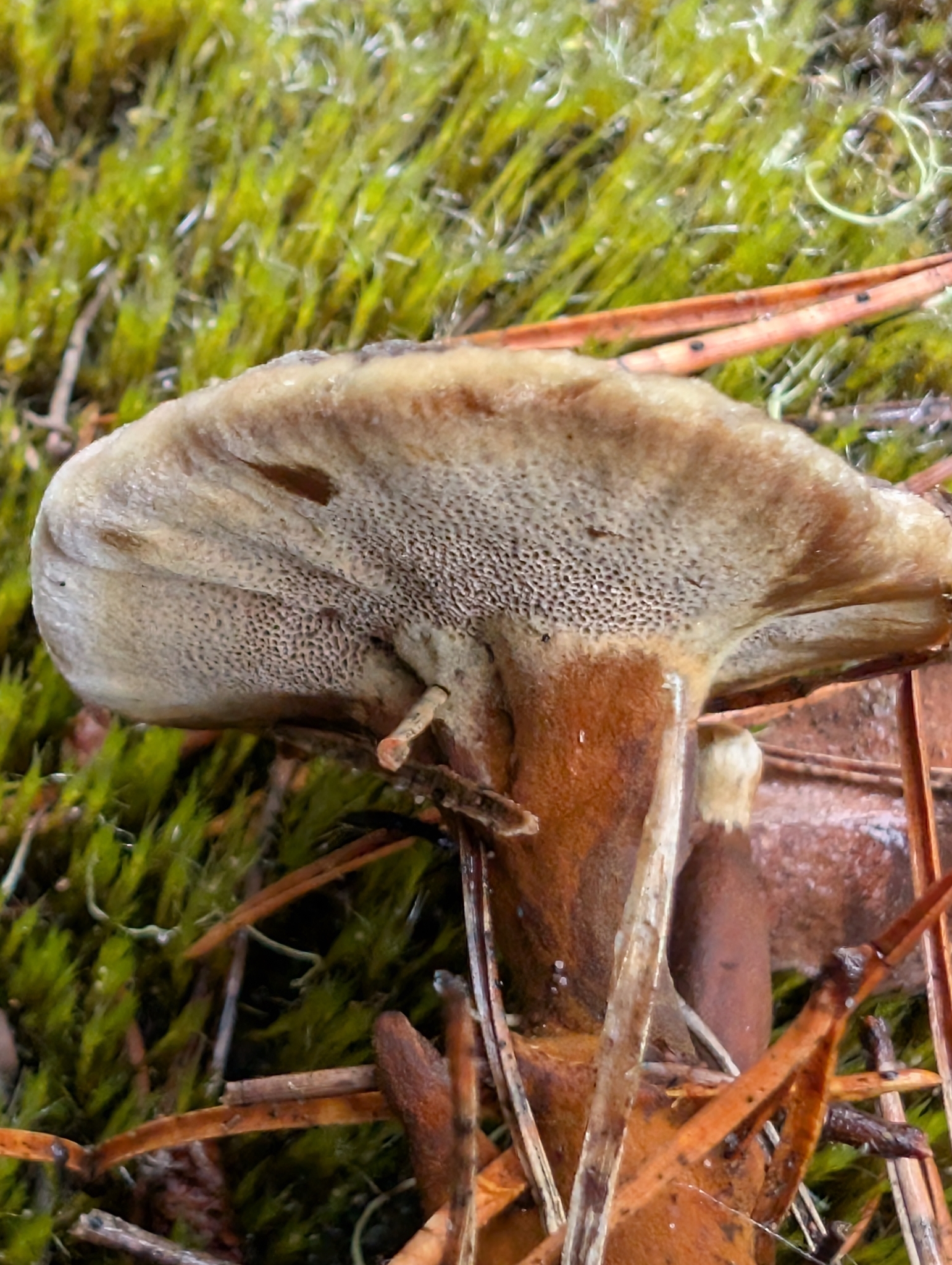 Lamellen: etwas herablaufend, gelbbraun bis graubeige, Poren rundlich bis eckig, ca. 0,25 mm - 1 mm Durchmesser.