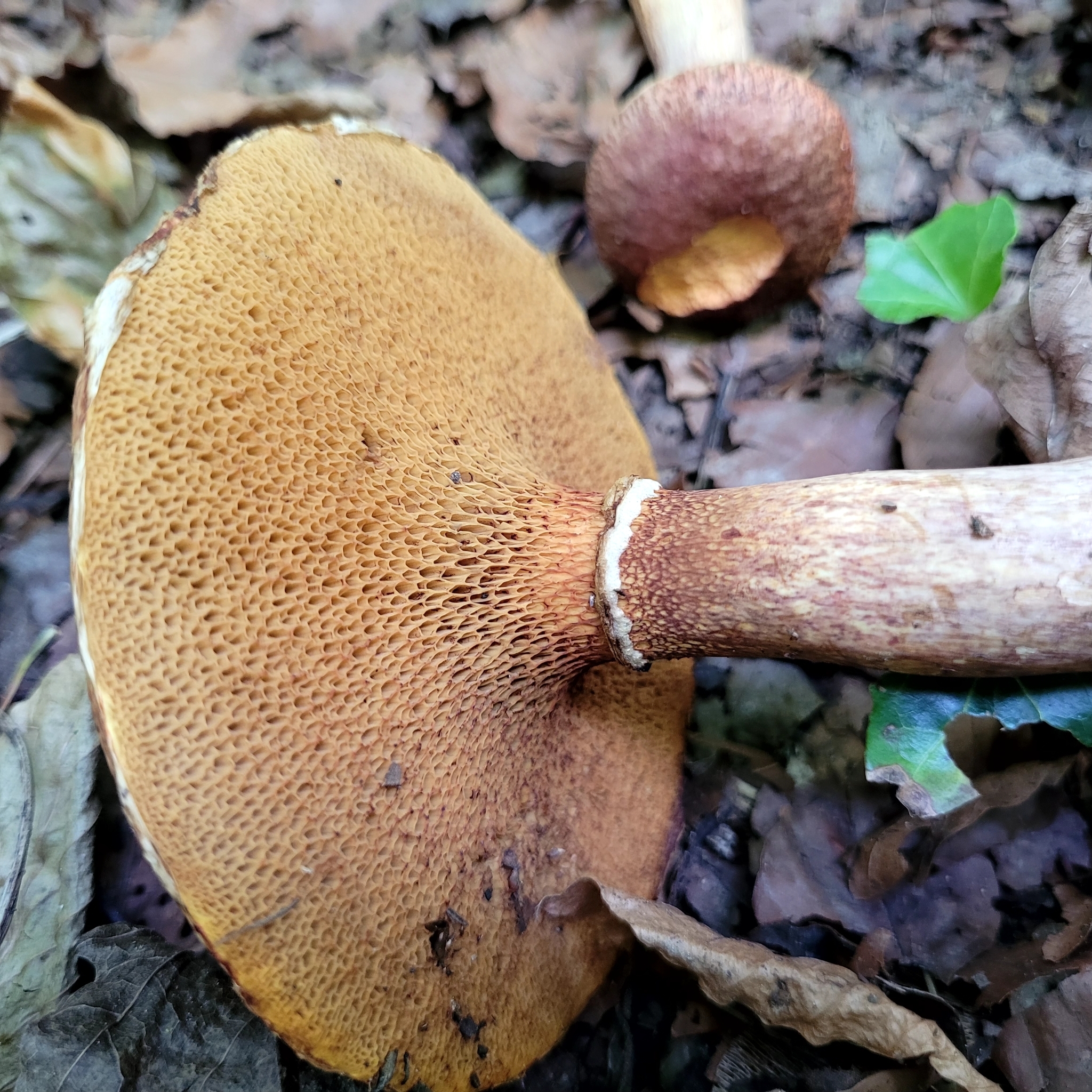 Stiel: orange, rostbraun, marmoriert, jung mit häutig-faserigem Velum, über Ringzone gelblich, darunter orange bis rostbraun, leicht schuppig