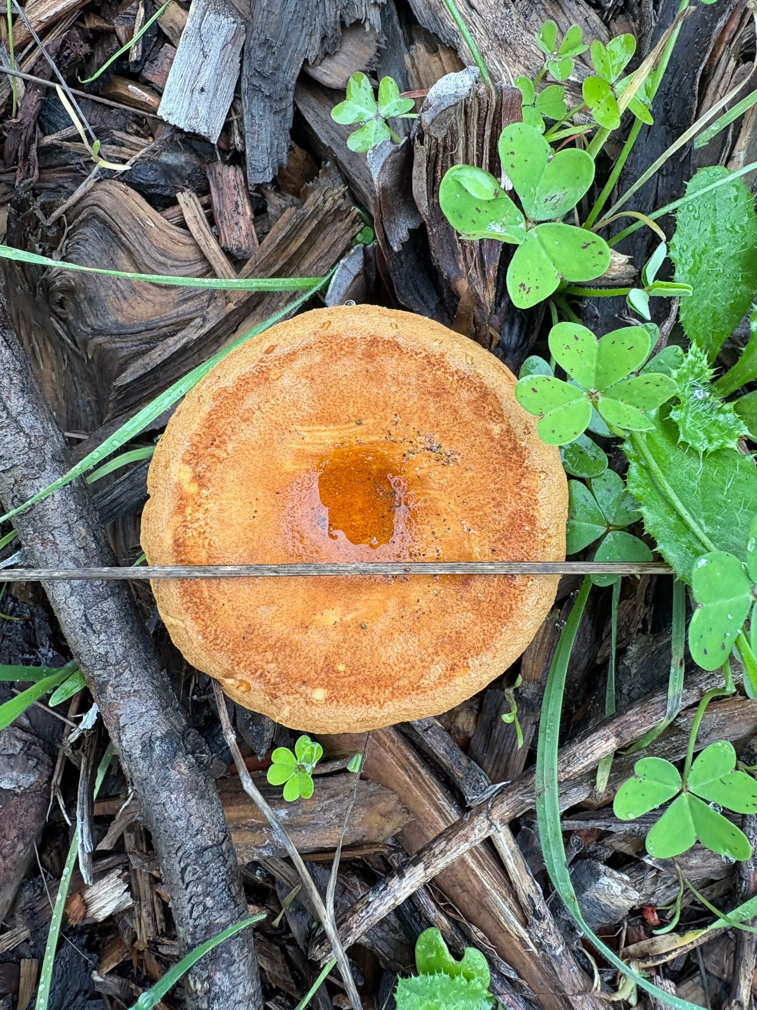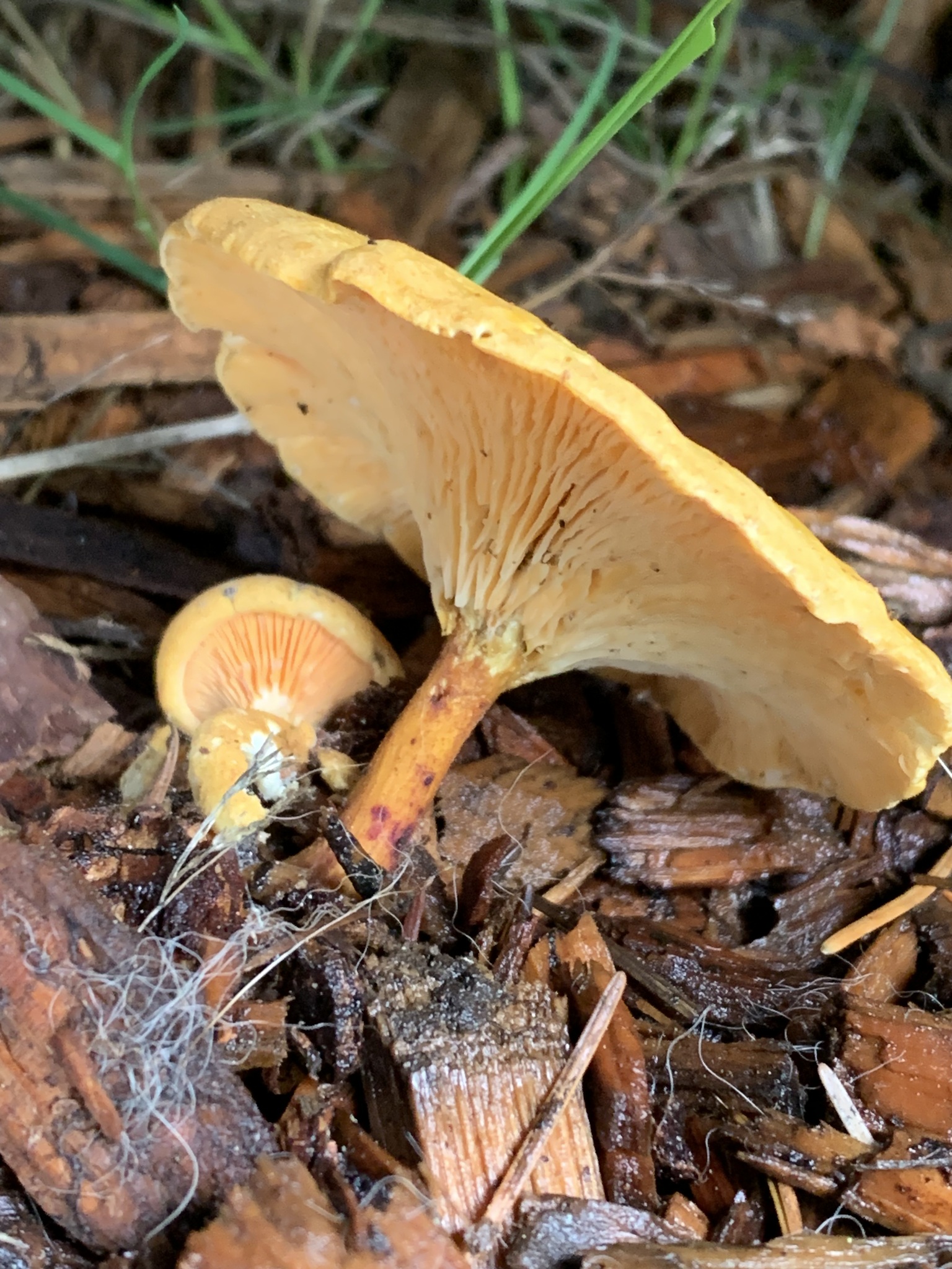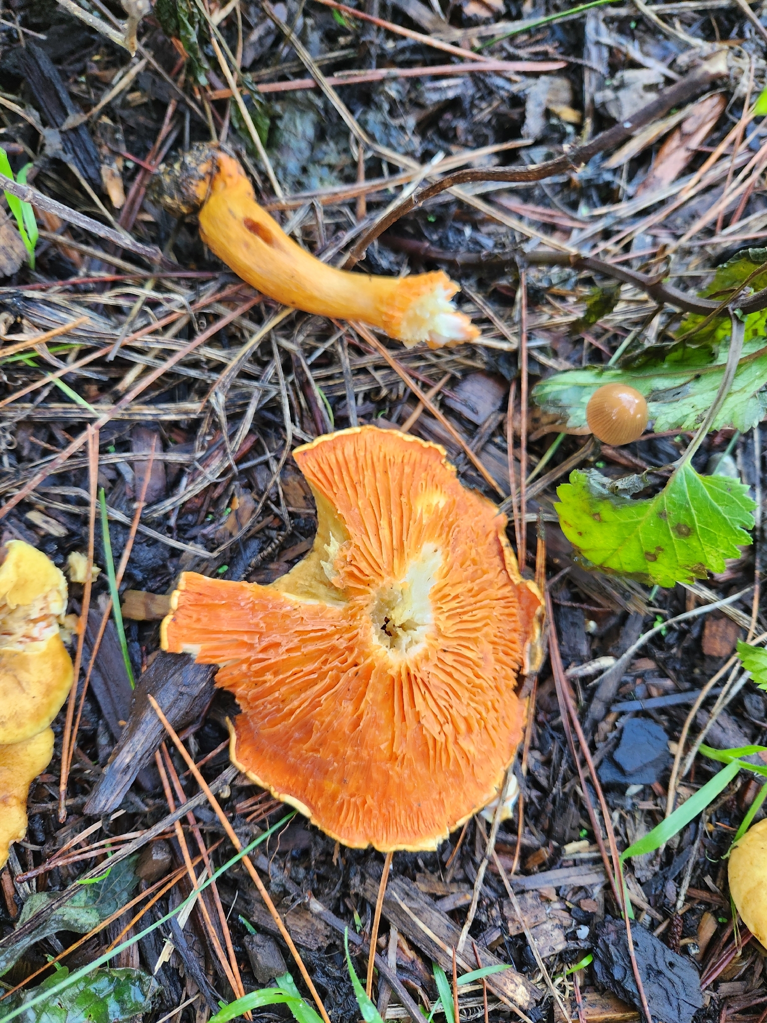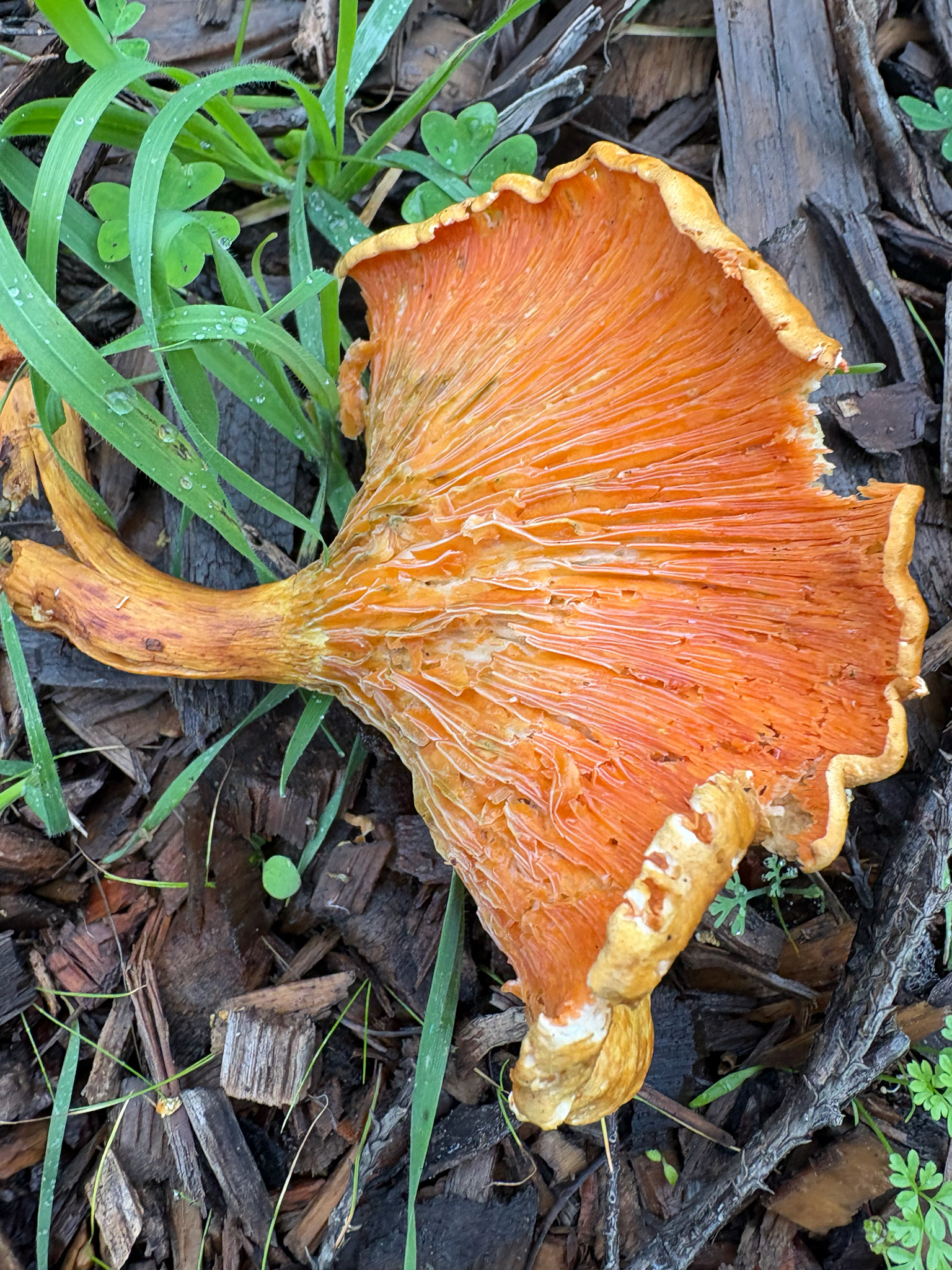 Lamellen: dünn, schmal, dicht, gegabelt, gelborange,etwas herablaufend.