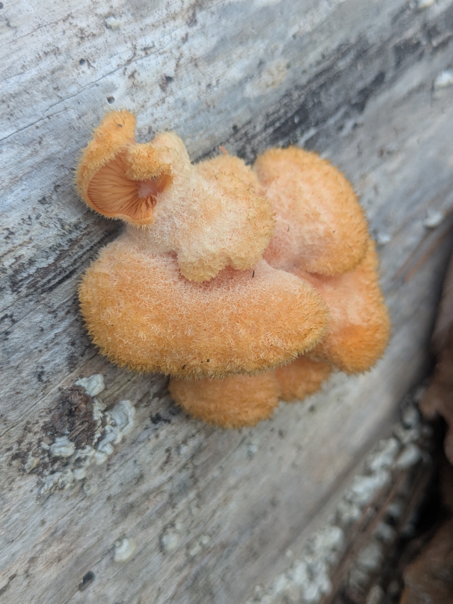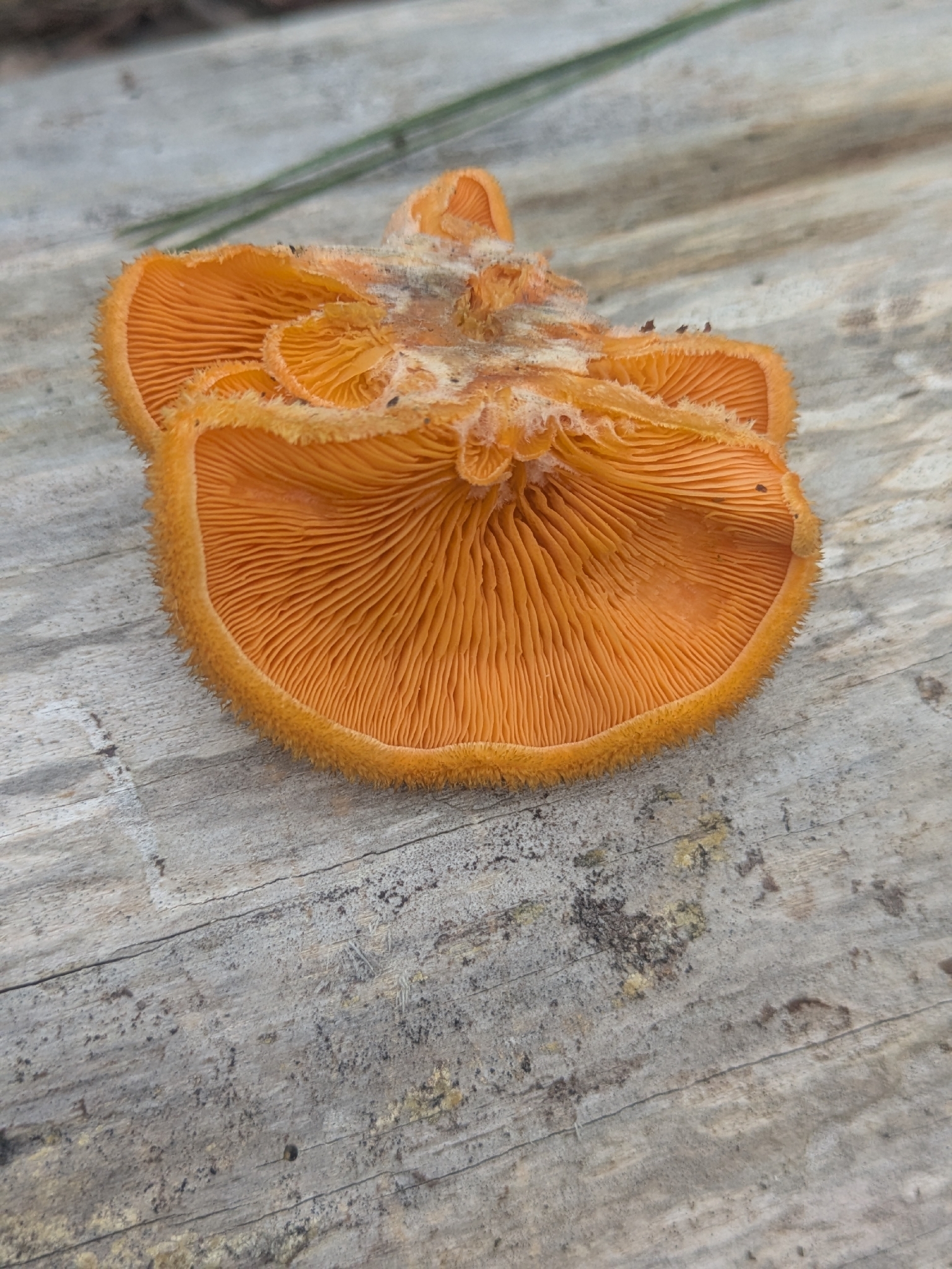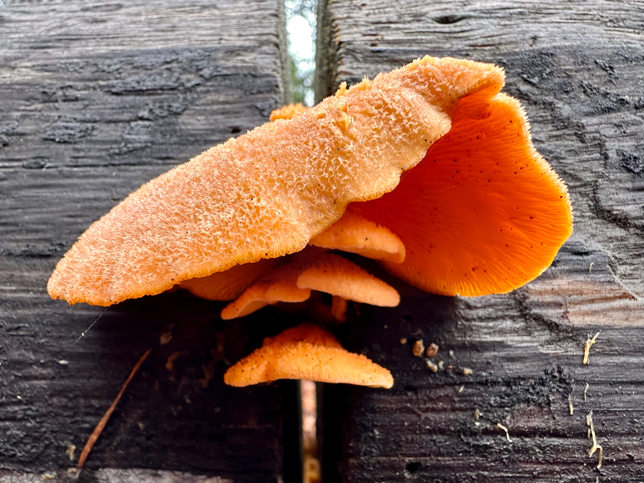 Hut: muschelförmig bis zungenförmig, fast nierenförmig, flach ausgebreitet, direkt aufsitzend, samtig, filzig, weissgelb bis sattorange.