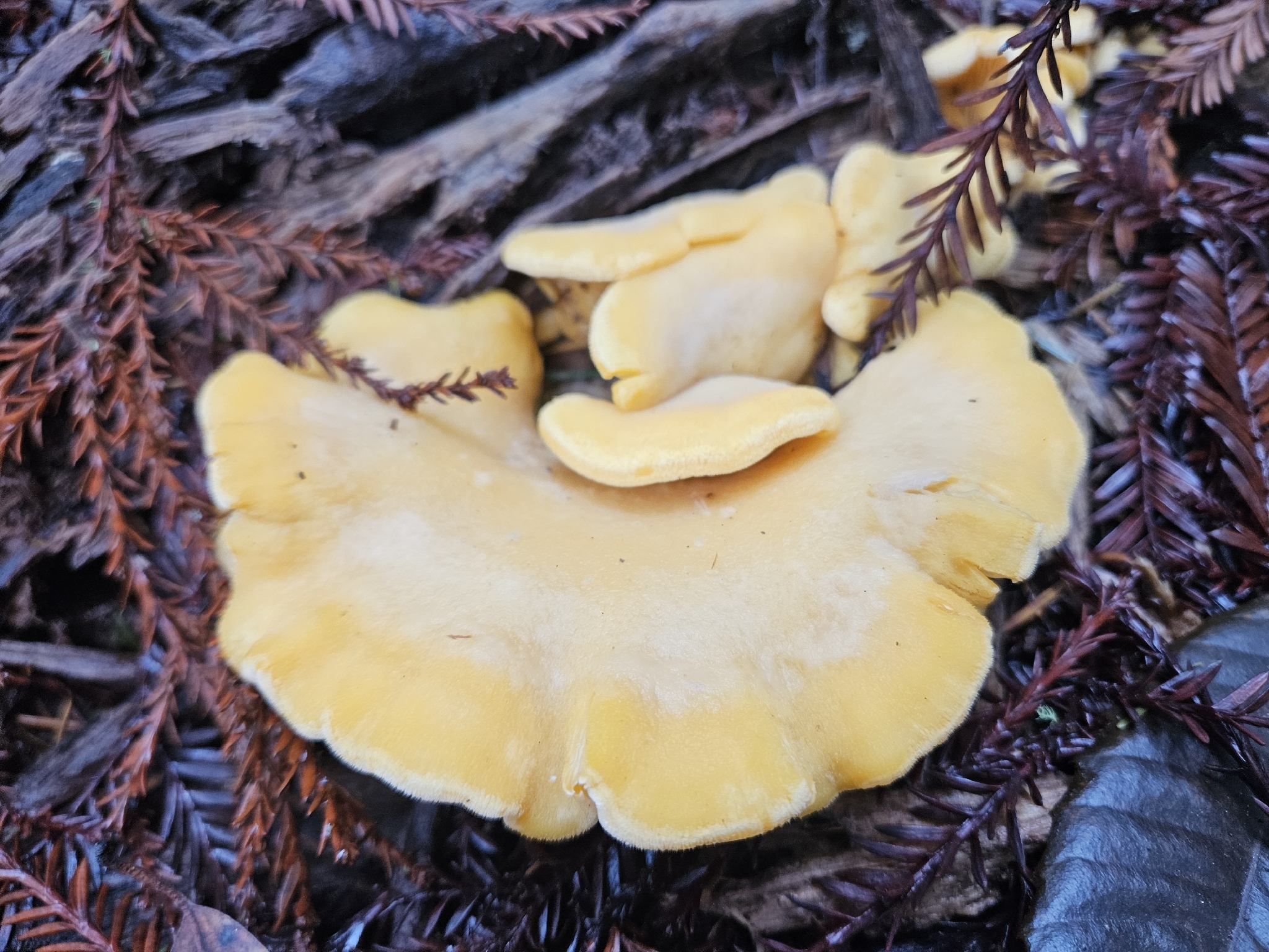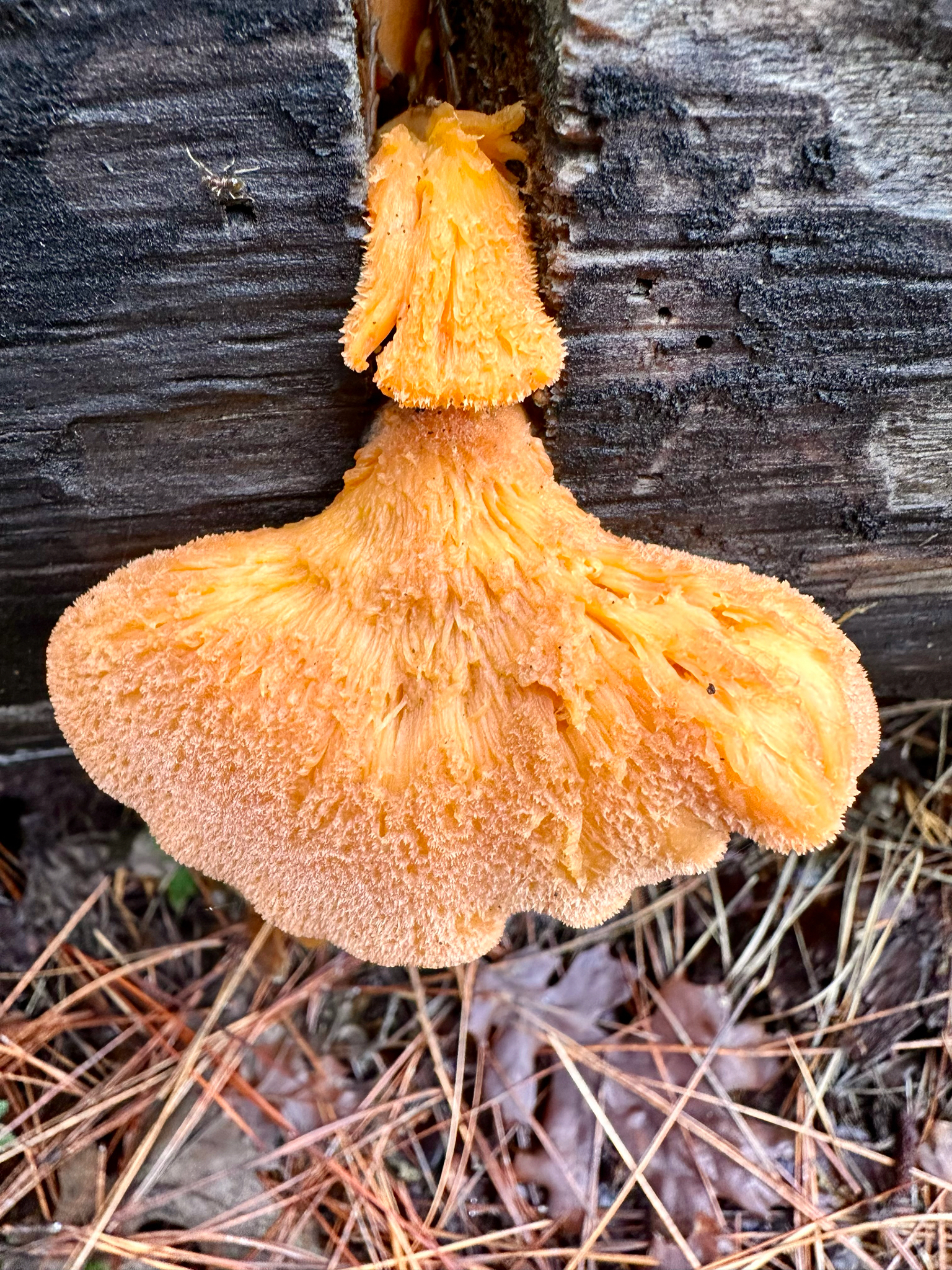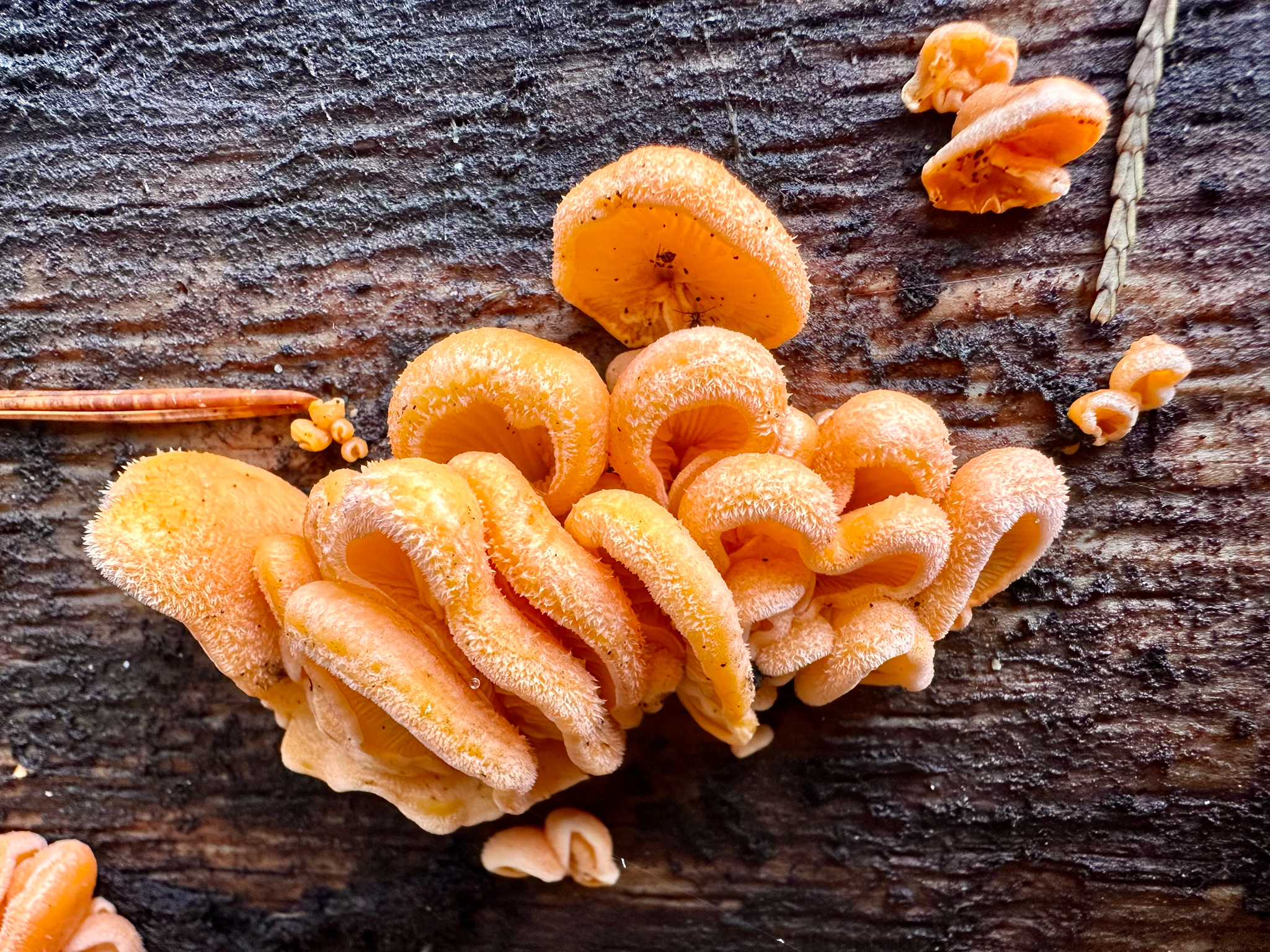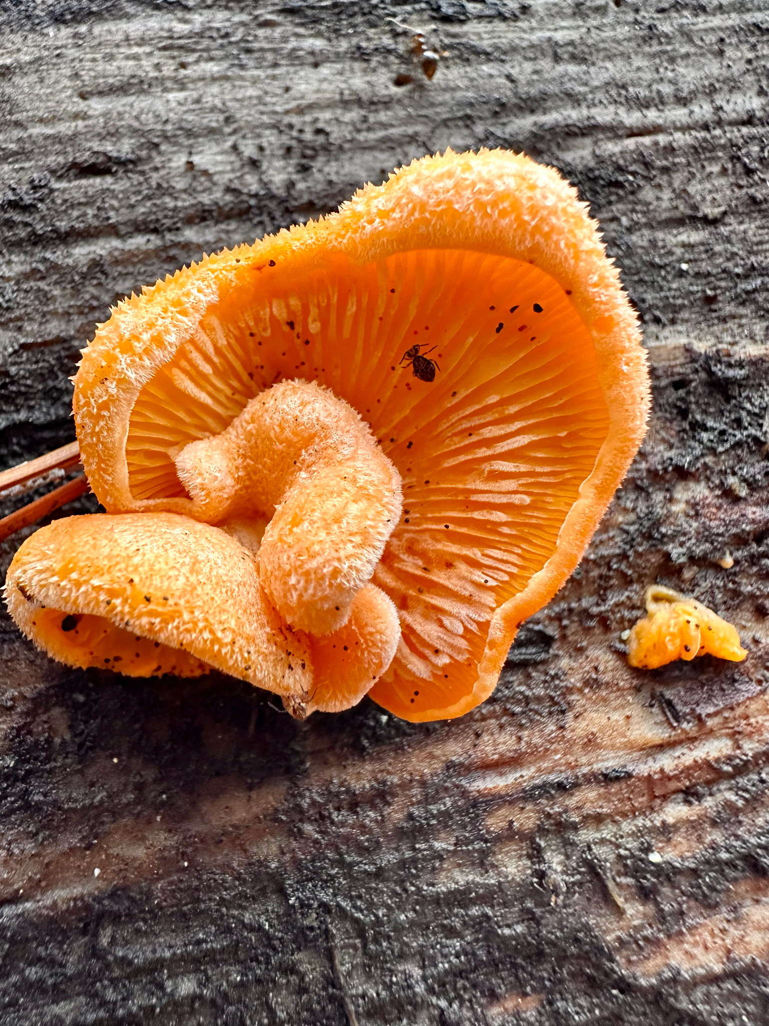 Hut: muschelförmig bis zungenförmig, fast nierenförmig, flach ausgebreitet, direkt aufsitzend, samtig, filzig, weissgelb bis sattorange.
