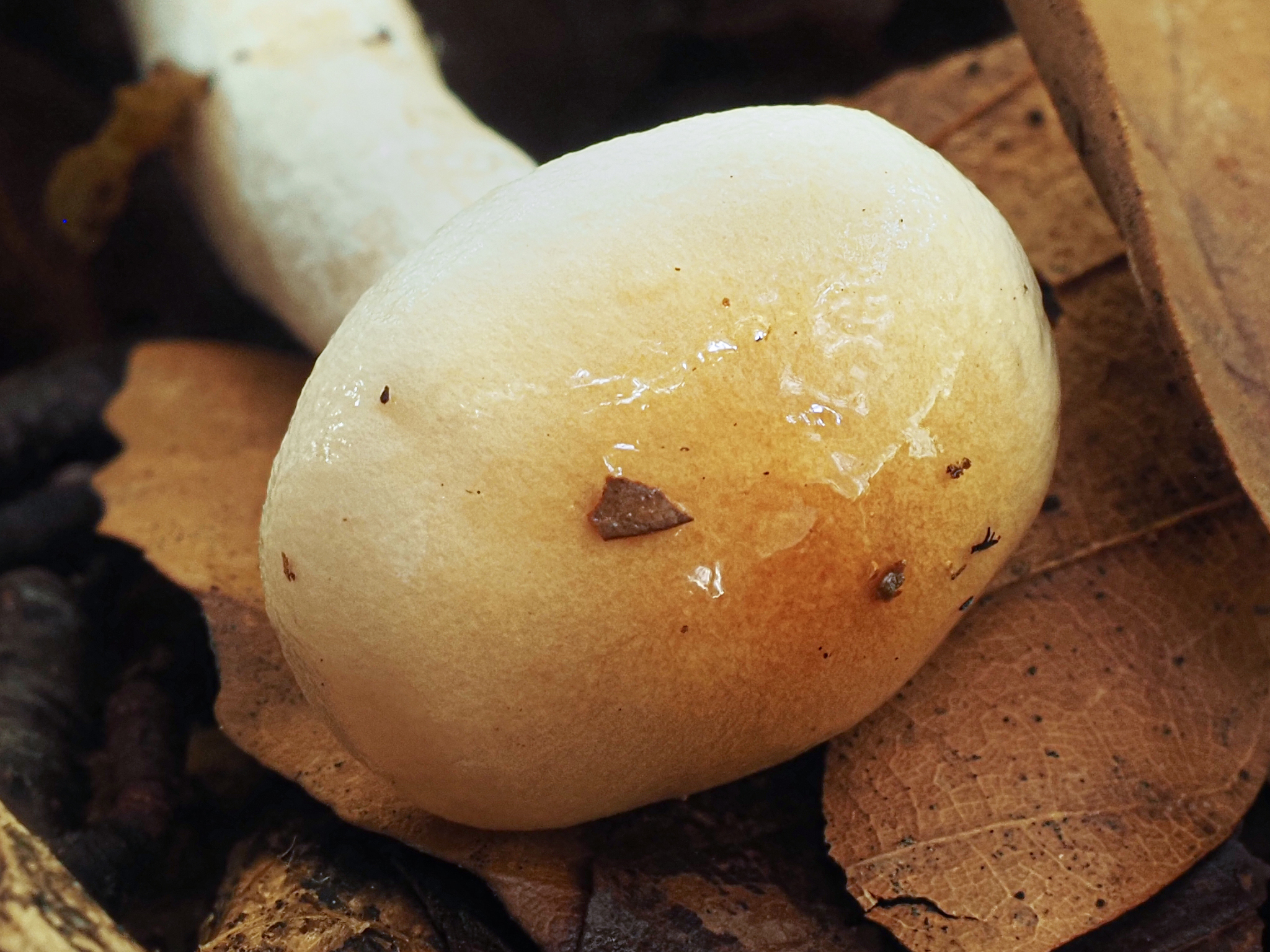 Hut: jung halbkugelig, später flach gewölbt, alt ausgebreitet, Mitte mehr rötlich orangebräunlich, Rand weisslich und lange heruntergeboten, feucht schleimig, fein radialfaserig.