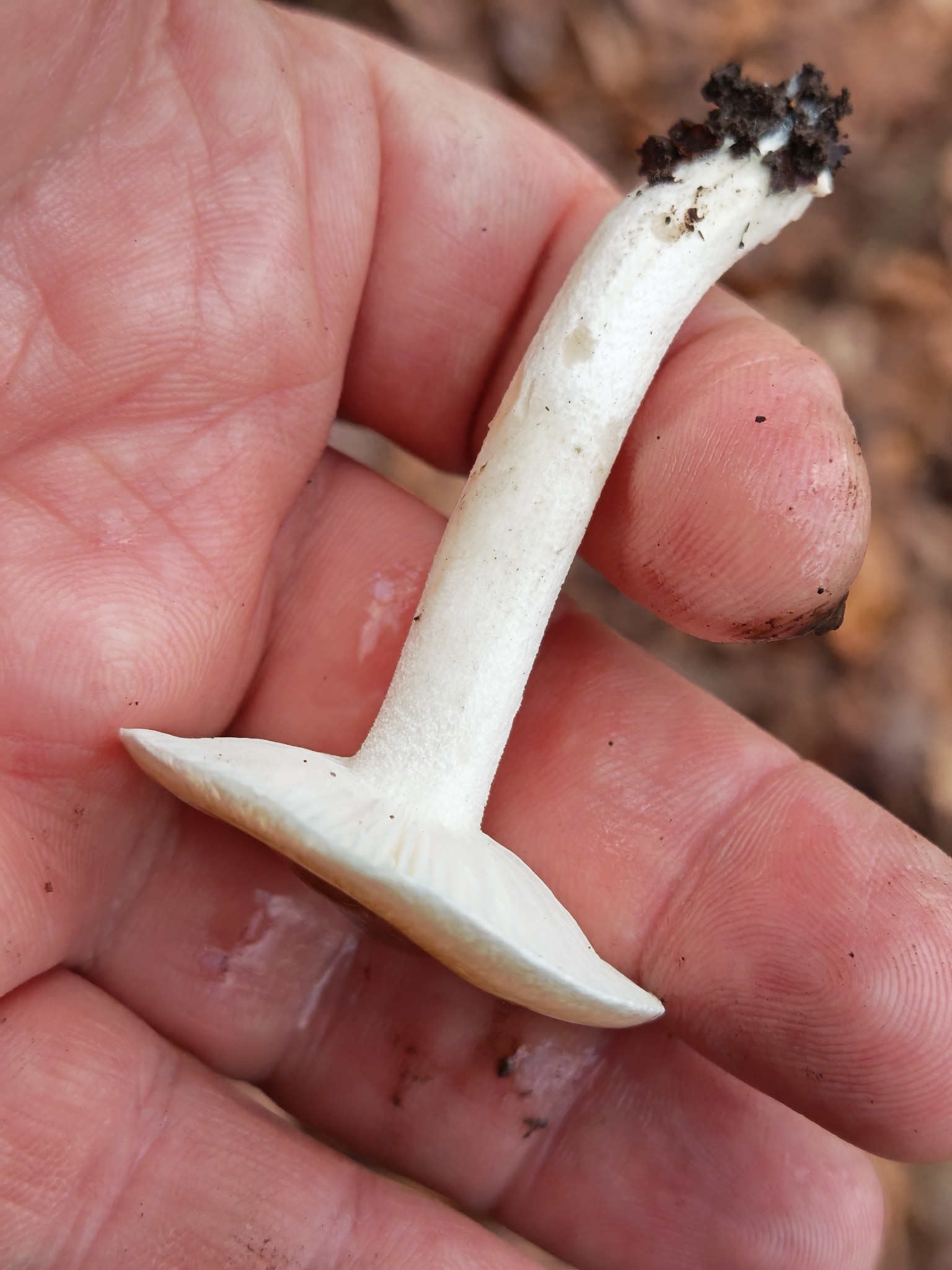 Stiel: voll, zylindrisch, weiss, trocken, Spitze mit weisslichen Körnchen mehlig bestäubt.
