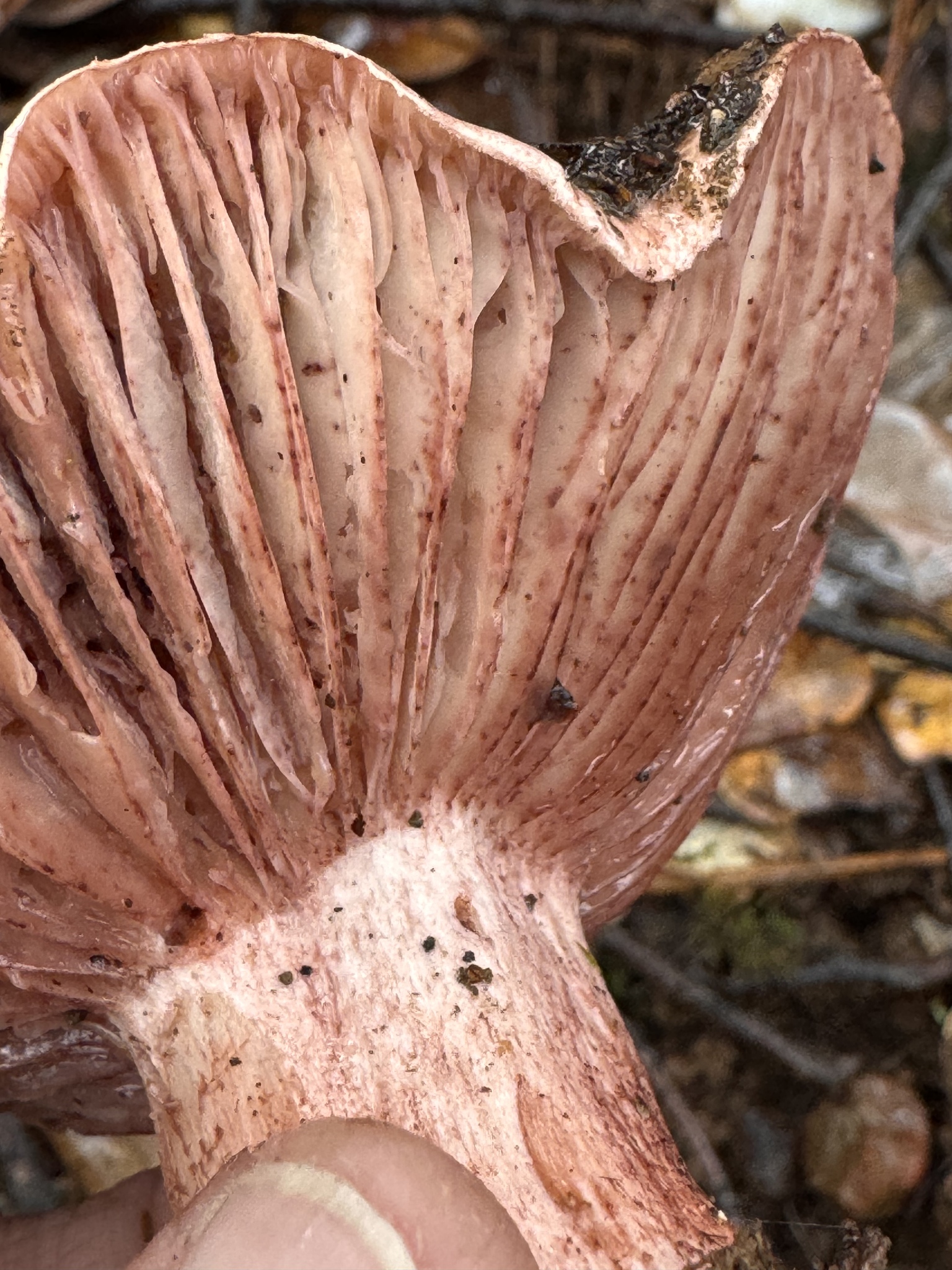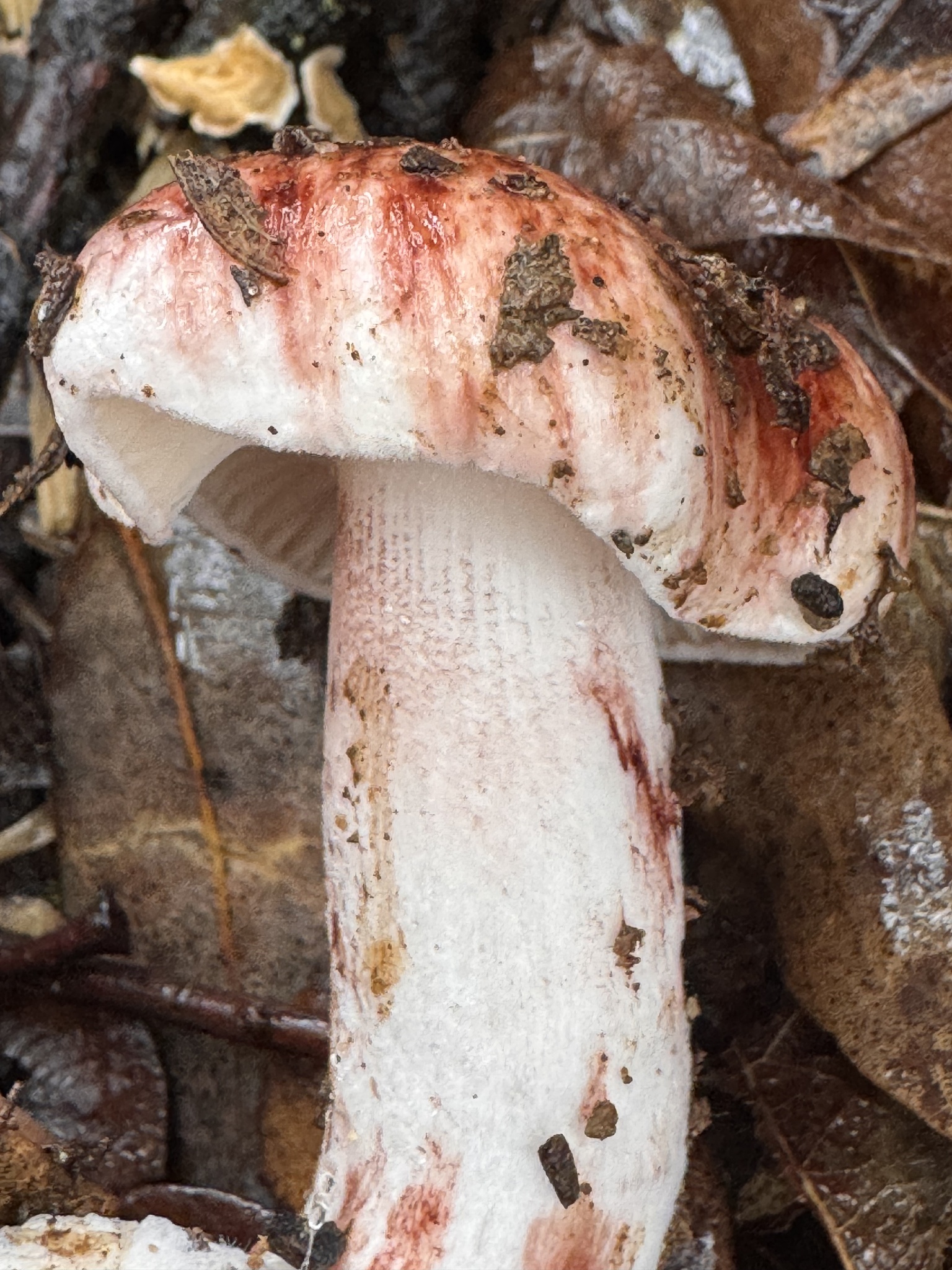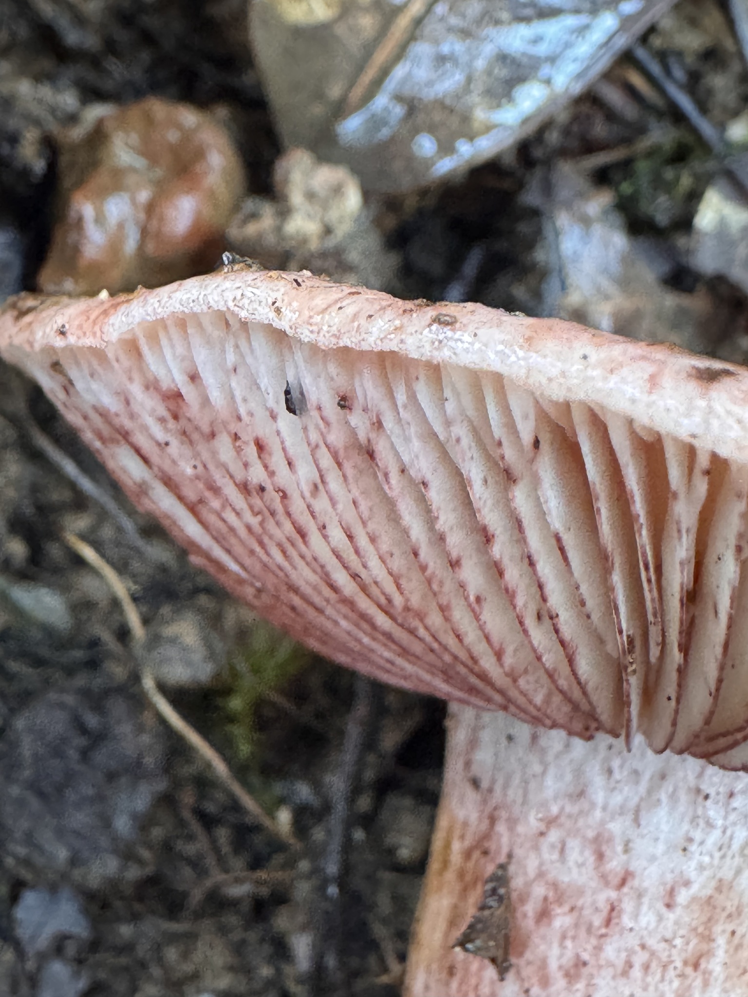 Lamellen: erst weiss, bald stark rotfleckig, breit angewachsen, kaum herablaufend, u.U. etwas ausgebuchtet, weich, wachsartig