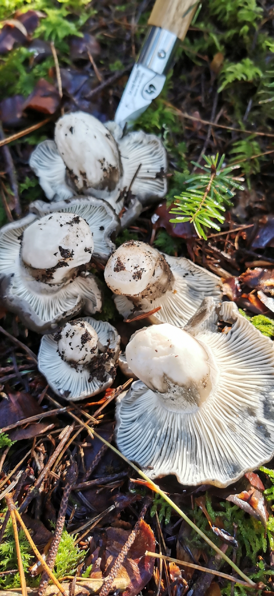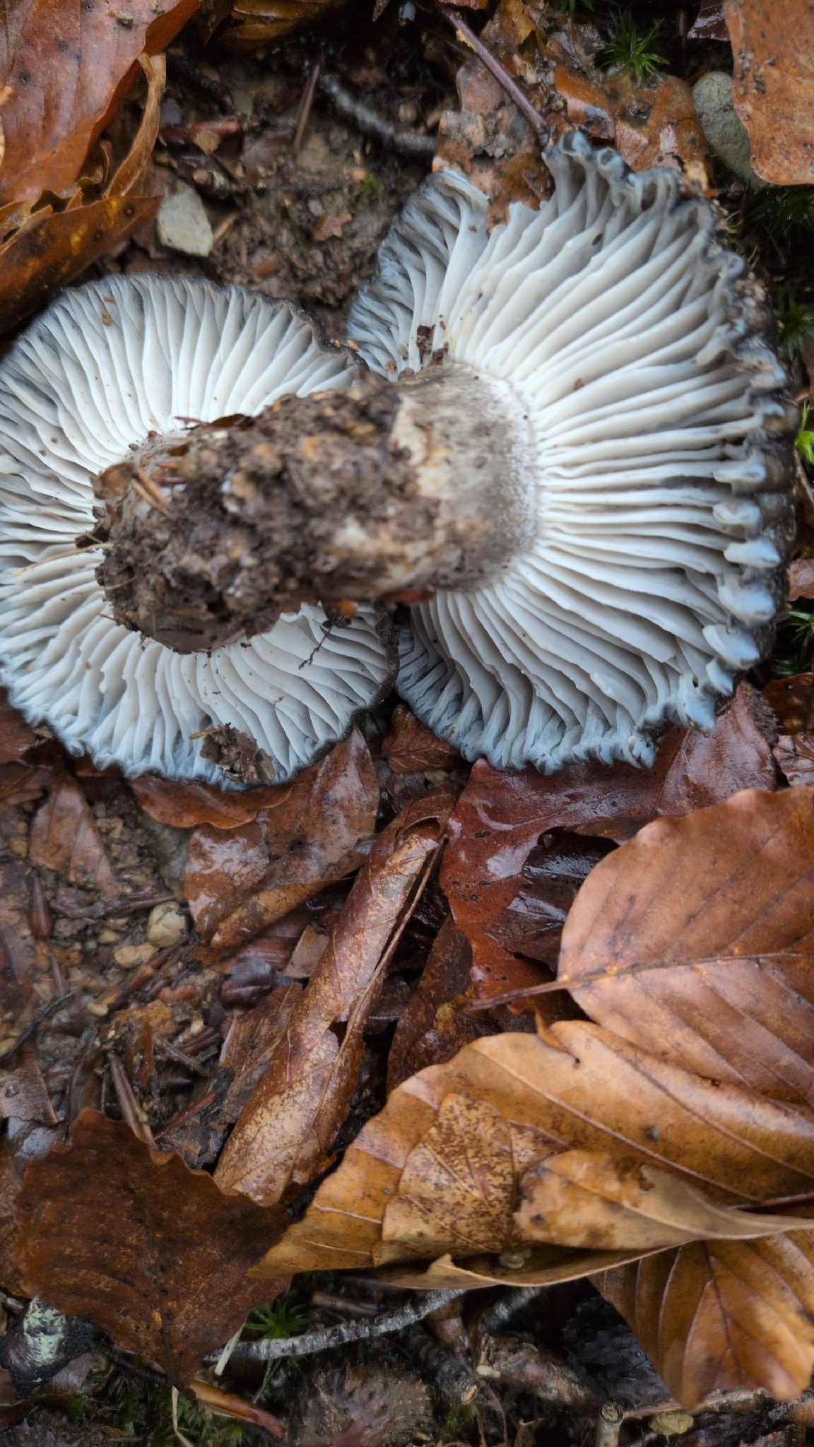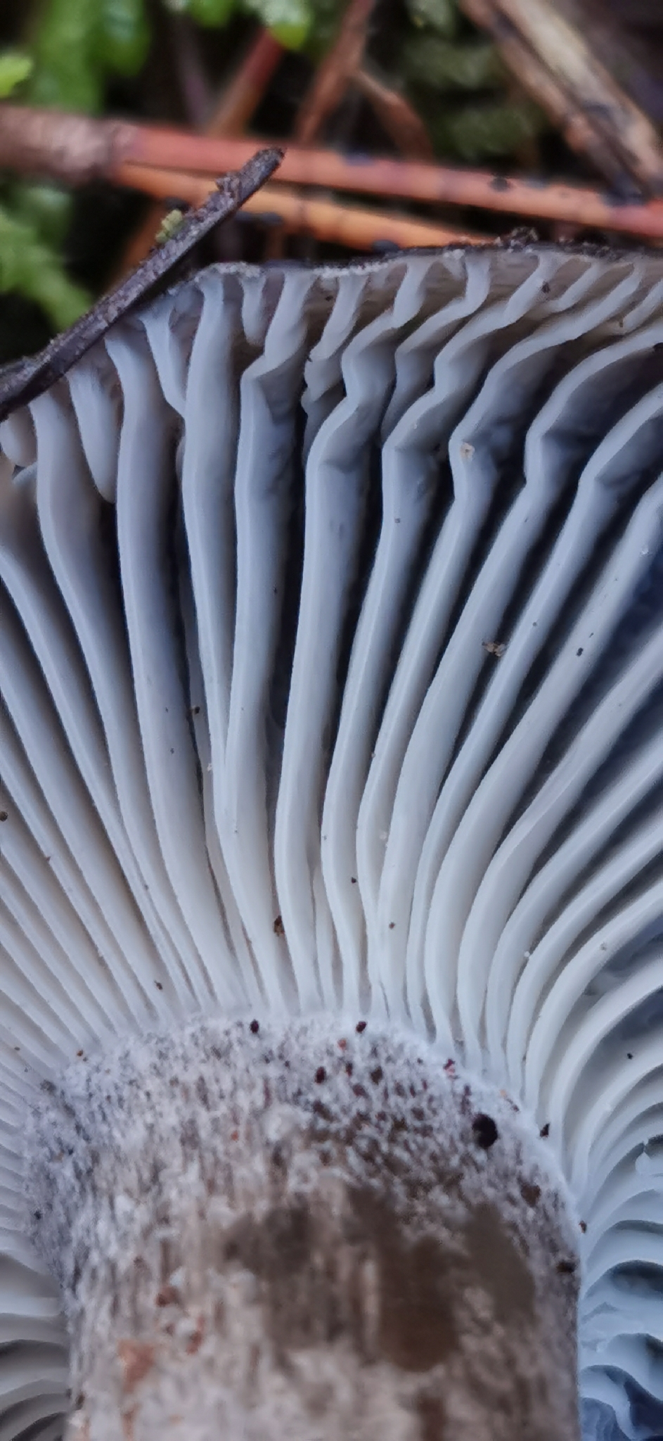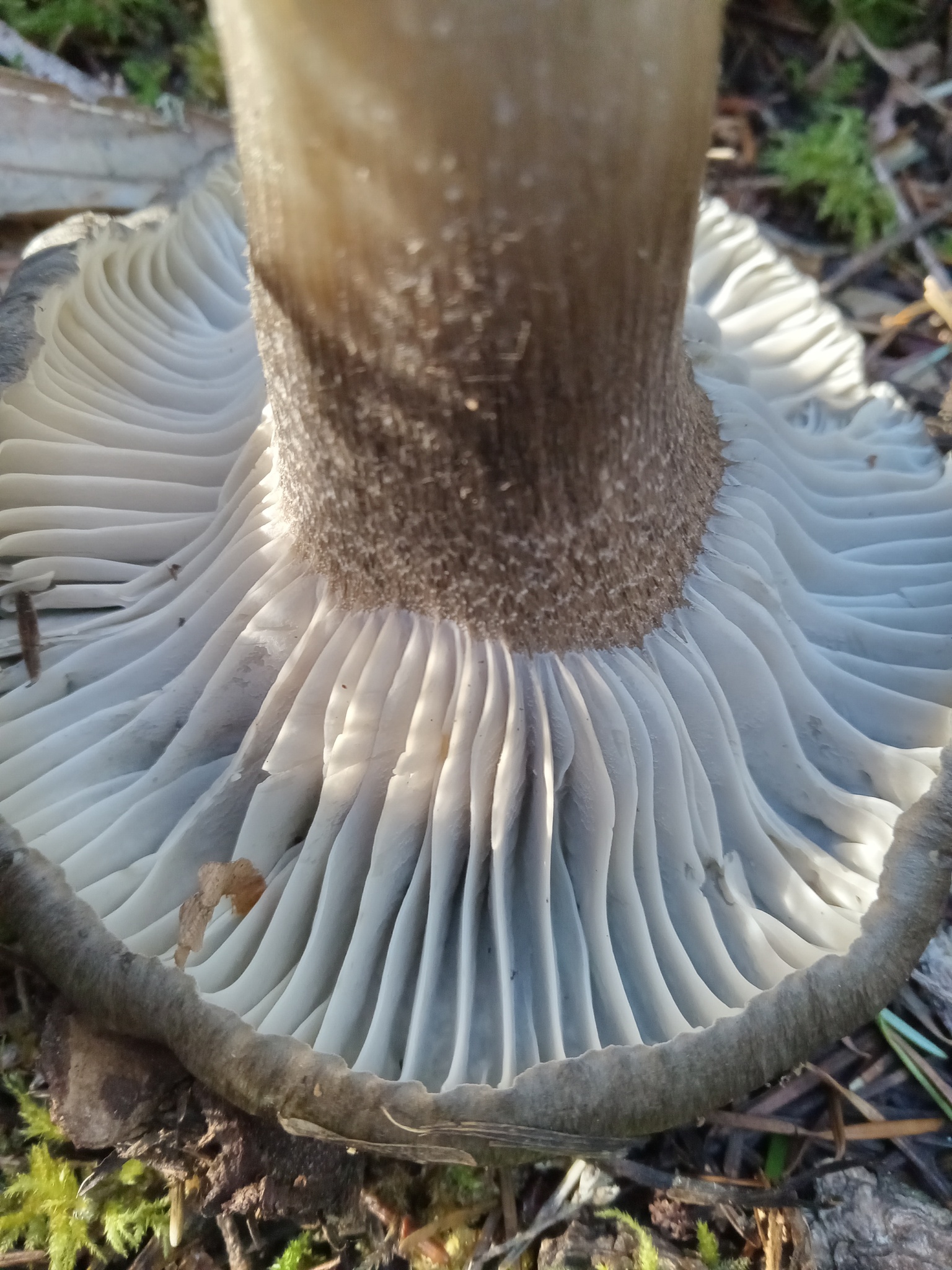 Lamellen: entfernt, breit, weiss bis grau und nicht weiter verändernd, mit Zwischenlamellen, breit angewachsen bis etwas herablaufend.