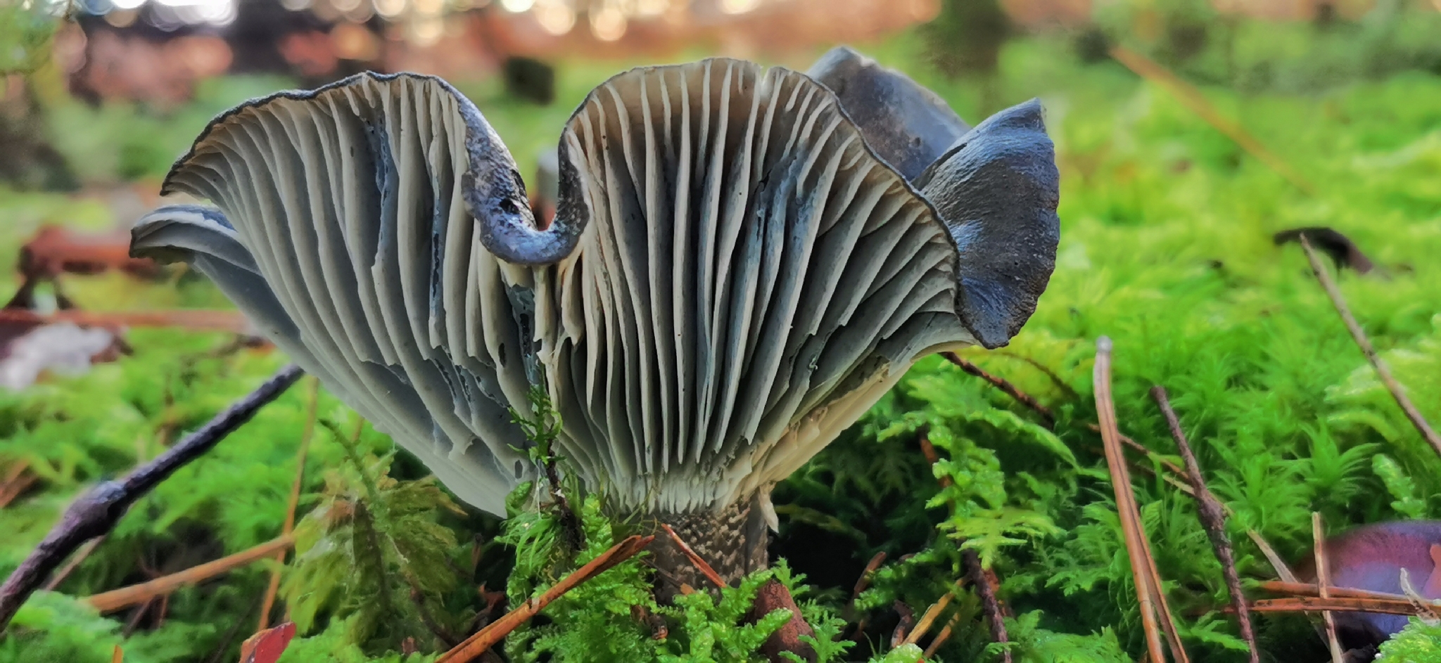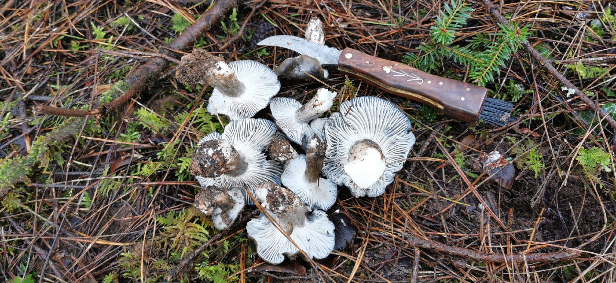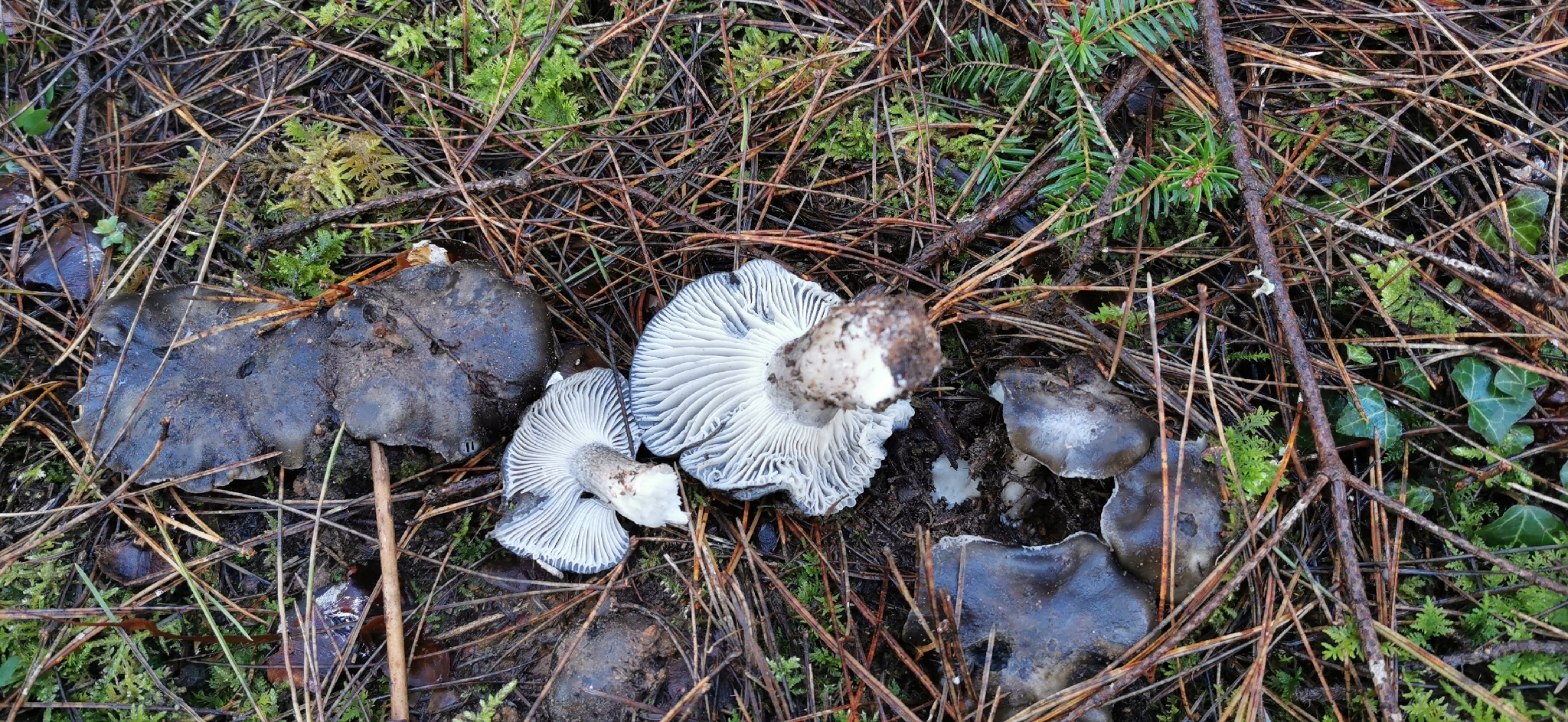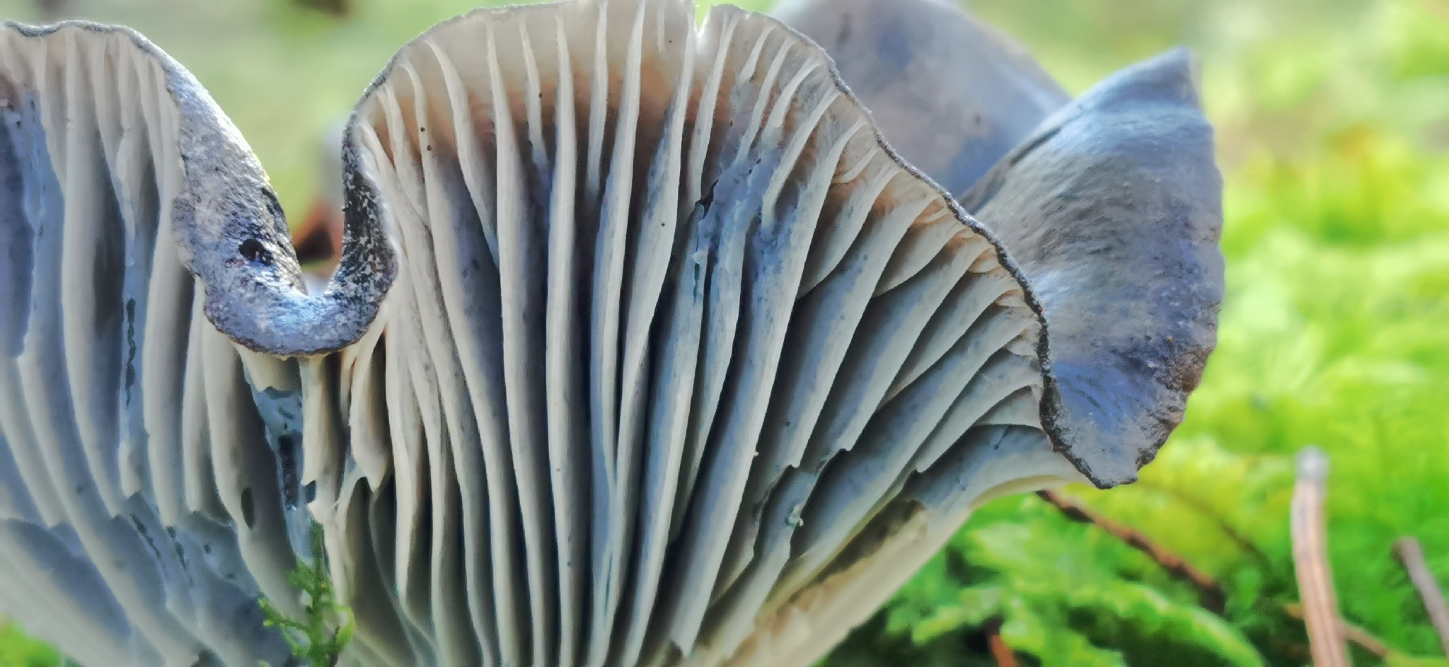 Lamellen: entfernt, breit, weiss bis grau und nicht weiter verändernd, mit Zwischenlamellen, breit angewachsen bis etwas herablaufend.