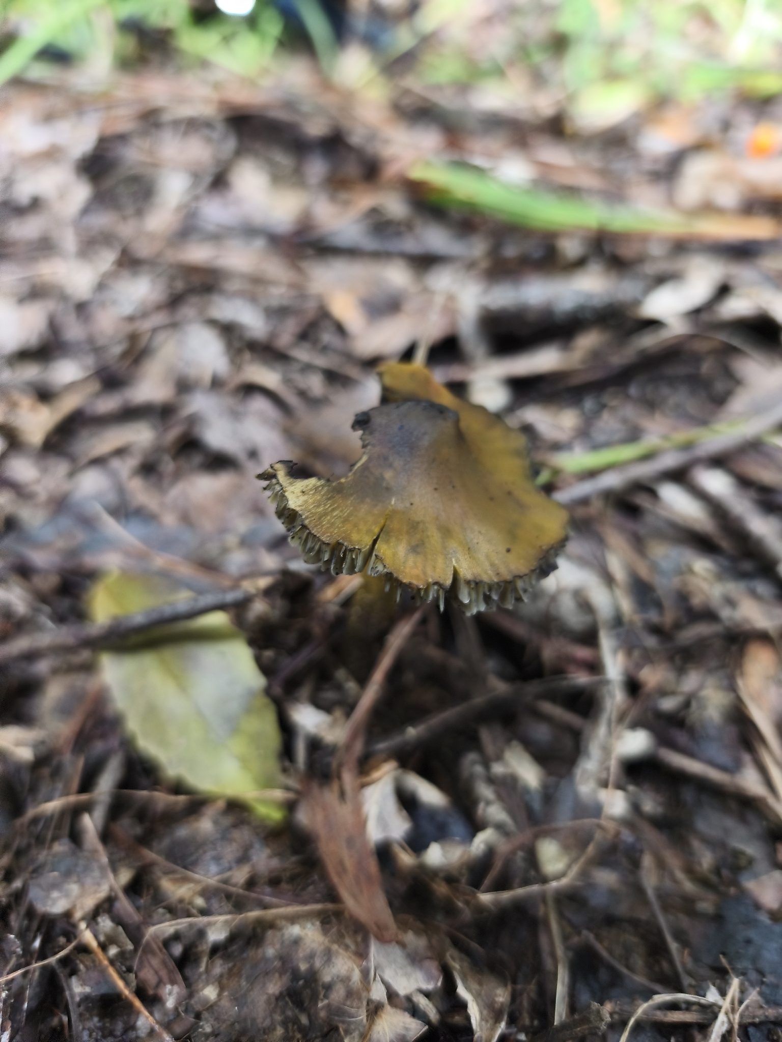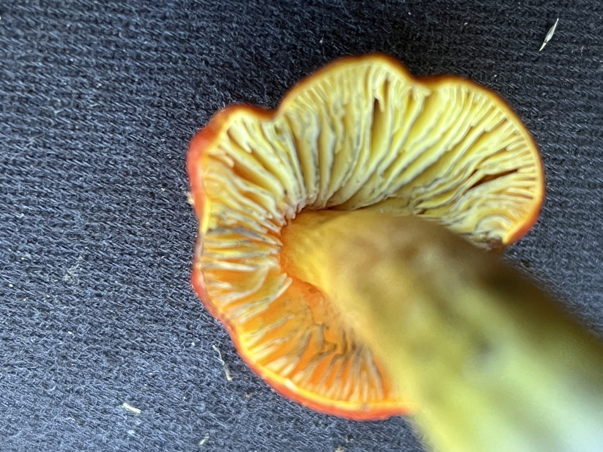 Lamellen: gelb bis orange, bald grau, alt schwarz, fast nicht am Stiel angewachsen, dick, breit, weich, wächsern