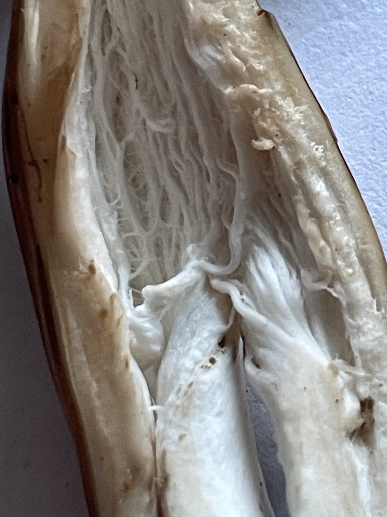 Lamellen: blass ocker, später bräunend, Druckstellen rötend, entfernt mit Zwischenlamelle