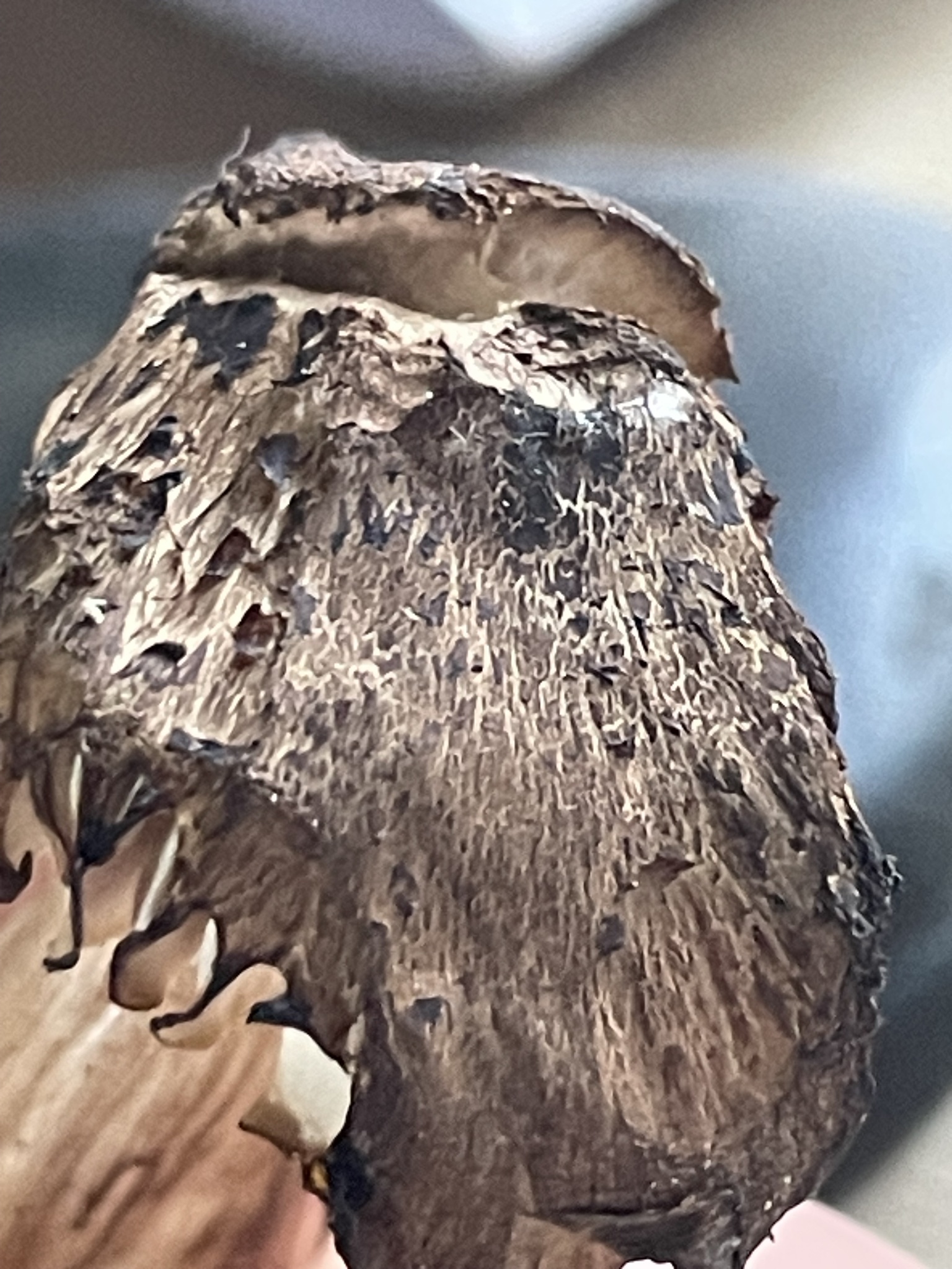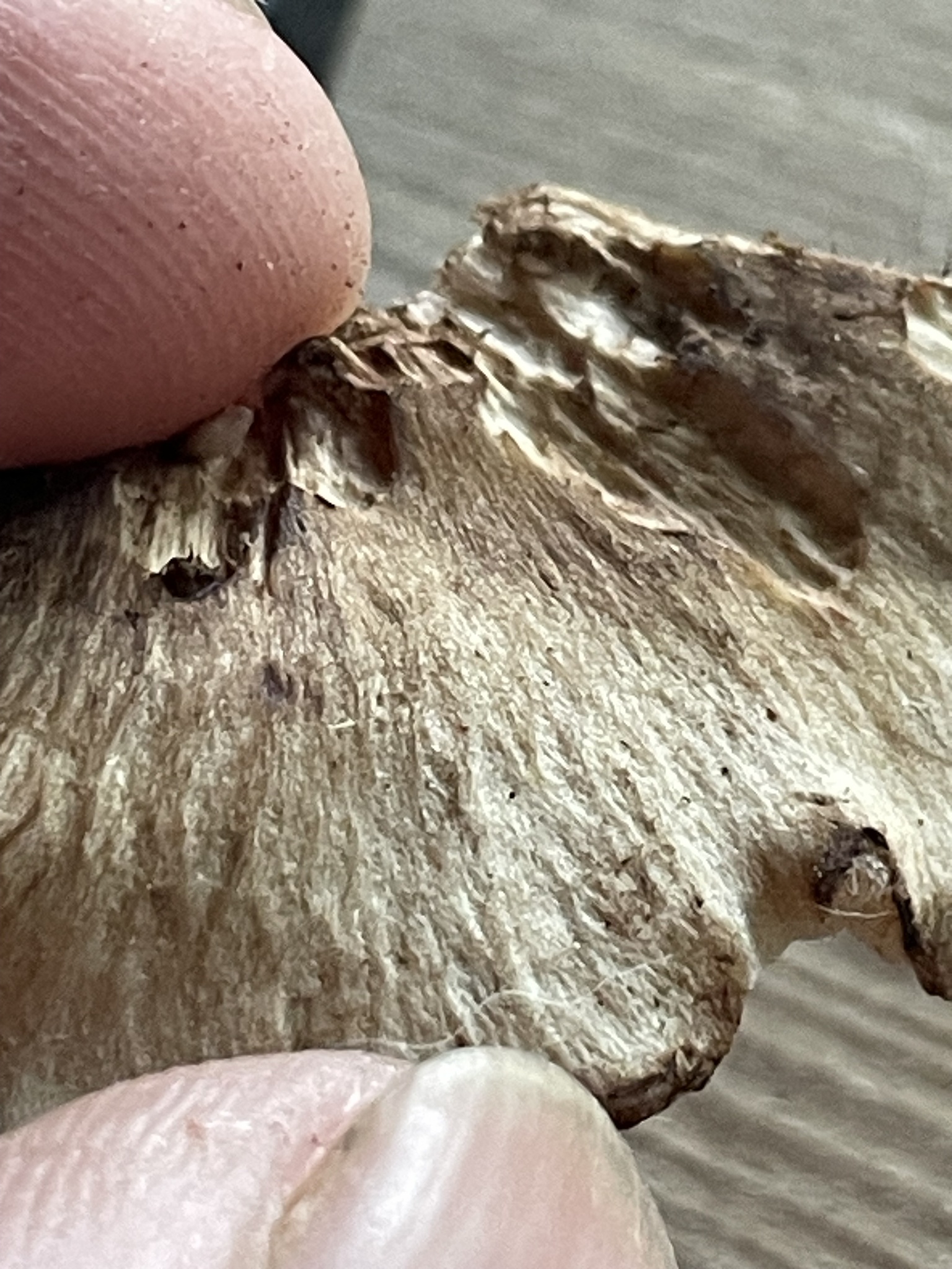 Hut: jung konvex, später flacher, graubraun bis rötlichbraun, trocken, faserig bis feinschuppig, Druckstellen rötend, Hut oft gewellt