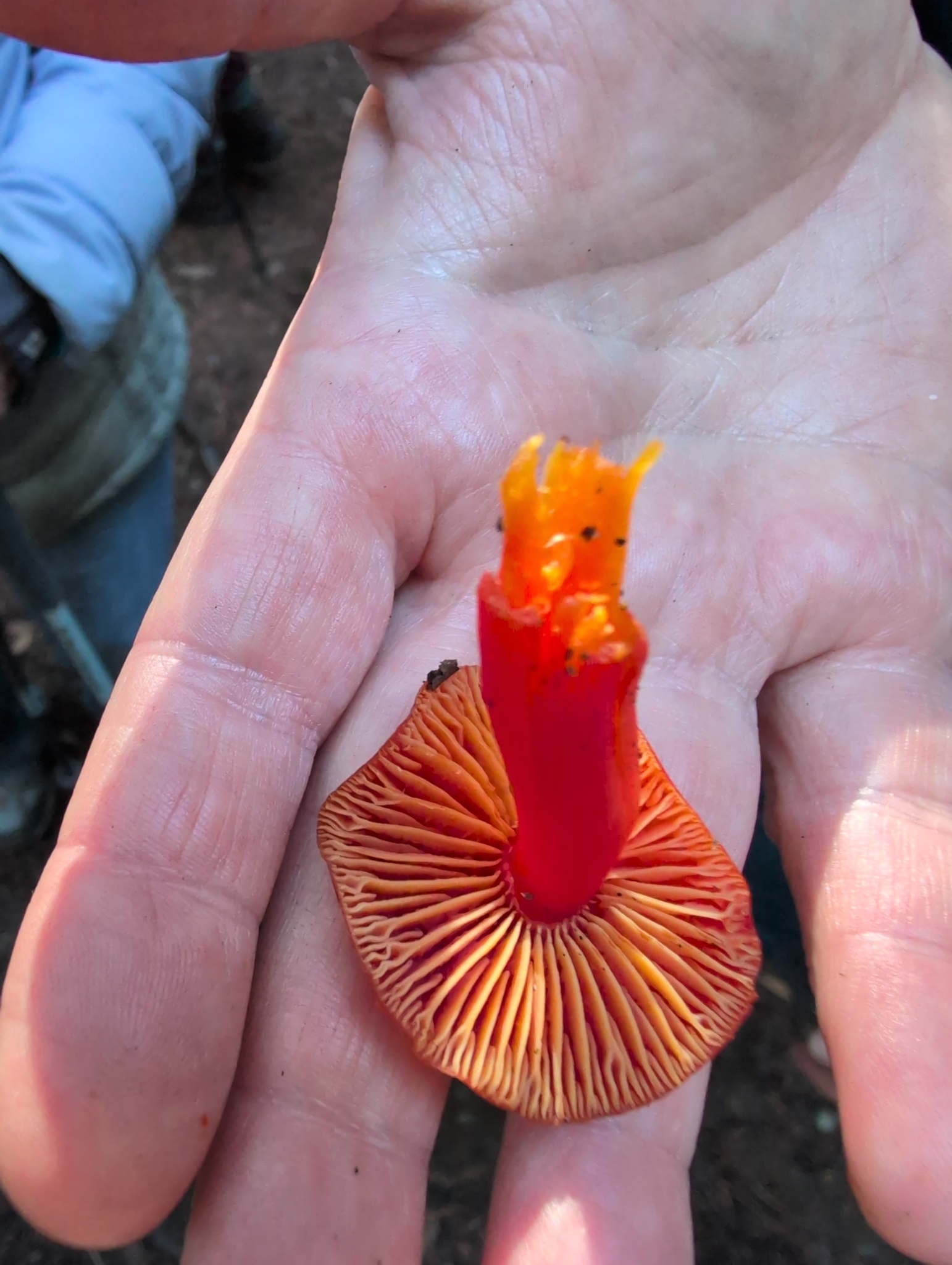 Lamellen: dick, weich, wachsartig, rotorange, später gelborange, Schneiden gelb, ausgebuchtet und breit angewachsen, oft mit Zahn herablaufend.