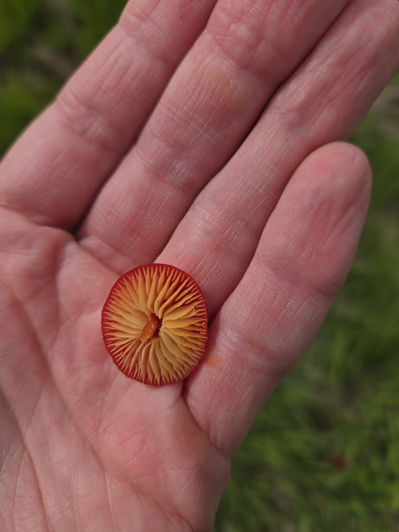 Hut 0.5—2 cm im Durchmesser, gewölbt; leuchtend scharlachrot.Stiel 20—50x2—5 mm; farblich wie der Hut oder etwas oranger; glatt und glänzend.Fleisch orange-rot; dünn; Geschmack und Geruch nicht charakteristisch.Lamellen angewachsen; gelb bis purpurrot oder orange-rot mit blasser gelber Kante.Sporen 7.5—10x5—6µ, ellipsoid bis eiförmig.Sporenabdruck weiß.