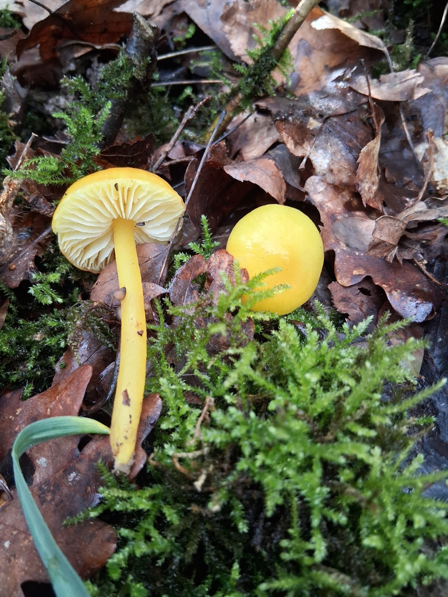 Hut: jung konvex, dann flach ausgebreitet, schleimig-klebrig, zitronengelb bis dottergelb, Zentrum manchmal mehr orangegelb, Rand evtl. ganz leicht grünlich, evtl. etwas durchscheinend gerieft.