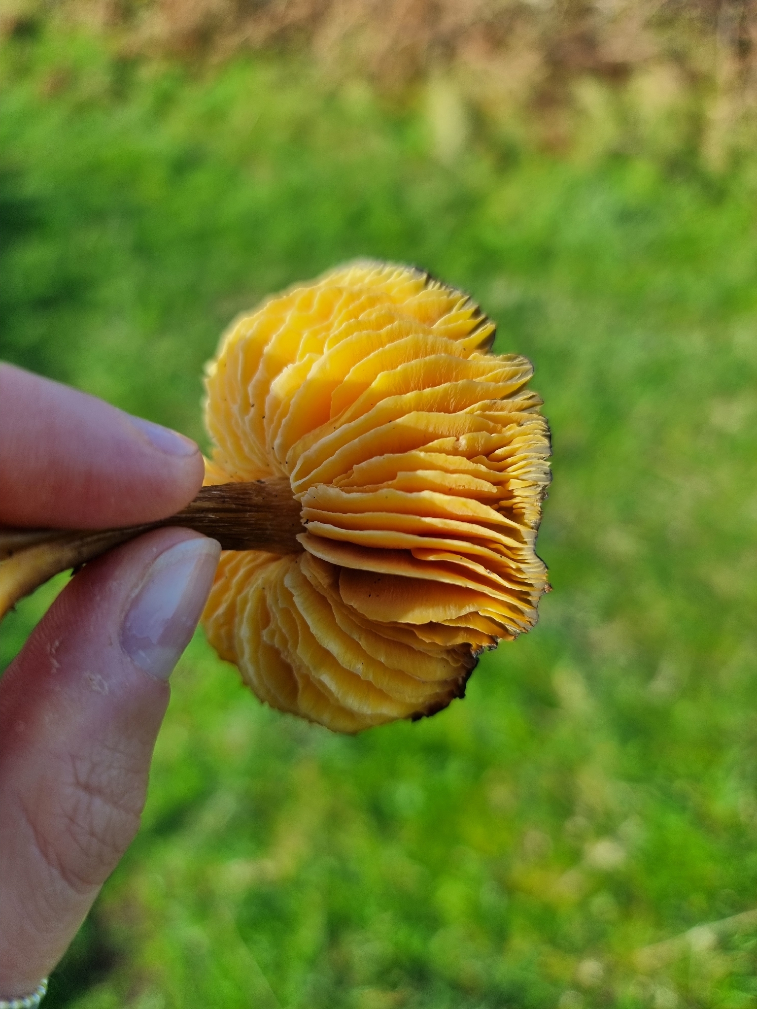 Lamellen: blassgelb, zitronengelb, entfernt stehend, ziemlich dick, schmal angeheftet bis fast nicht am Stiel angewachsen