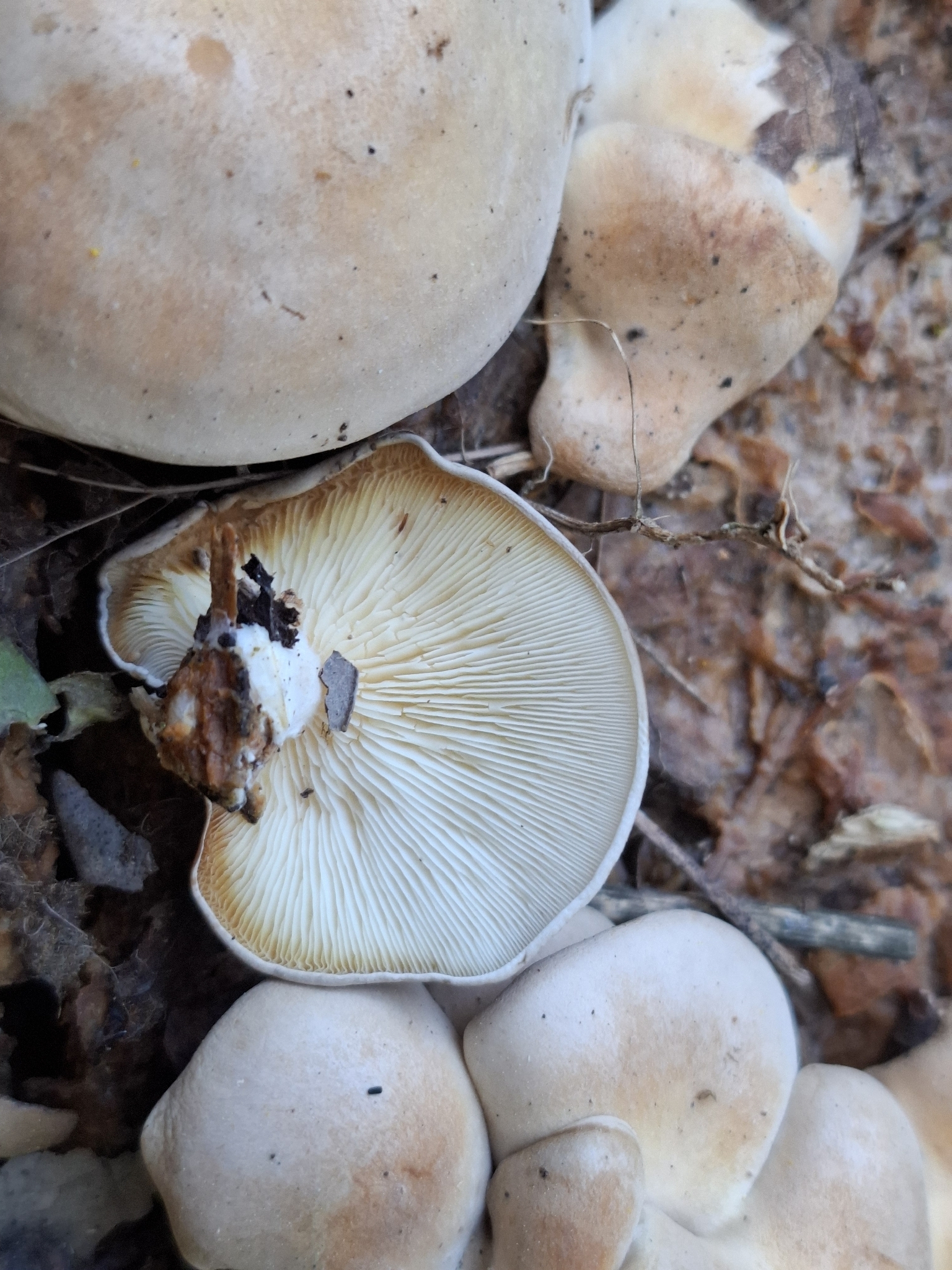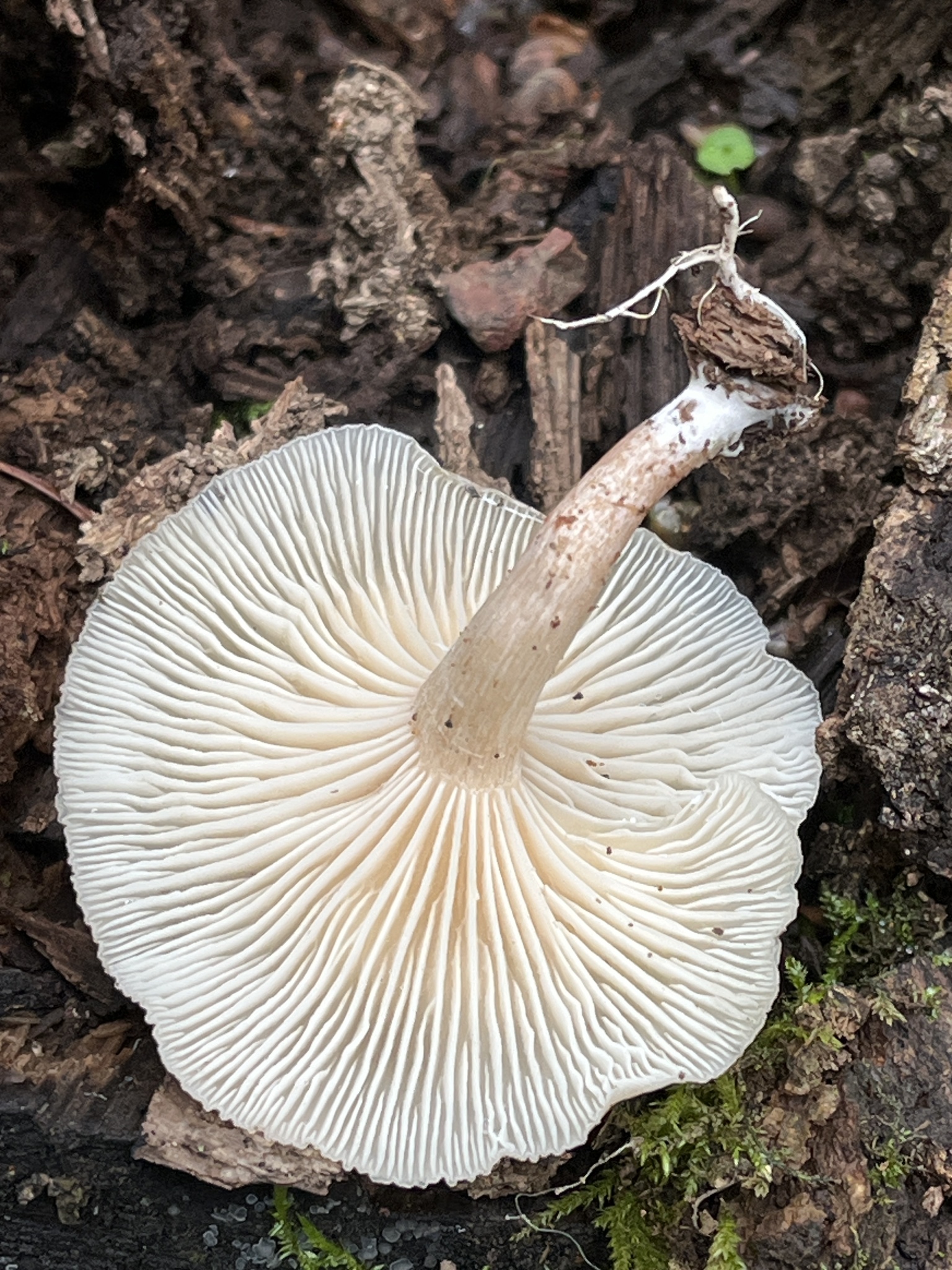 Lamellen: leicht herablaufend, milchweiss bis blass rosa, creme, Flächen oft runzelig.