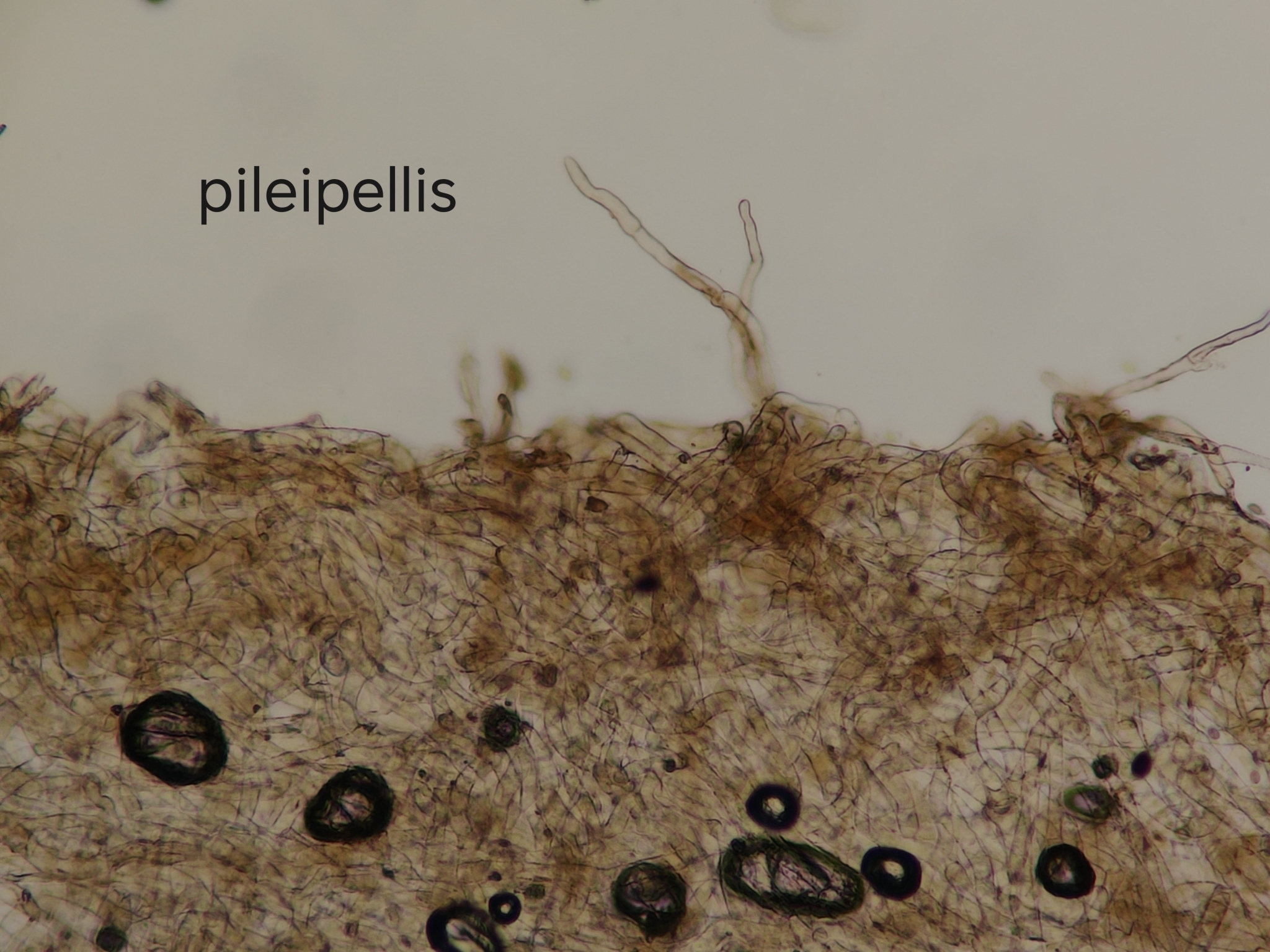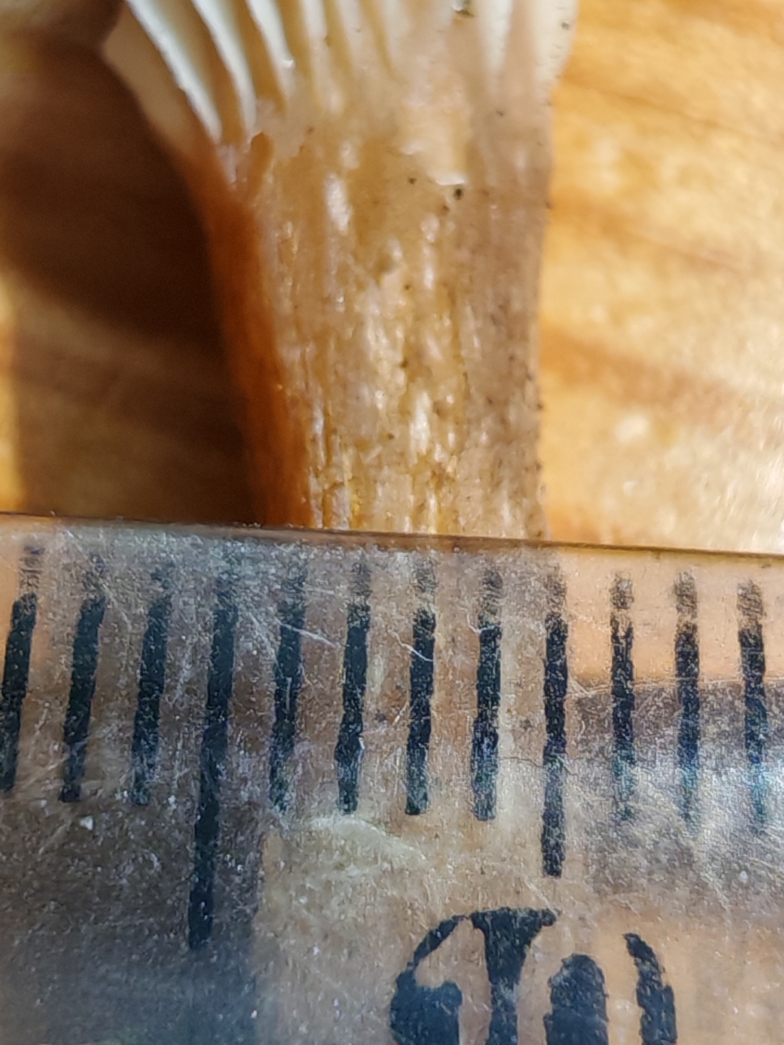 Stiel: zylindrisch bis Basis leicht verdickt und weiss faserig, wie der Hut gefärbt, ockerbräunlich, fein weisslich befasert, berindet (Rinde ca. 1,5 mm dick).
