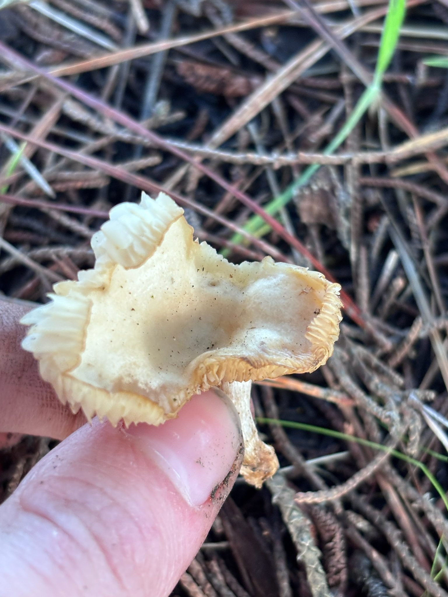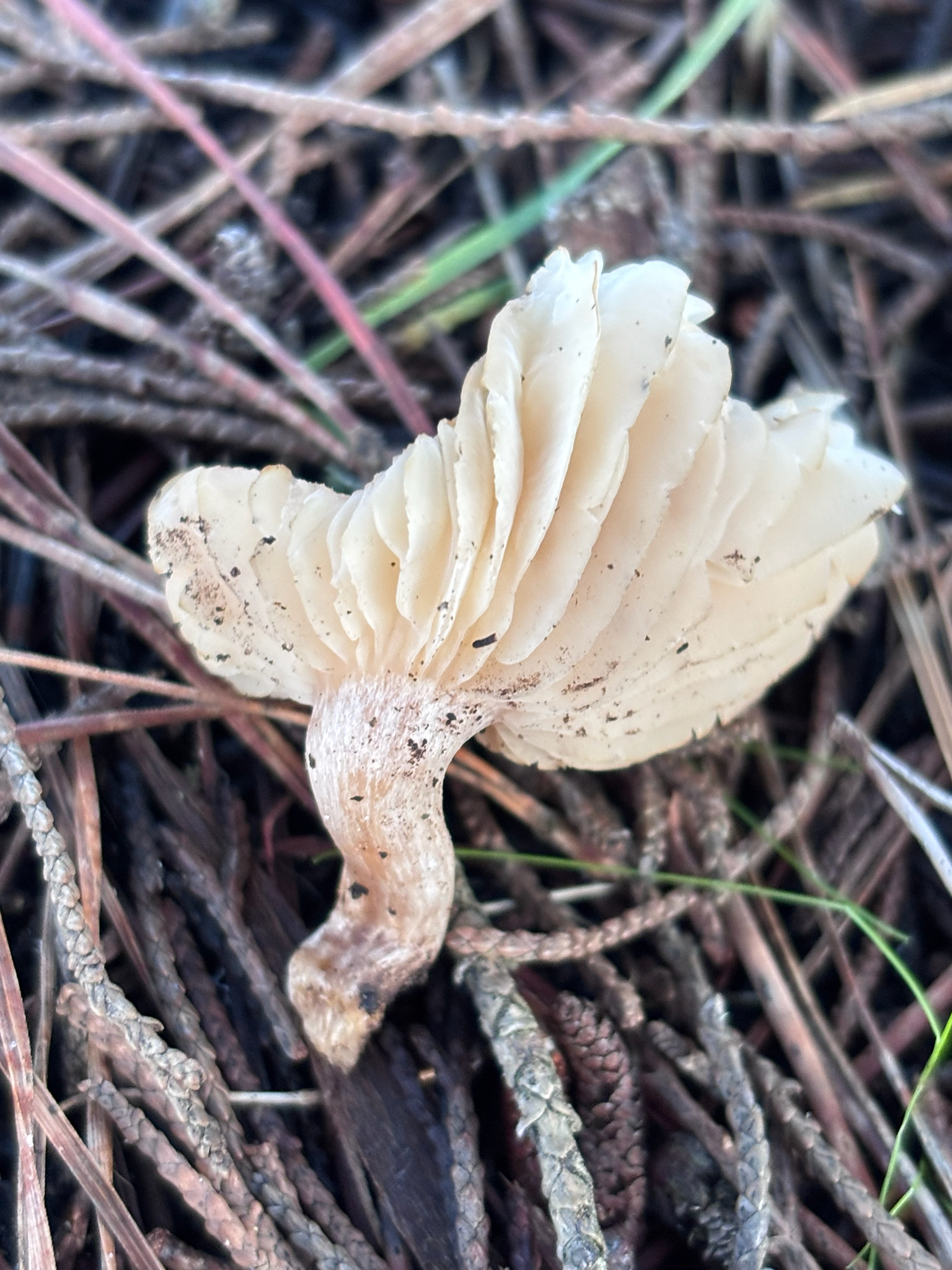 Lamellen: schmal bis mässig breit, weisslich bis creme, hellbeige, angewachsen bis schwach herablaufend.