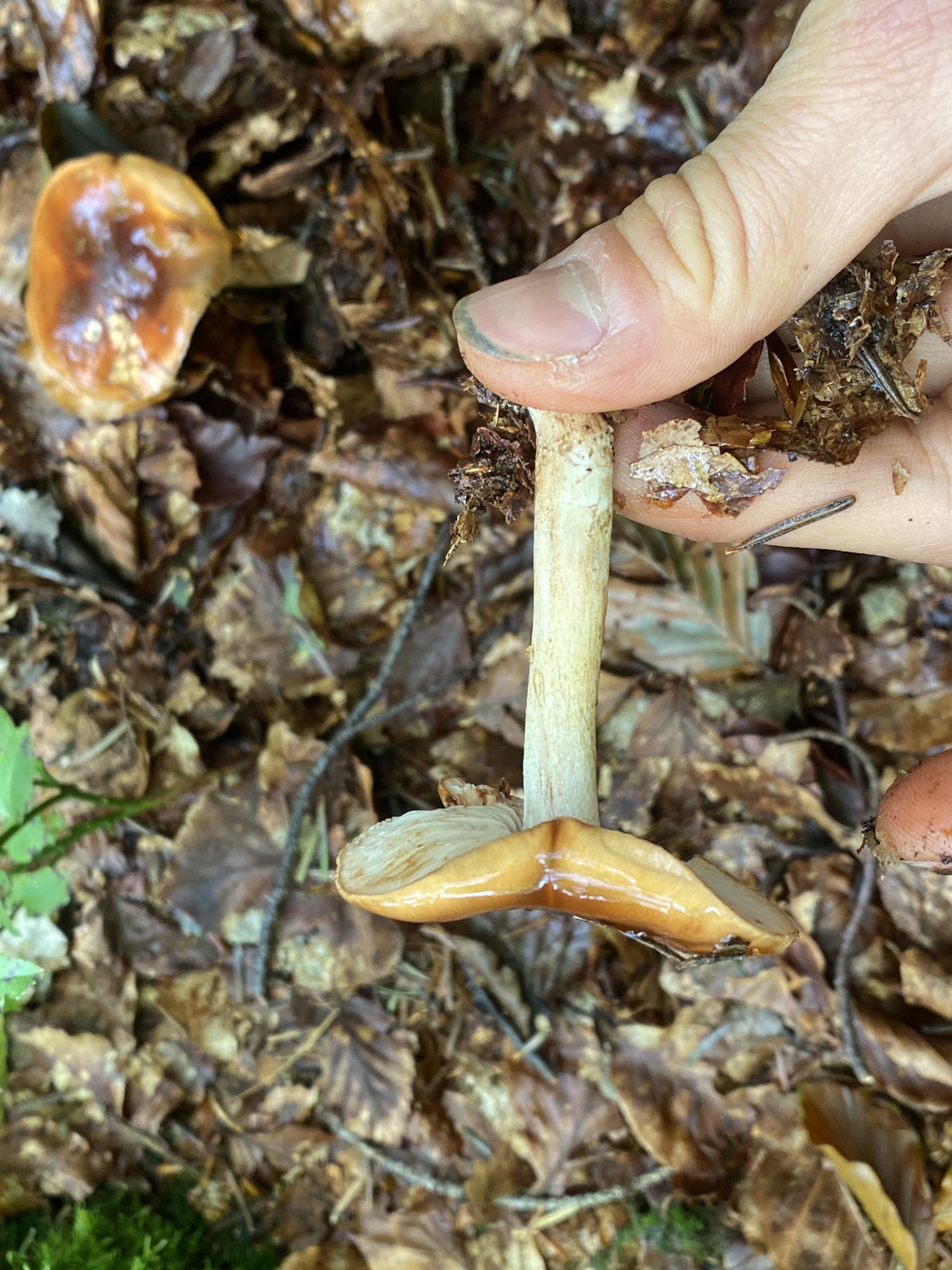 Hut: konvex bis konvex ausgebreitet und gewellt, meist mit Buckel, grau-orange bis braun-orange, auch katanienbraun, im Alter sehr dunkel, glatt, eingewachsen faserig, schmierig, Rand blasser.