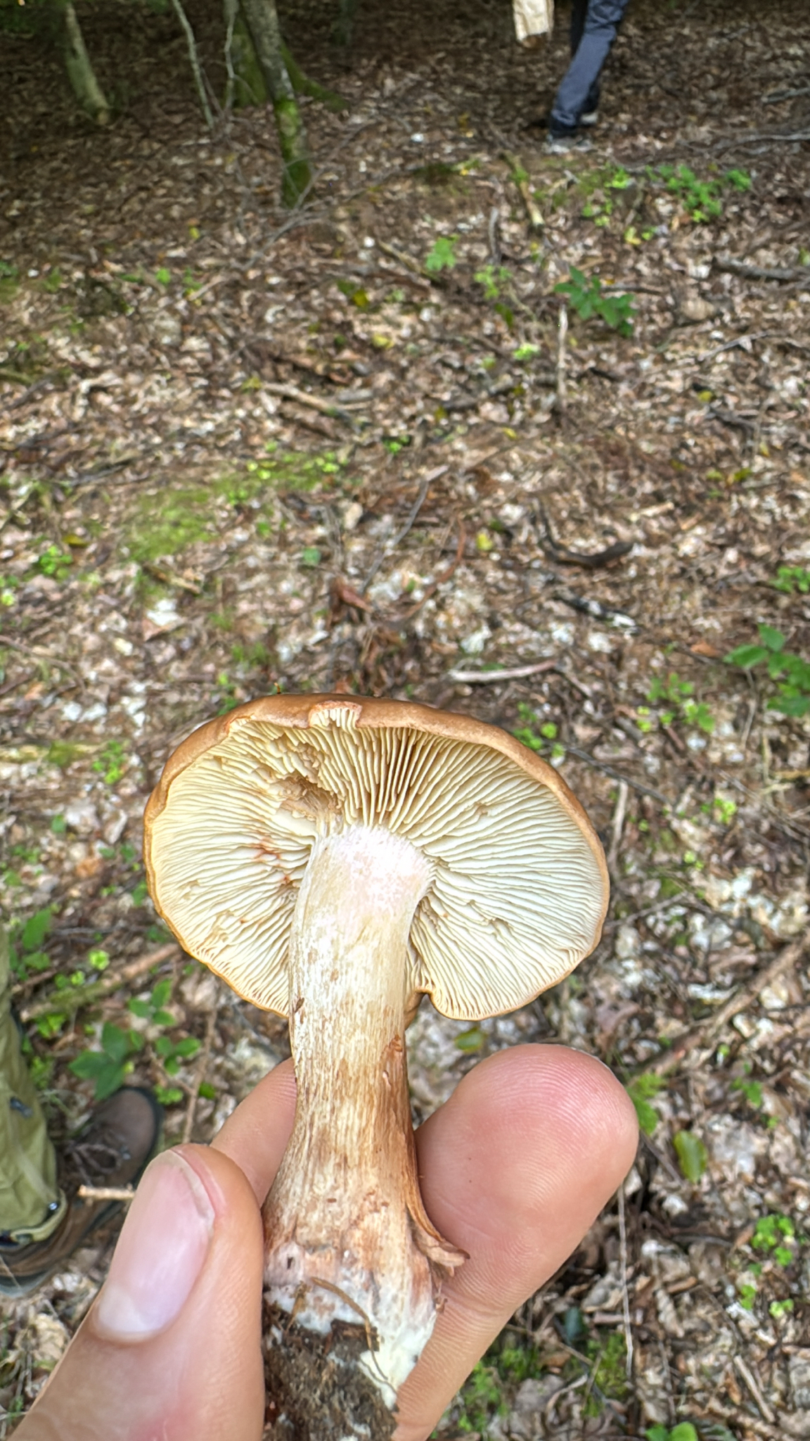 Lamellen: cremeweiss, später blassocker, Druckstellen rötlichbraun, relativ schmal
