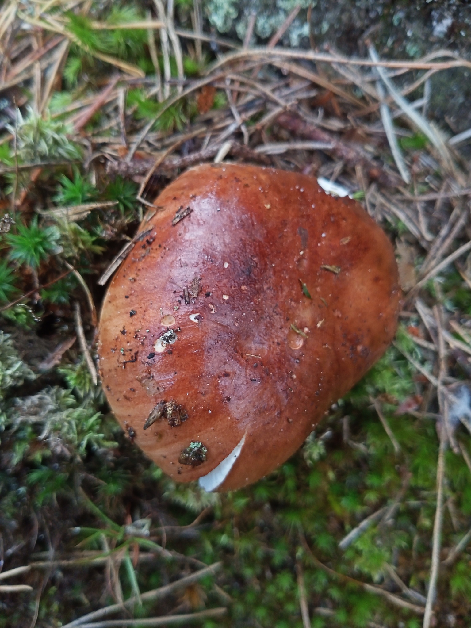 Hut: jung gewölbt, stumpf gebuckelt, dann flach ausgebreitet, gewellt, geschweift, stark schmierig klebrig, kastanienbraun, mit dunkelbraunen tropfenförmigen Flecken, Rand blasser bis weisslich.