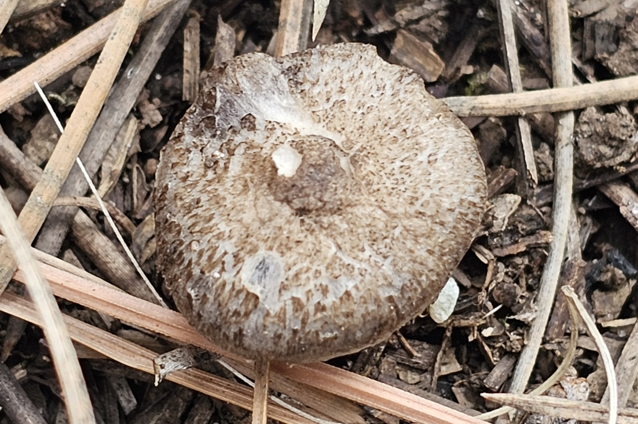 Hut: jung kegelförmig, dann ausgebreitet, gebuckelt, braun bis dunkelgrau, faserig-schuppig auf ocker Grund, Rand eingebogen.