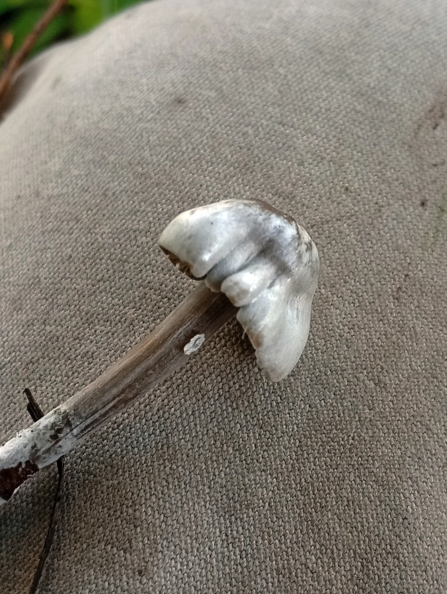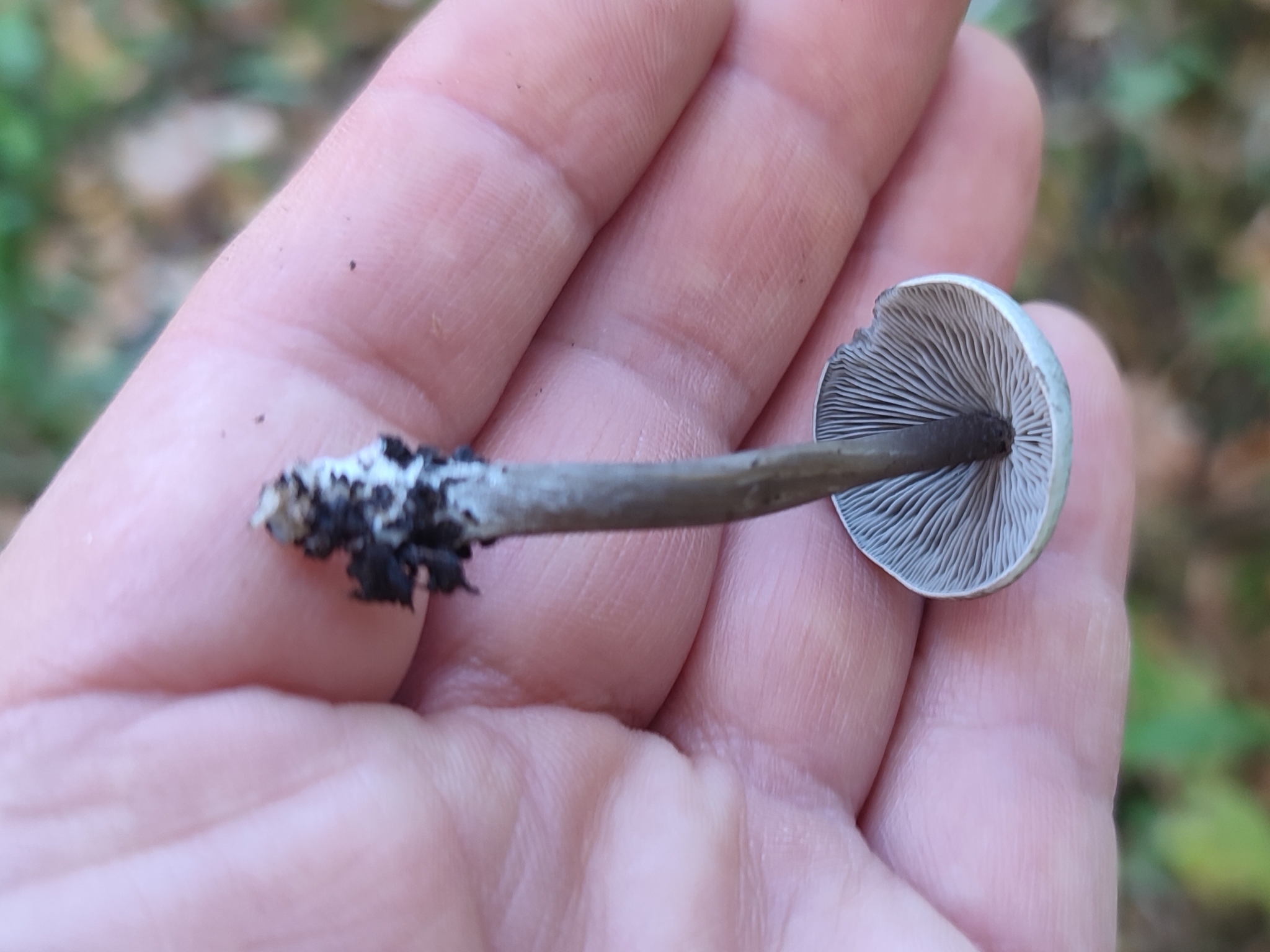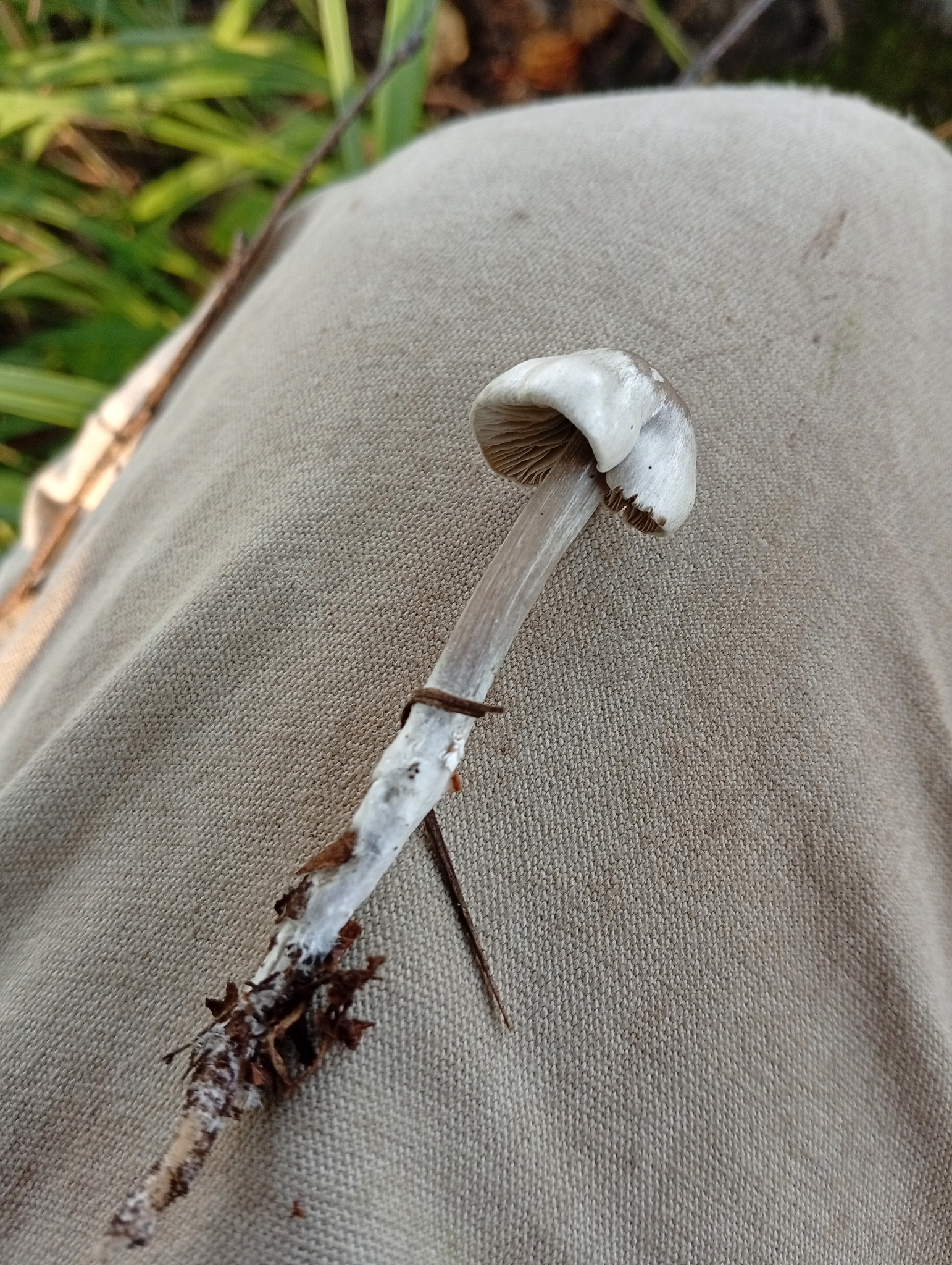 Stiel: zylindrisch, graubräunlich, grau, Spitze heller, Basis stark wurzelnd (bis ca. 5 cm. wurzelartige Verlängerung), glatt bis längsfaserig, steif