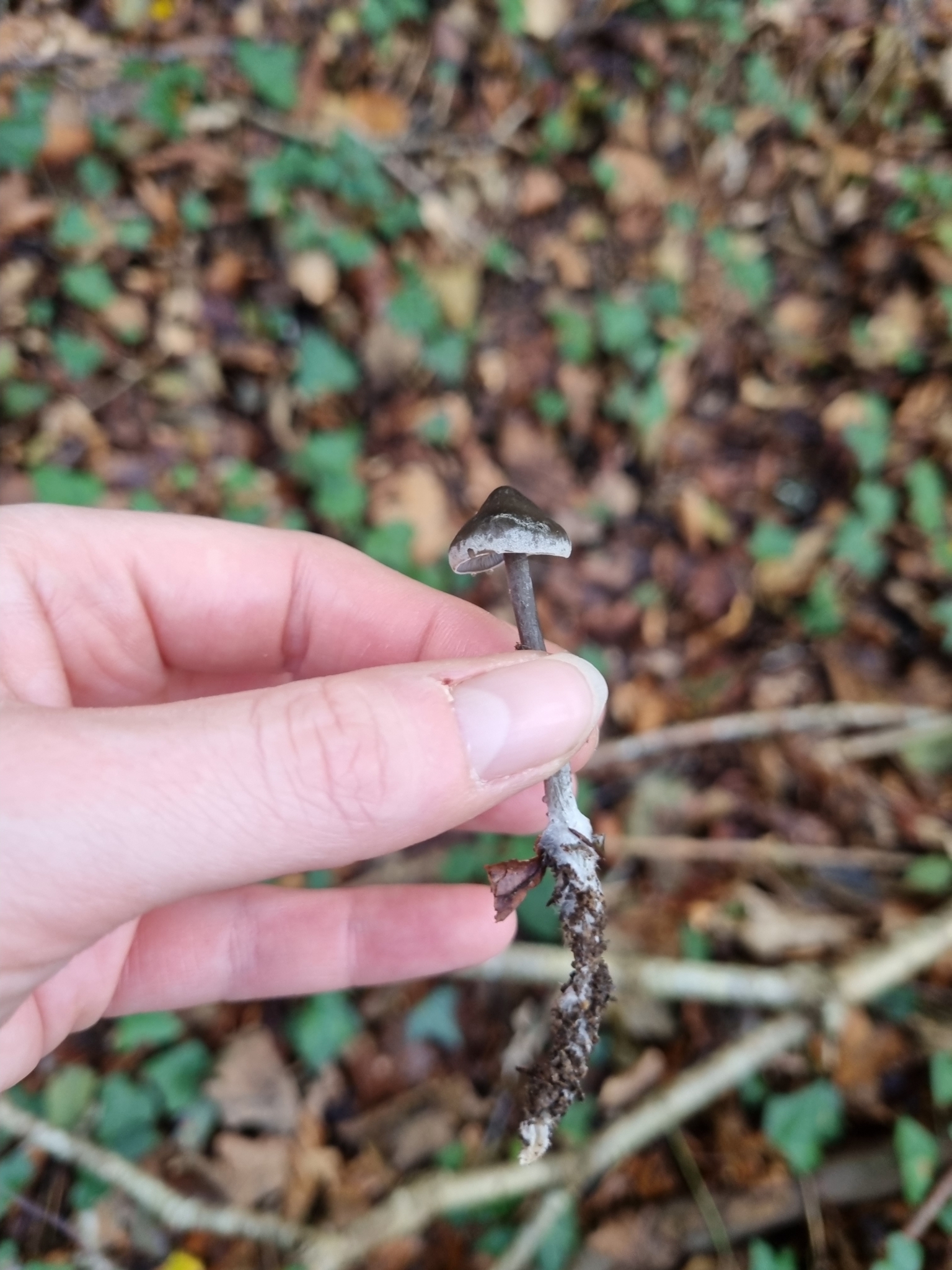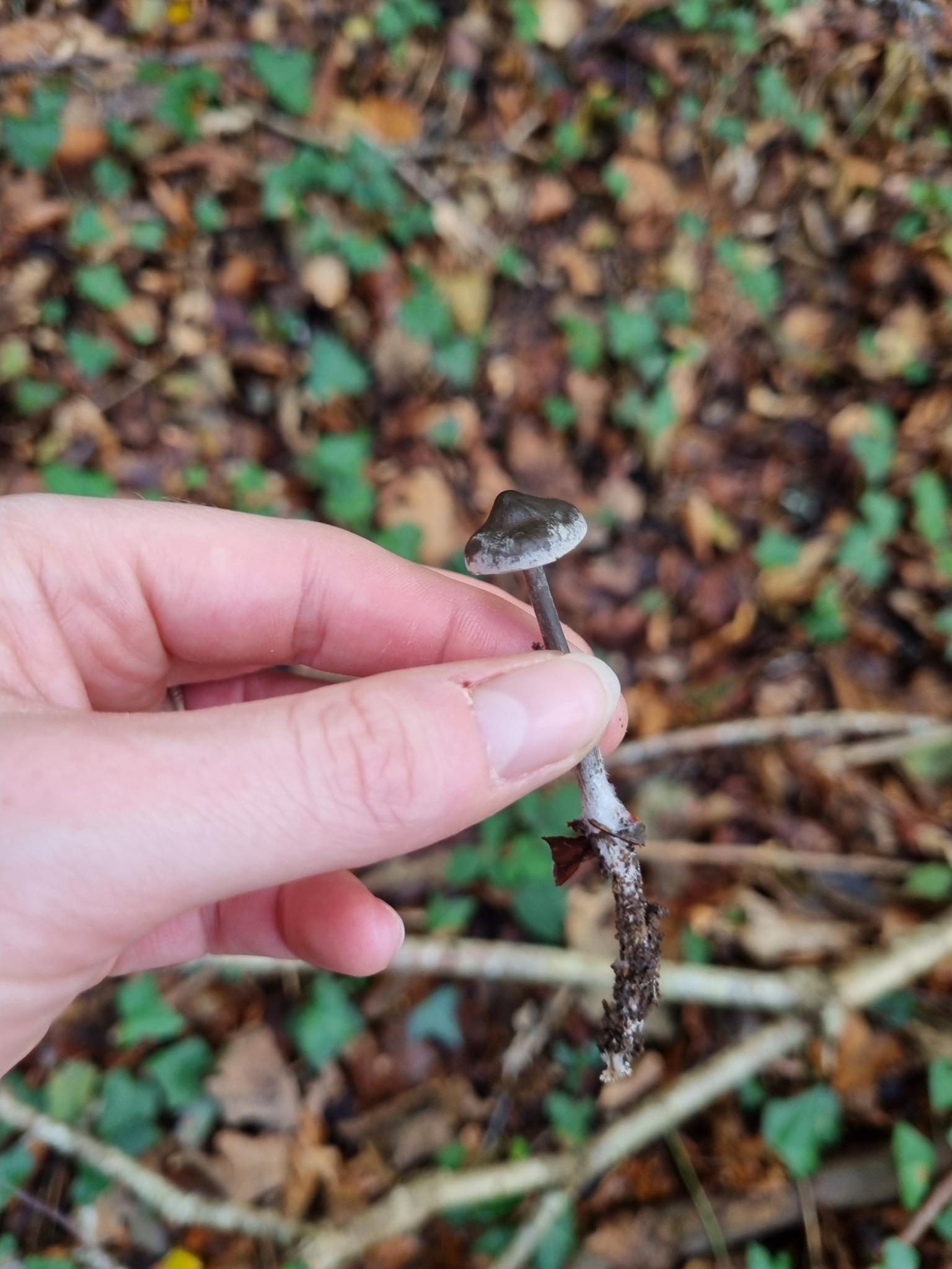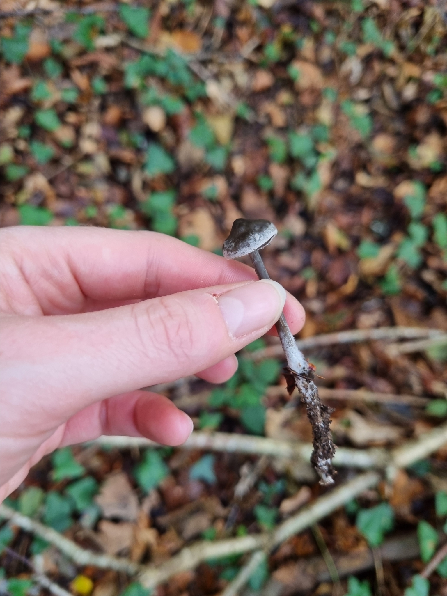 Stiel: zylindrisch, graubräunlich, grau, Spitze heller, Basis stark wurzelnd (bis ca. 5 cm. wurzelartige Verlängerung), glatt bis längsfaserig, steif