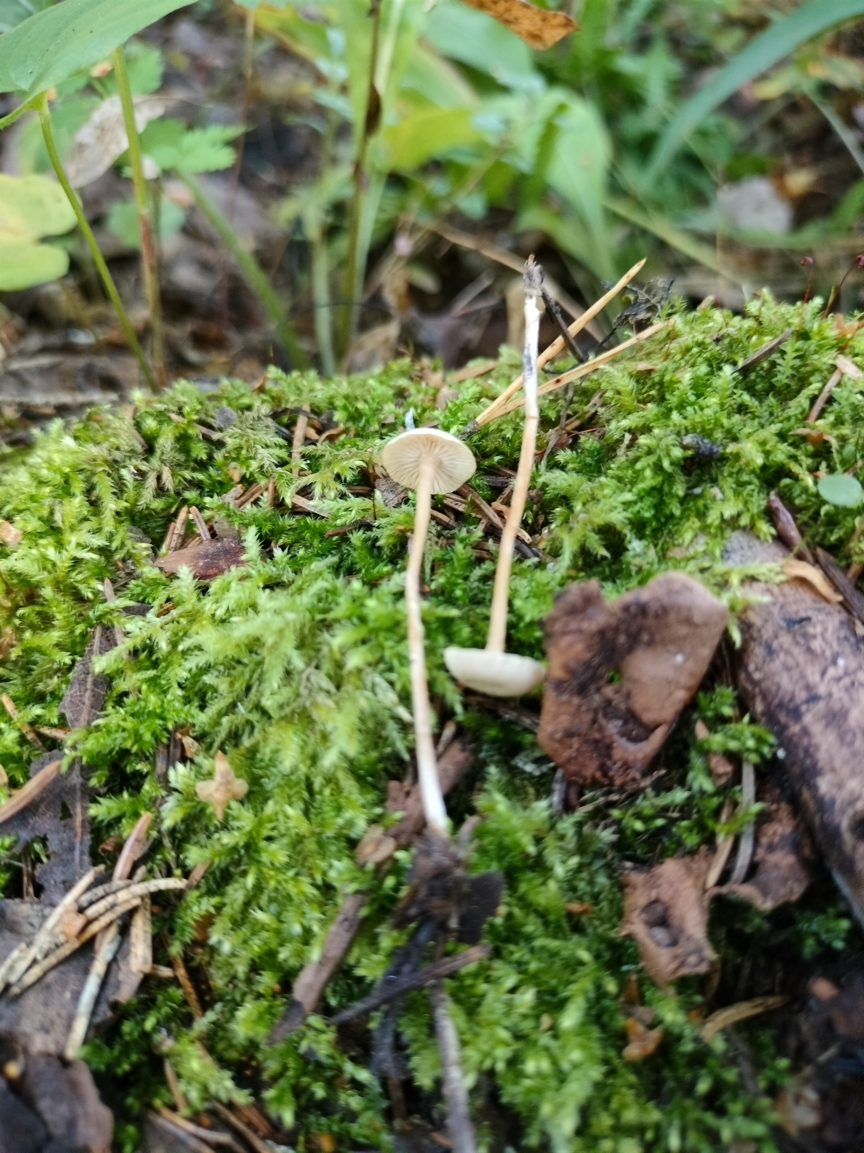 Hut 1—2 cm im Durchmesser, konvex, flacht bei Wachstum ab, mit ausgeprägtem Buckel (umbonat); graubraun, heller zum Rand hin, blass, wenn trocken; bereift (pruinose).Stiel 20—40x1—1.5 mm; blass braunlich-grau; pulverig-granuliert.Fleisch blass buff; Geschmack und Geruch mehlig.Lamellen dichtstehend; weiß bis blass rosa-grau.Sporen 3.5—4x2.5µ, eiförmig.Sporenabdruck weiß.