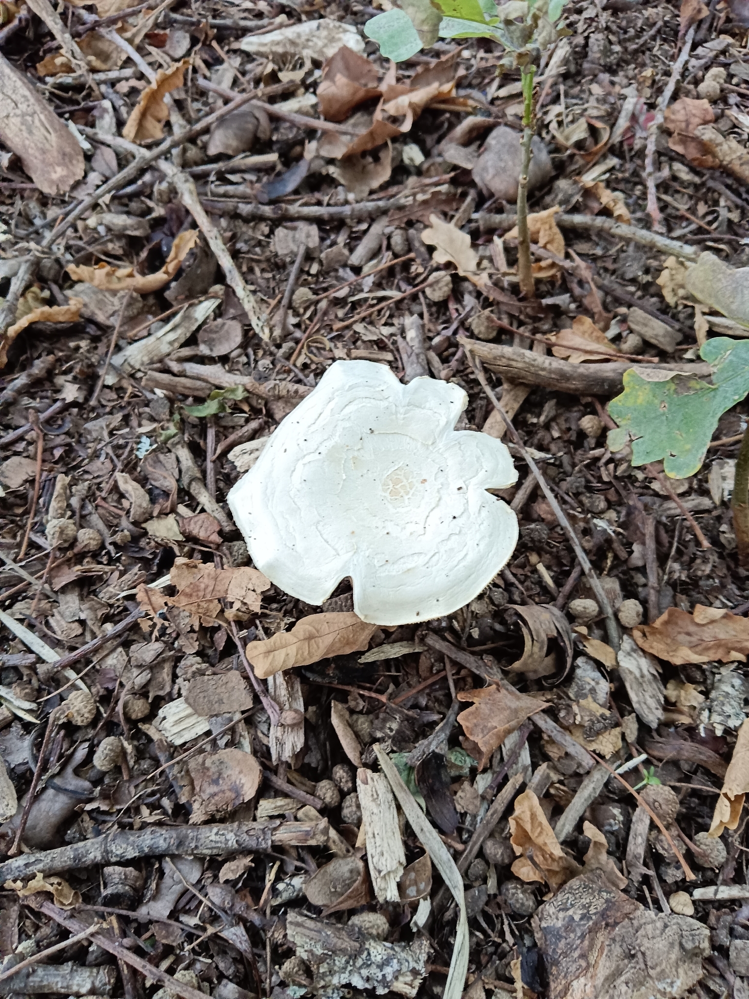 Hut: konvex bis halbkugelig, später flach, Rand aufgeboben mit eingedelltem Zentrum, auch mit kleinem Buckel, glatt, weisslich, Mitte u.U. bräunlich.
