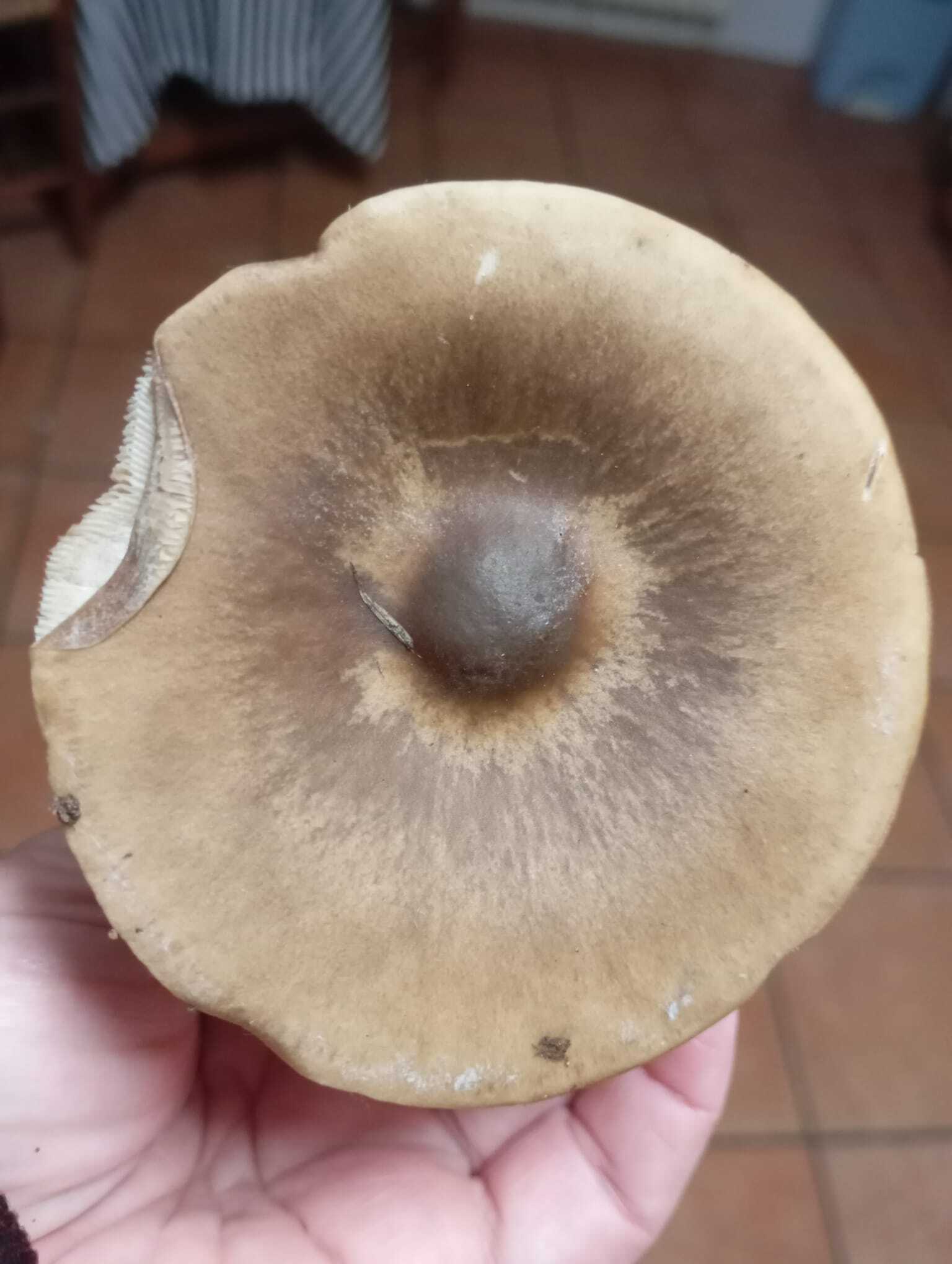 Hut: jung gewölbt, dann flach, mit flüchtigem Buckel, graubraun bis braunschwärzlich, Mitte dunkler, später ausbleichend.