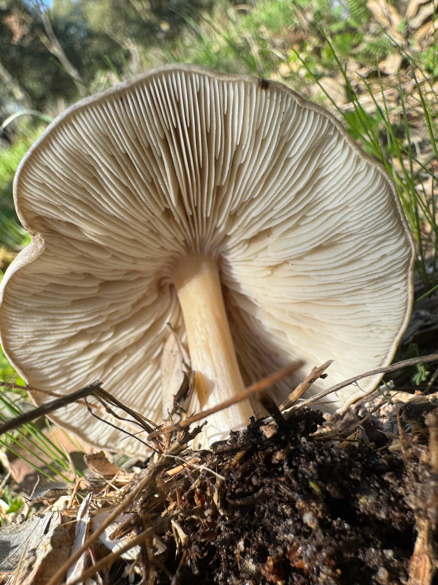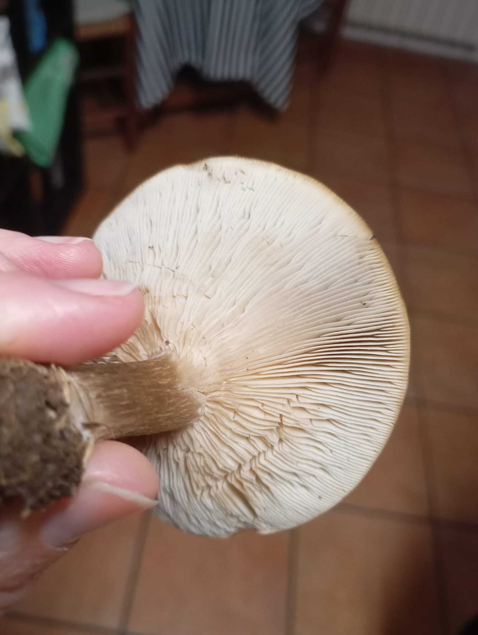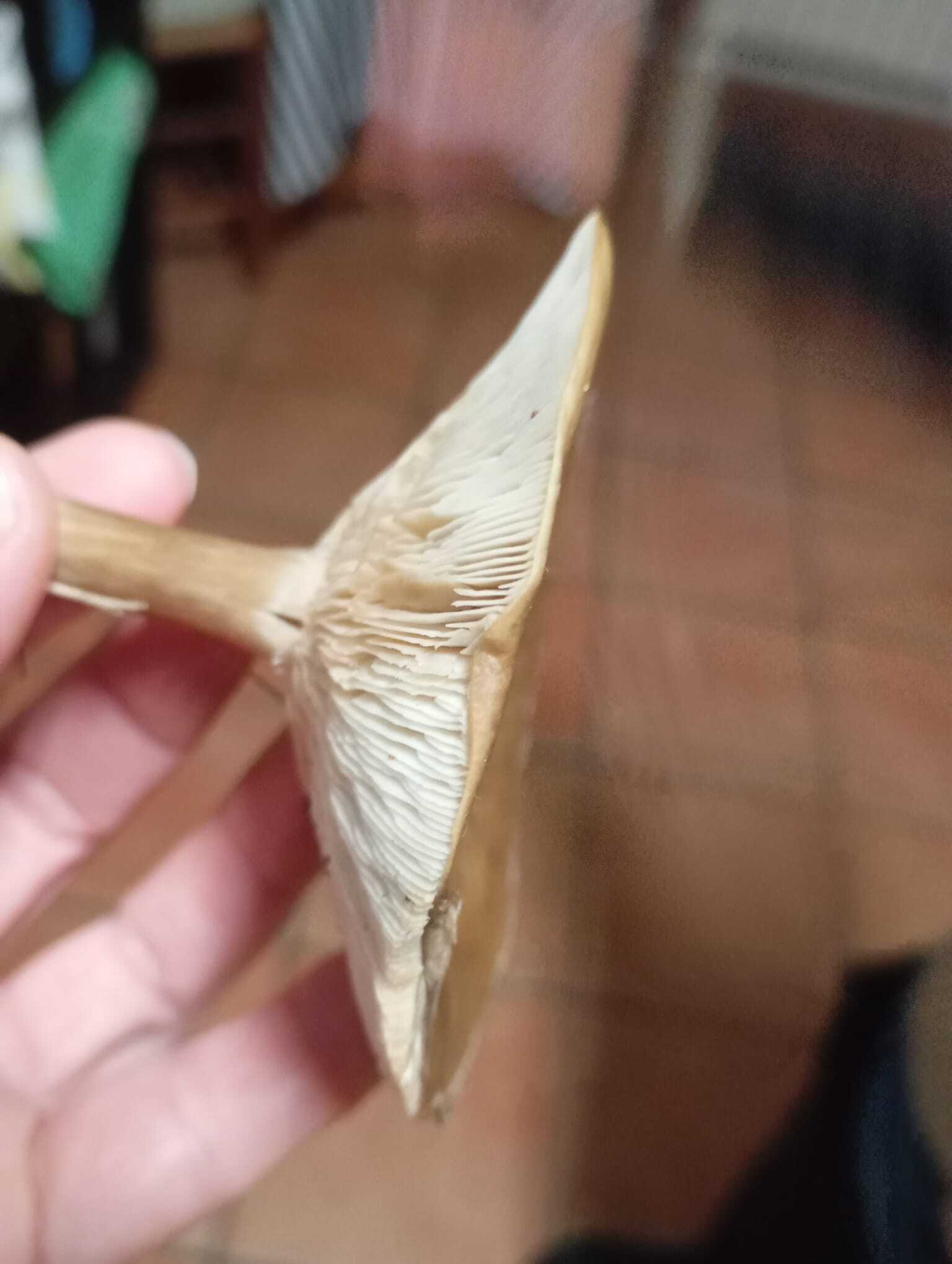 Lamellen: ausgebuchtet, gedrängt, bauchig, bräunlich creme, später weisslich.