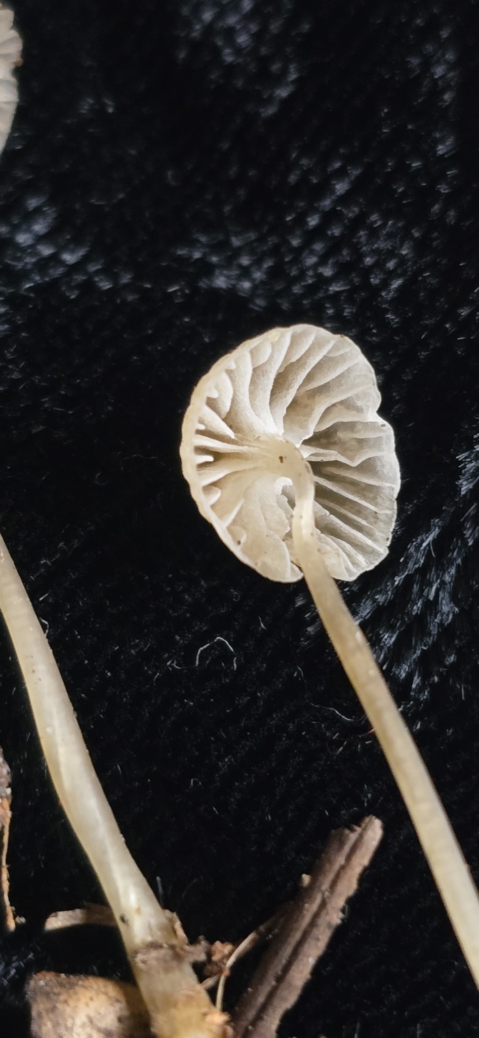 Lamellen: weisslichgrau, jung etwas aufsteigend, später gerade angewachsen bis leicht herablaufend, entfernt stehend, teilweise gegabelt und auch queradrig verbunden, Schneide etwas heller.