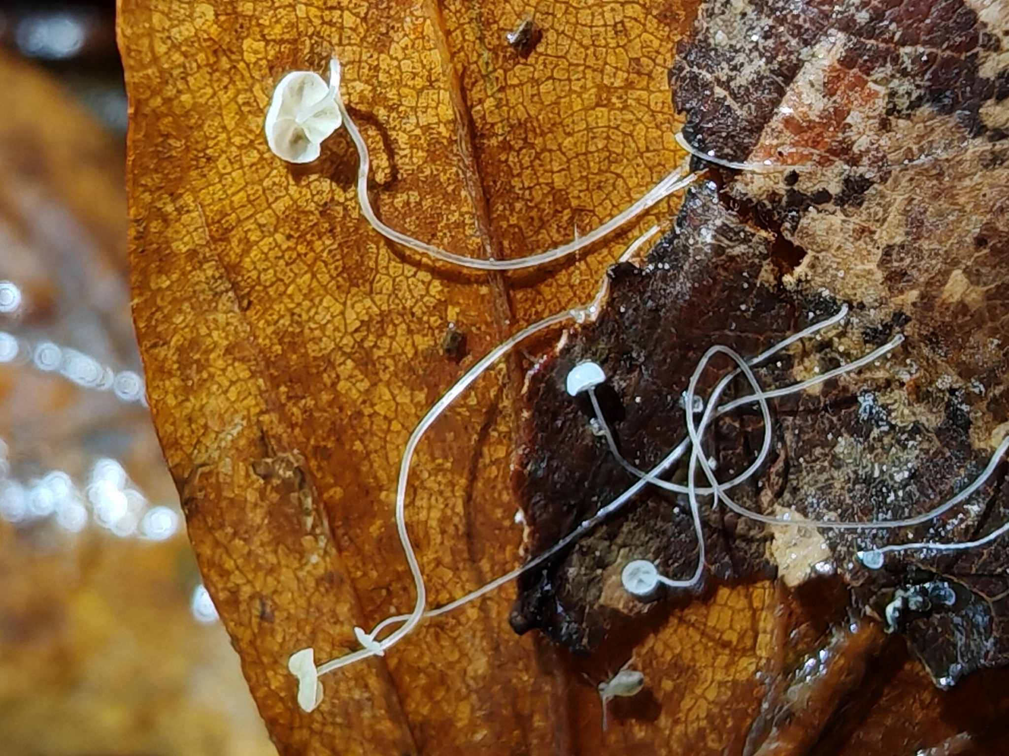 Stiel: haardünn, schlaff, fädig, weisslich, Spitze bräunlich.