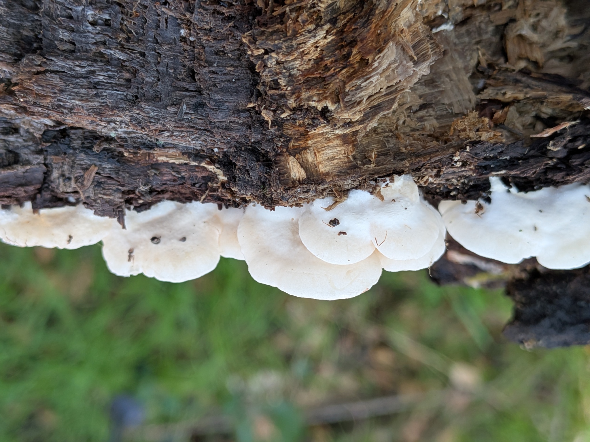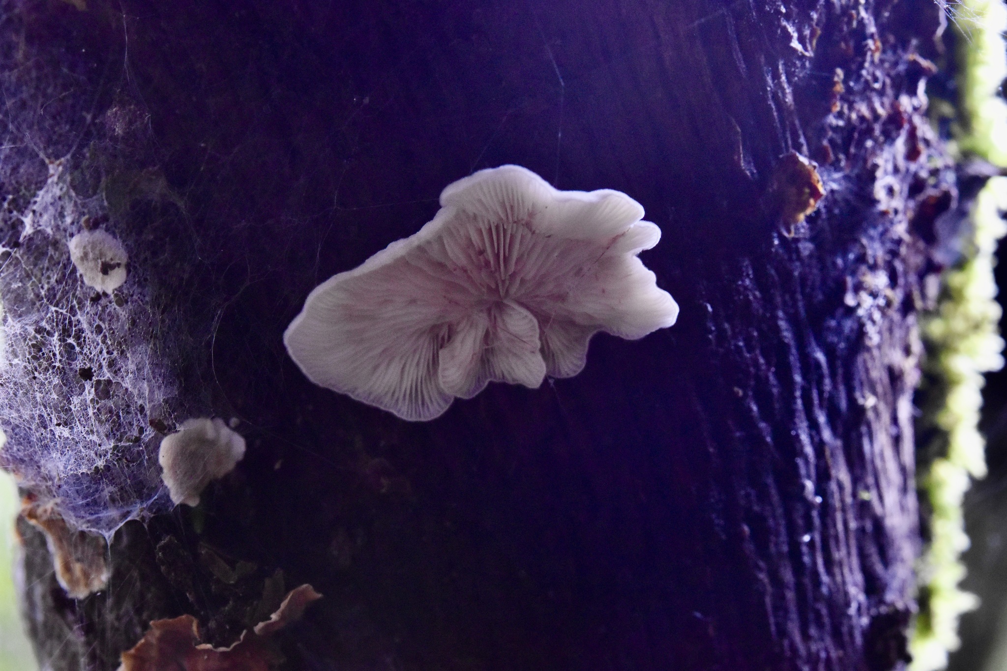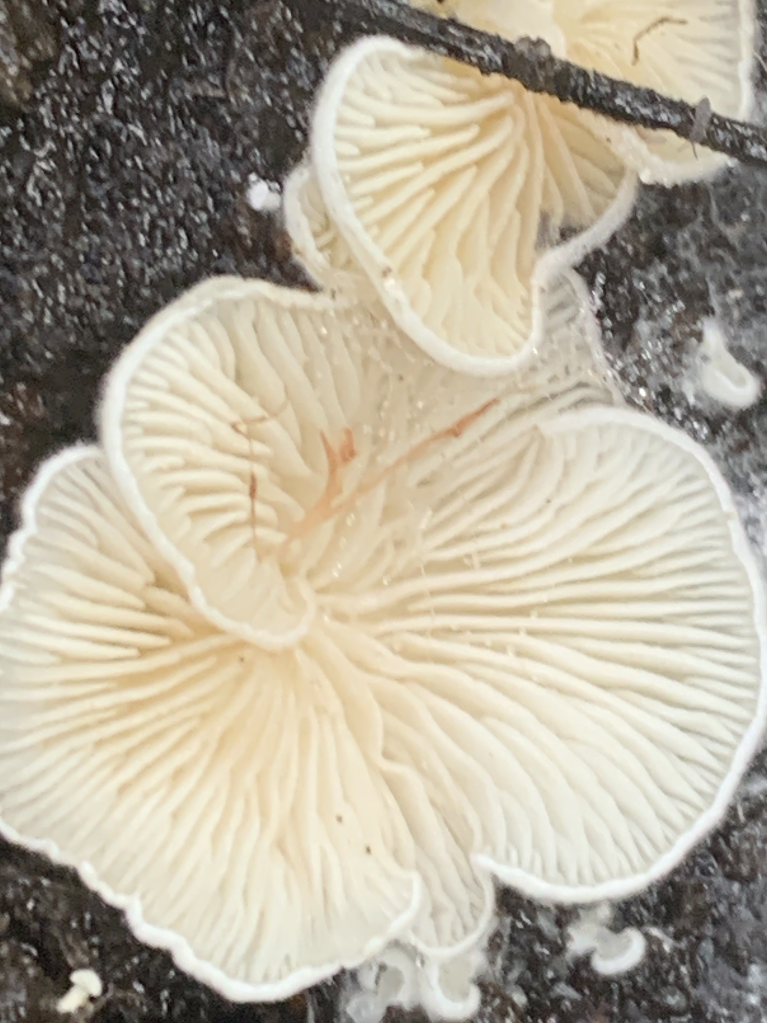 Hut: muschelförmig, spatelförmig, feinfilzig, weisslich bis blass rosa, Rand eingerollt.