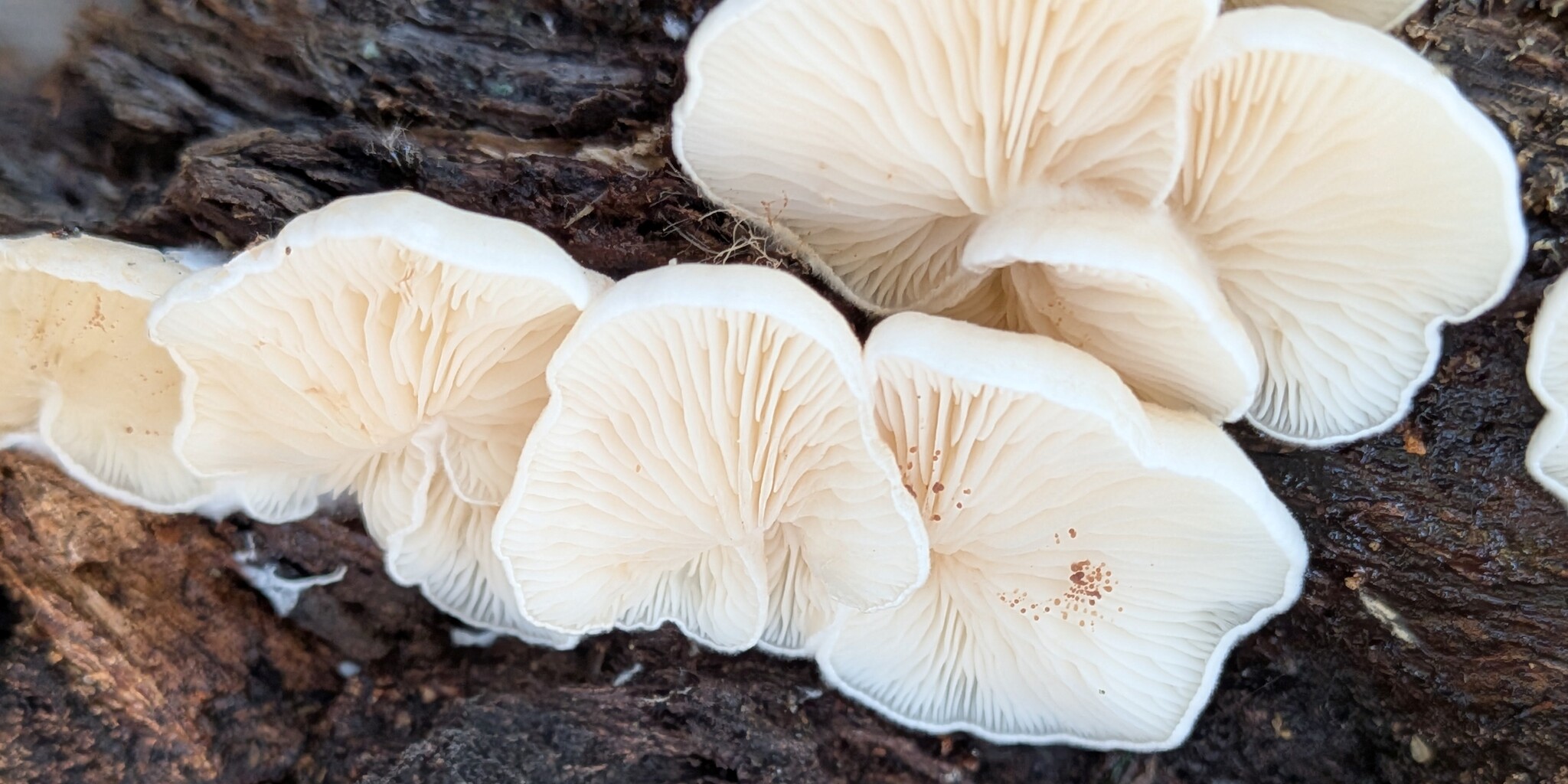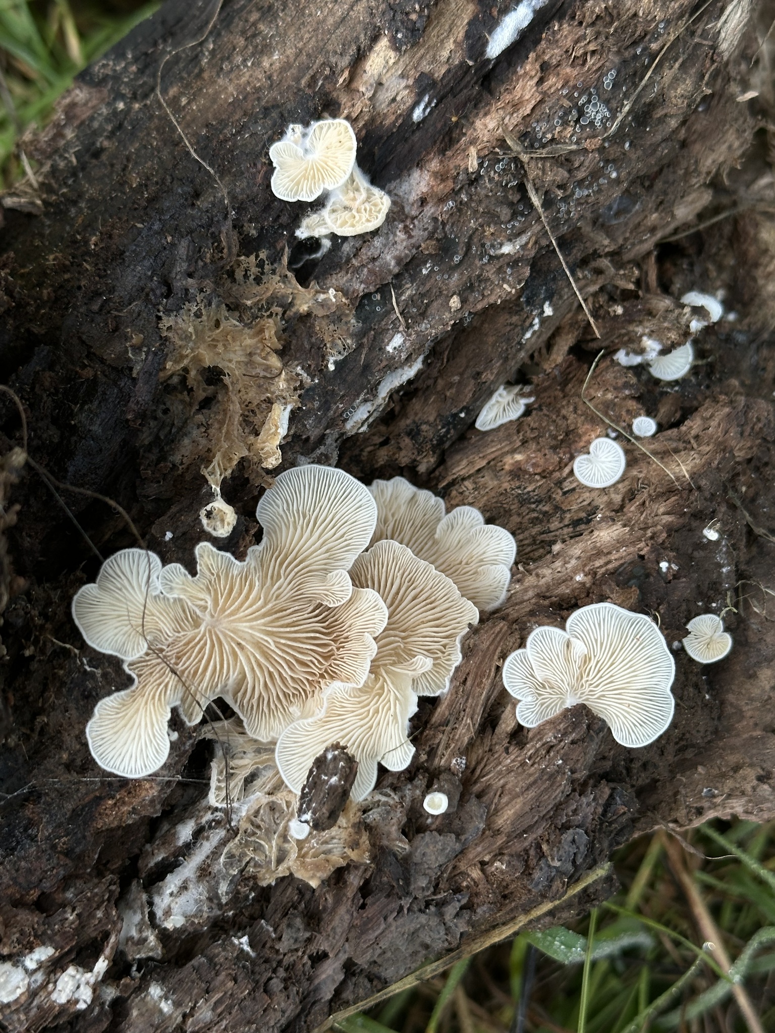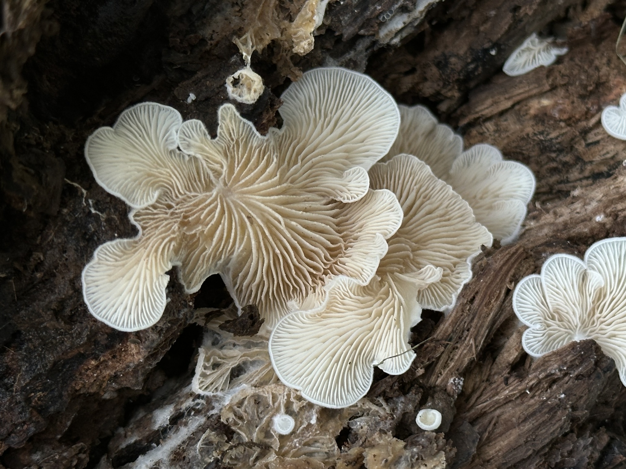 Hut: muschelförmig, spatelförmig, feinfilzig, weisslich bis blass rosa, Rand eingerollt.