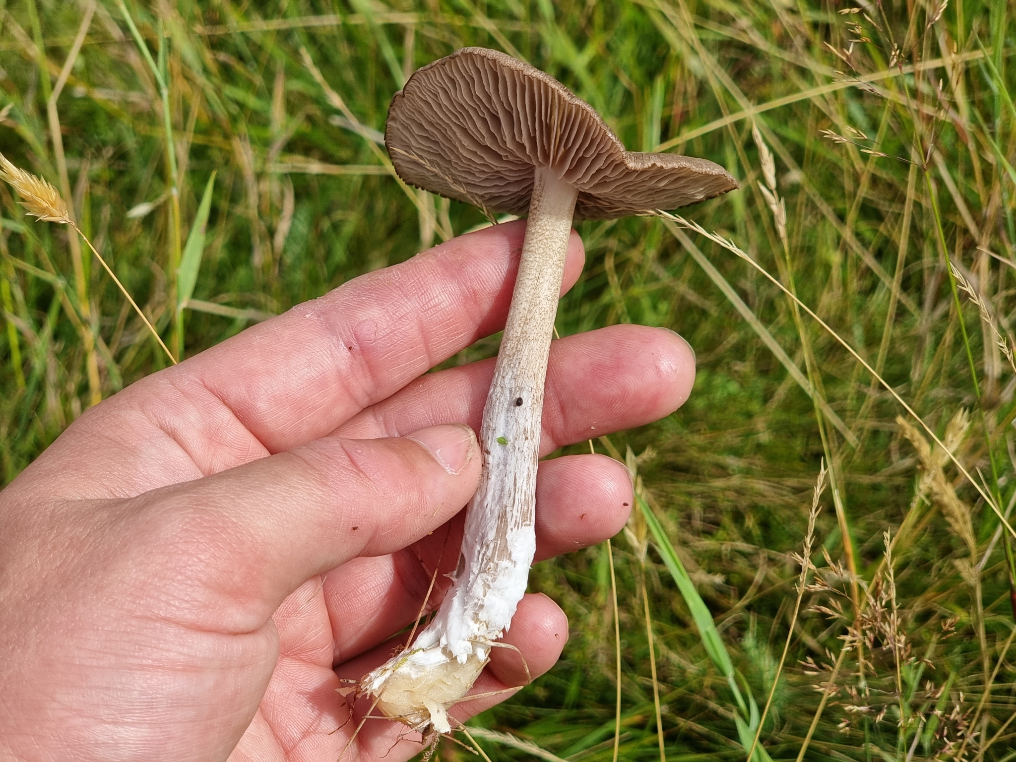 Stiel: wie der Hut gefärbt, Spitze blasser, glanzlos, abwärts graubraun bis rotbraun überfasert, Basis manchmal verdickt-