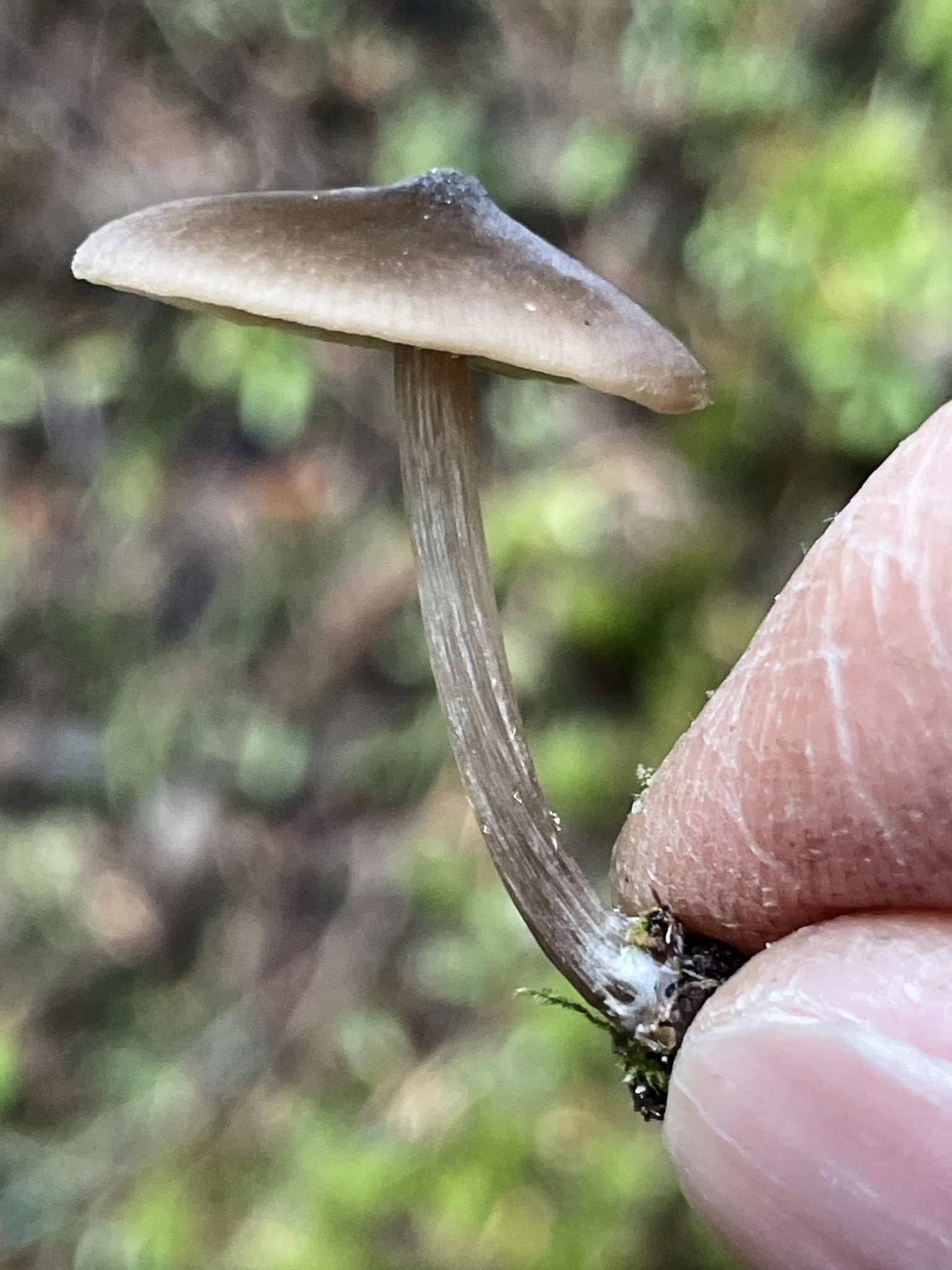 Hut: 1–5 cm im Durchmesser, konico-konvex, dann flach oder glockenförmig mit einem breiten Buckel (umbo); sepiafarben, dunkelt zur Mitte hin, trocknet blass oder hell sepia mit auffälligem Glanz; bei Feuchtigkeit am Rand gerieft, die Huthaut ist dünn und zerbrechlich.Stiel: 20–60x2–5 mm, mehr oder weniger knorpelig; blass graubraun, oft mit sepiafarbenen Schattierungen; die Basis ist mit feinem, weißen Flaum bedeckt.Fleisch: Farbig wie der Hut; Geschmack stark mehlig, Geruch mehlig beim Zerdrücken.Lamellen: Fast frei; anfangs weißlich, später rosa oder bräunlich-rosa.Sporen: 7.5–10x5.5–7 µ, breit elliptisch bis fast subkugelig, mit gut ausgeprägten Ecken.Sporenabdruck: Rosa.