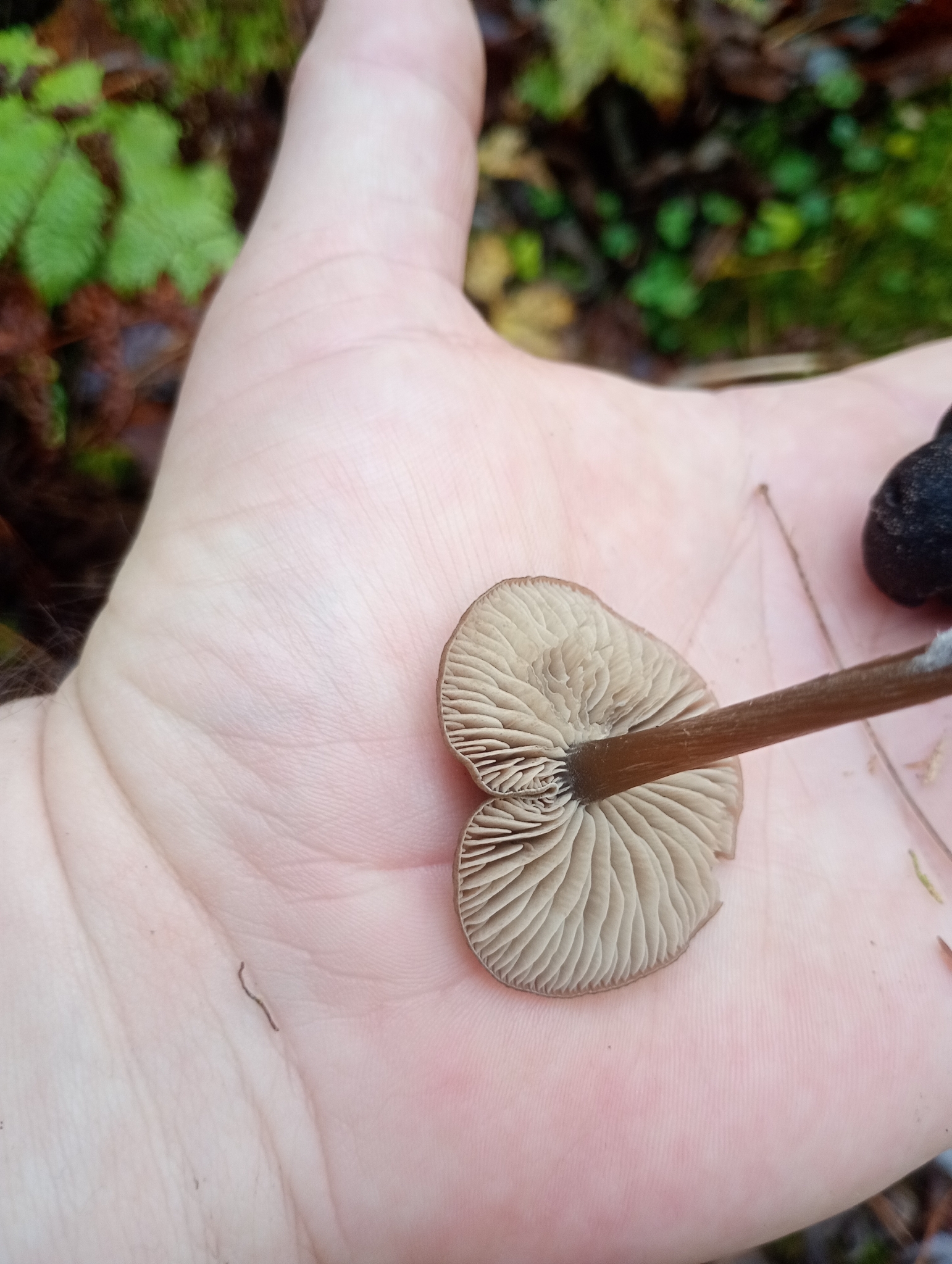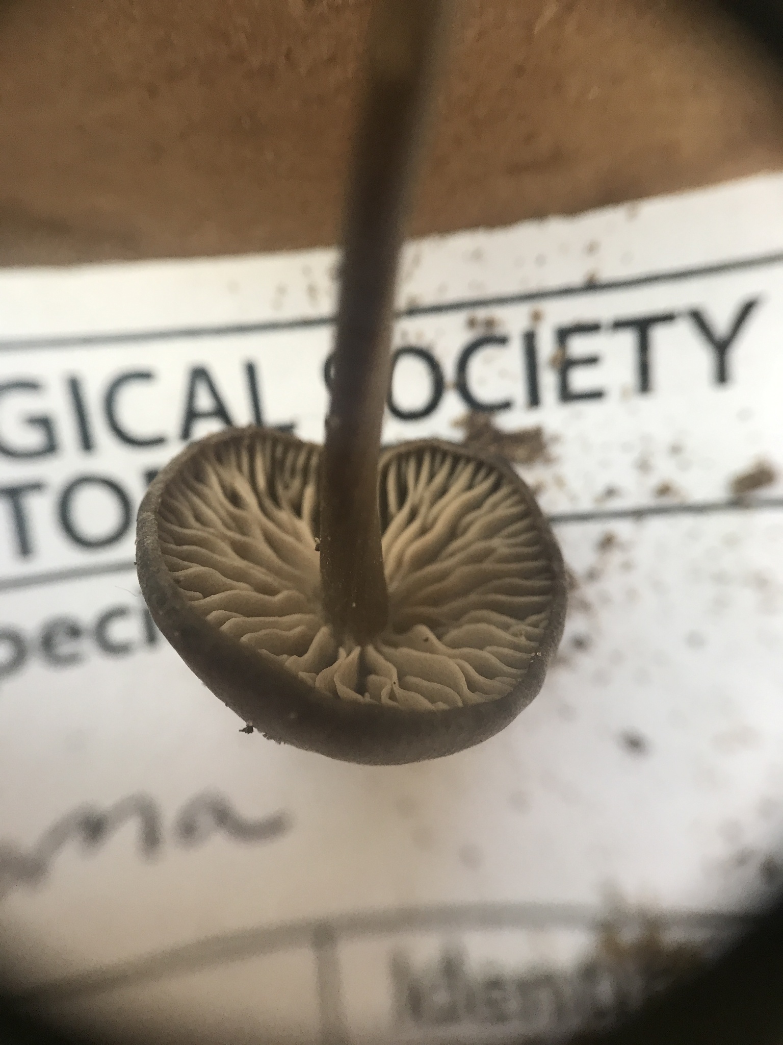 Hut 1.5—3 cm im Durchmesser, variabel in der Form: von konvex oder flach-konvex bis leicht niedergedrückt, gelegentlich auch mit einem Buckel (umbonat); sepiafarben bis schwarzbraun, dunkler in der Mitte, trocknet zu einem blasseren Buff- oder blassgelben Farbton; bei Feuchtigkeit fein gerieft. Die Huthaut ist zäh und knorpelig.Stiel 20—70x2—3 mm, farblich ähnlich wie der Hut oder etwas heller.Fleisch: Farbig wie der Hut; Geschmack stark mehlig, Geruch mehlig beim Zerdrücken.Lamellen: Fast frei; anfangs weißlich-grau, später bräunlich-rosa.Sporen: 6.5–9x5.5–7 µ, subkugelig bis breit elliptisch, mit eher abgerundeten Ecken.Sporenabdruck: Rosa.