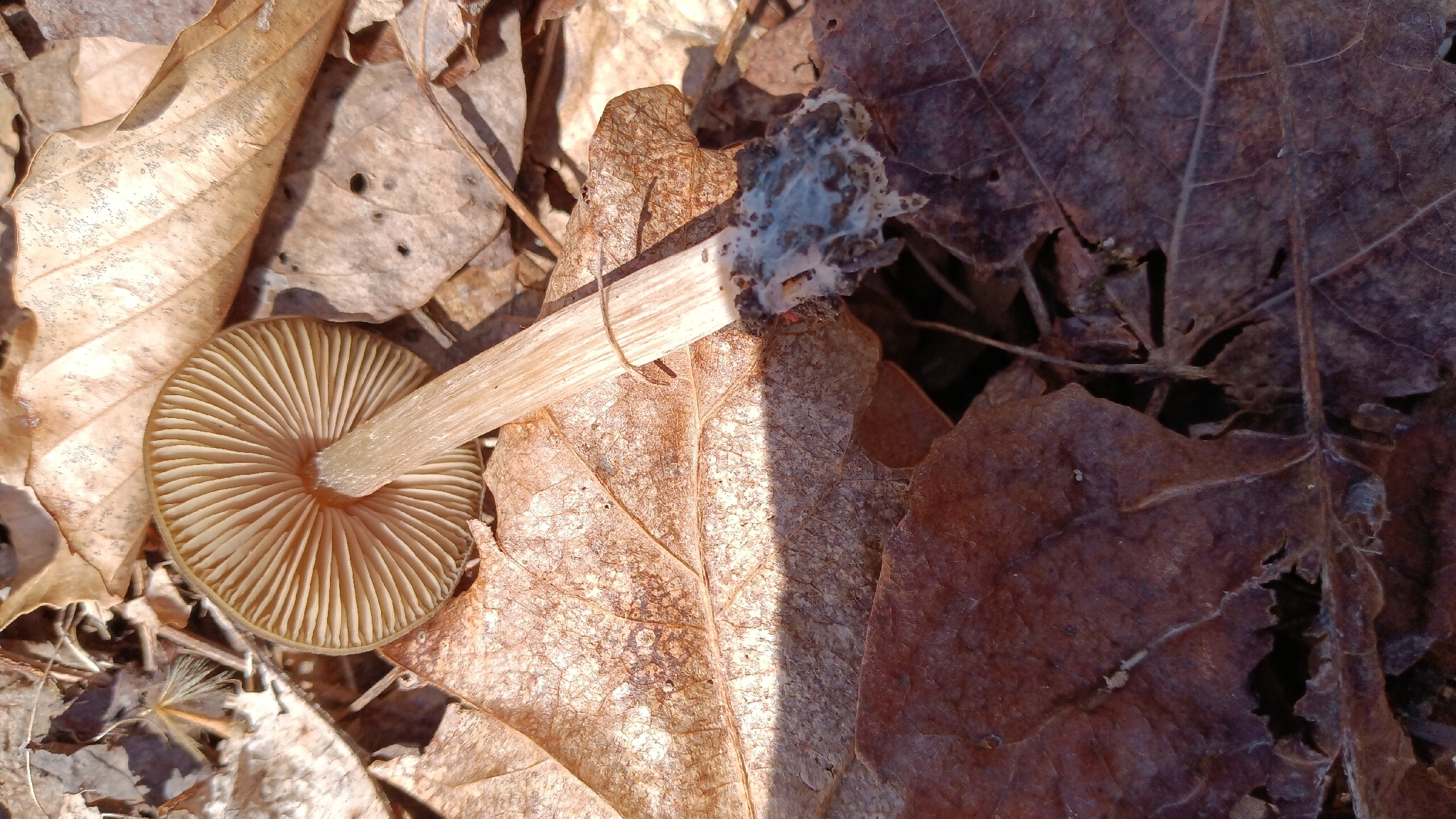 Lamellen: blass weisslichgrau, später rosagrau bis rosabräunlich, bauchig, sehr breit, angeheftet bis frei.