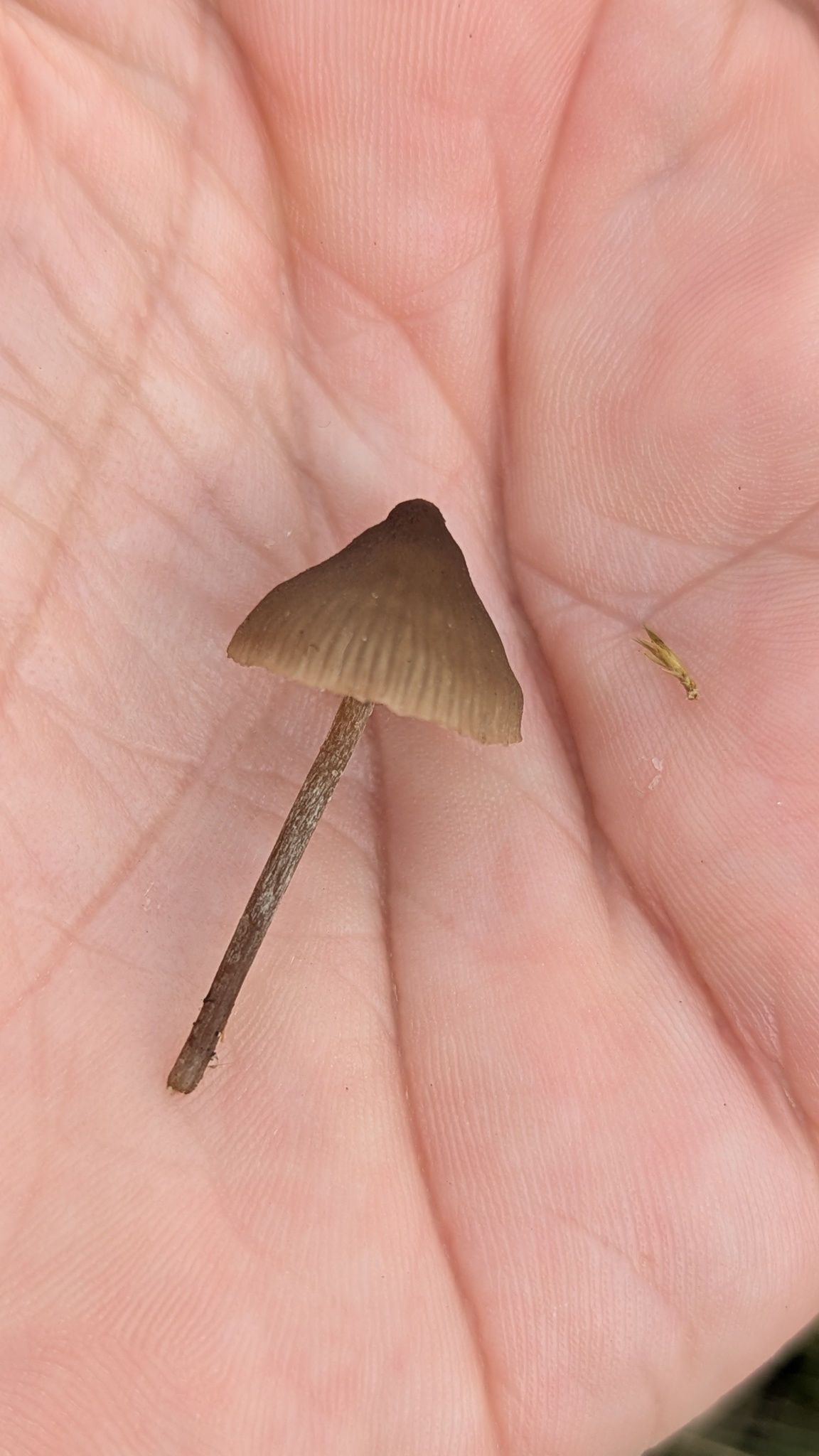 Hut: jung kegelig, dann leicht ausgebreitet mit deutlichem spitzem, fast warzenförmigen, Buckel, hygrophan, feucht durchscheinend gerieft, dunkel rötlichbraun bis schwärzlichbraun, Rand heller, beim Trocknen streifig ausblassend.