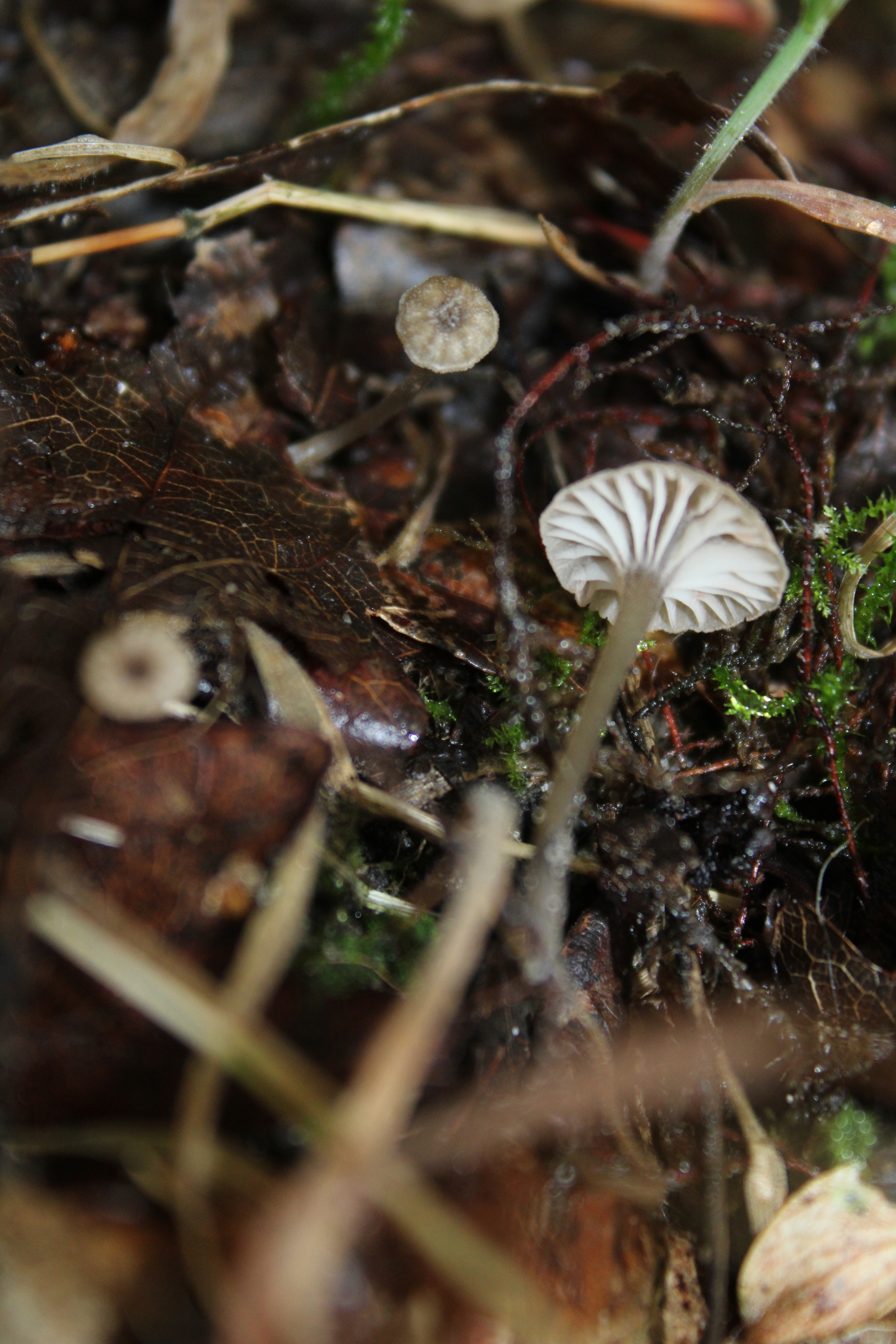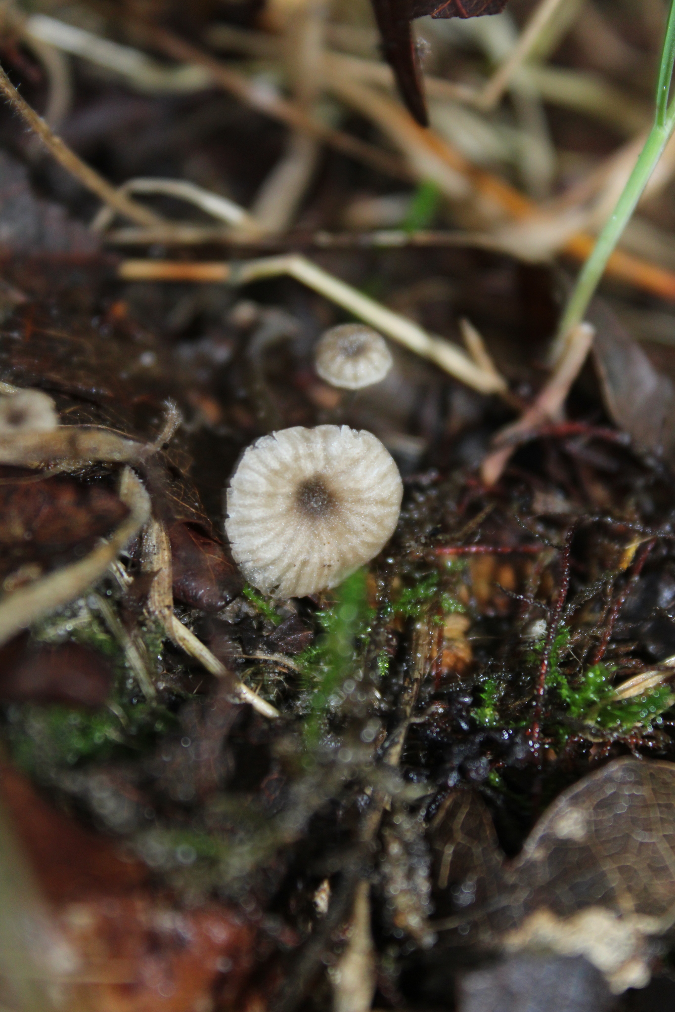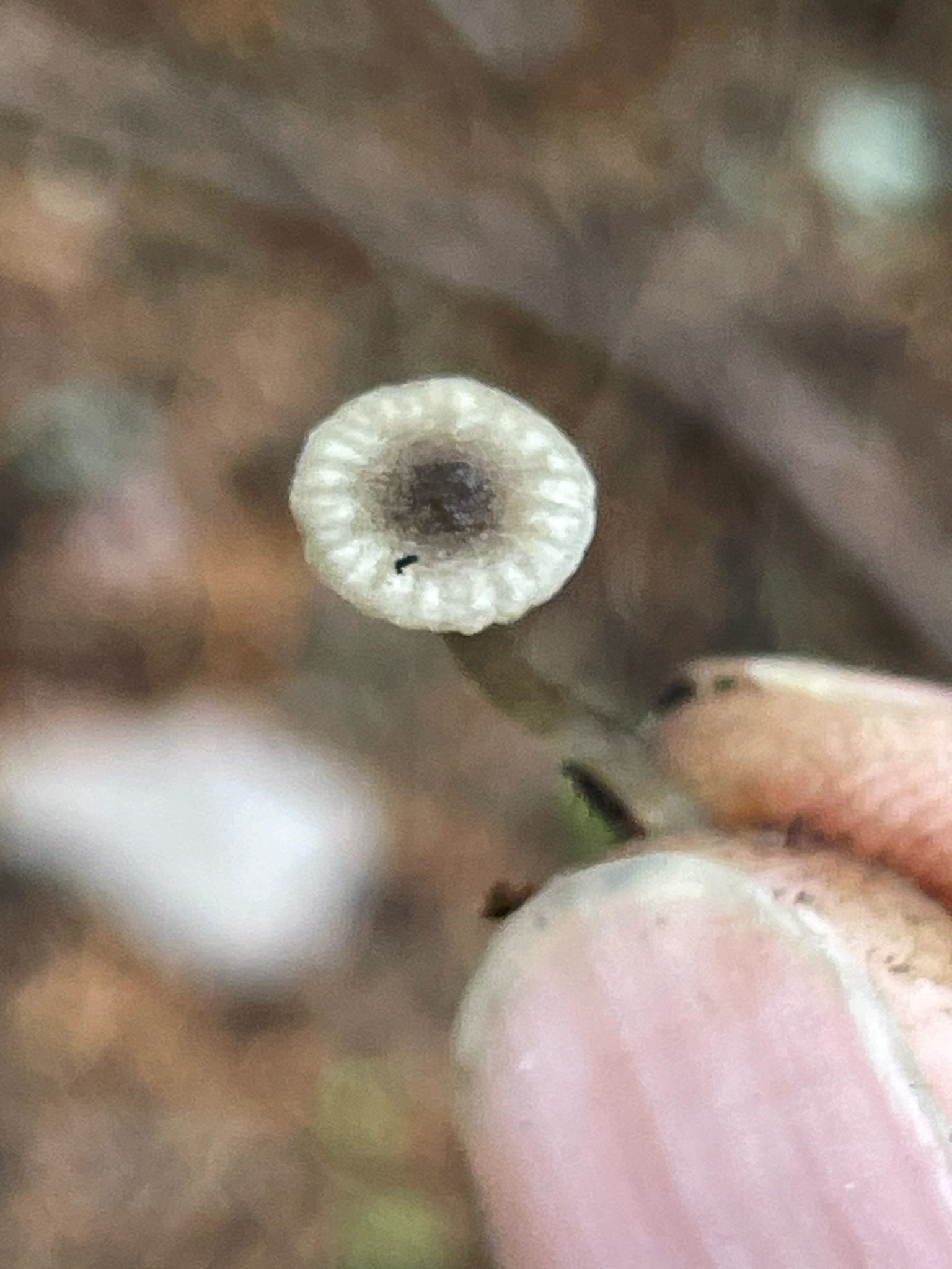 Hut: jung gewölbt, dann genabelt bis trichterförmig, hygrophan, feucht rosabräunlich oder gelbbraun, bis zur Mitte durchscheinend gerieft, trocken blass weisslich grau graubraun, Rand unregelmässig wellig.