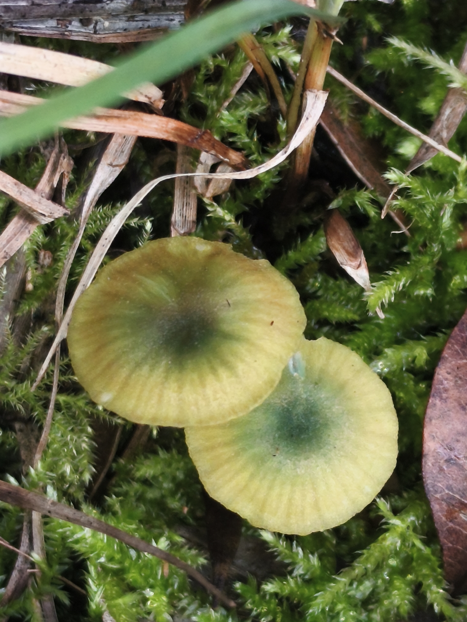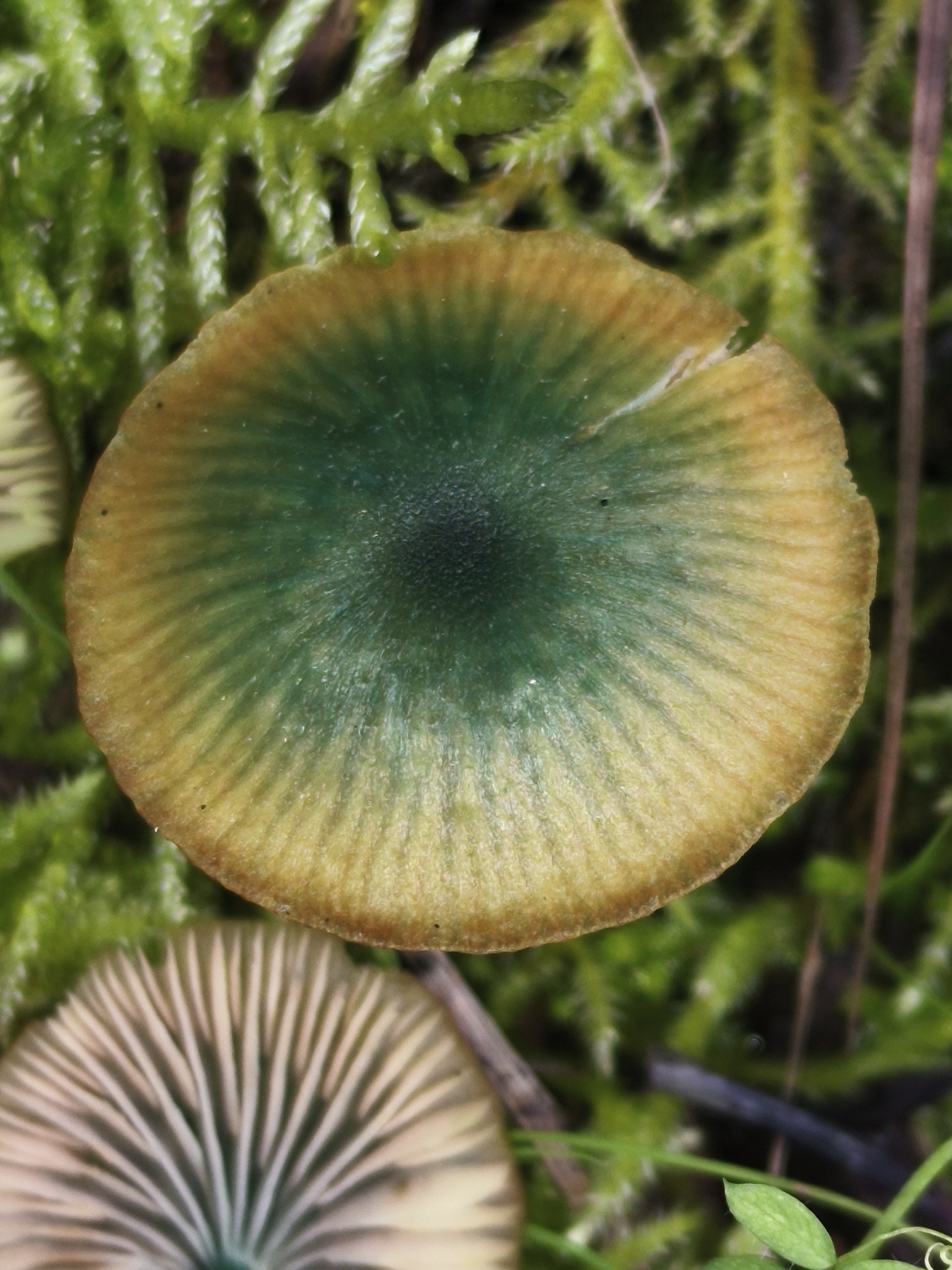 Hut: jung kegelig halbkugelig, bald ausgebreitet und genabelt, schwach hygrophan, feucht durchscheinend gerieft, oliv, gelbgrün oder braun, Mitte dunkler, trocken etwas blasser, eingewachsen faserig, in der Mitte bisweilen faserig-schuppig.