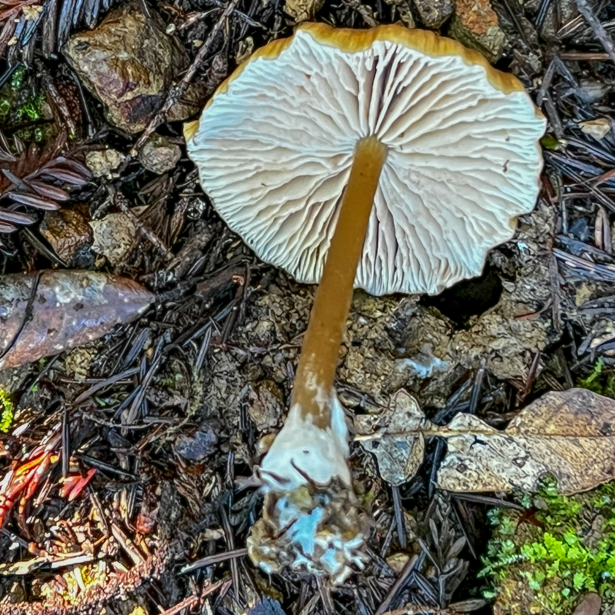 Stiel: ziemlich voll, riefig, gelb bis gelbbraun, glänzend, kahl, Basis weiss filzig.