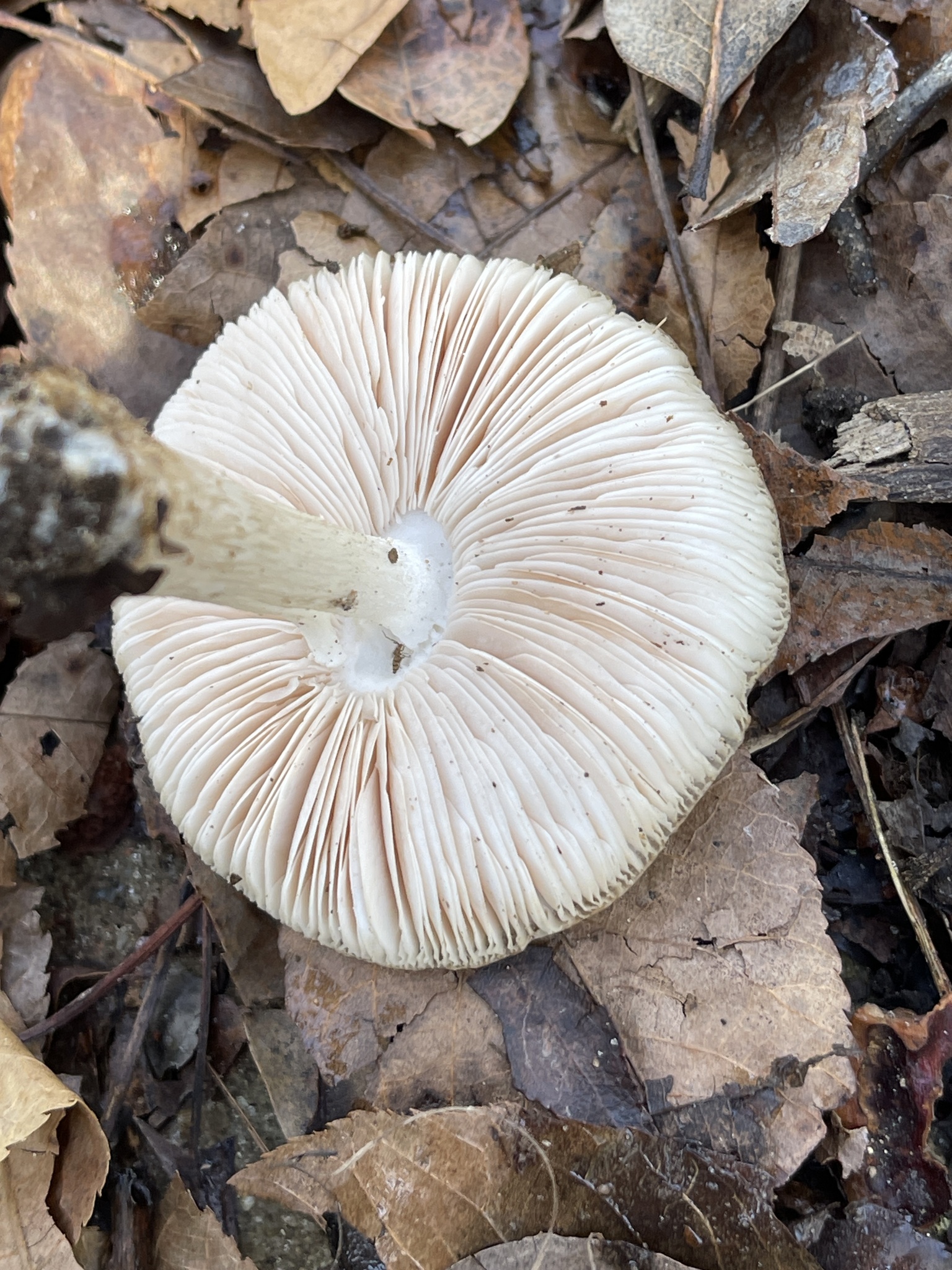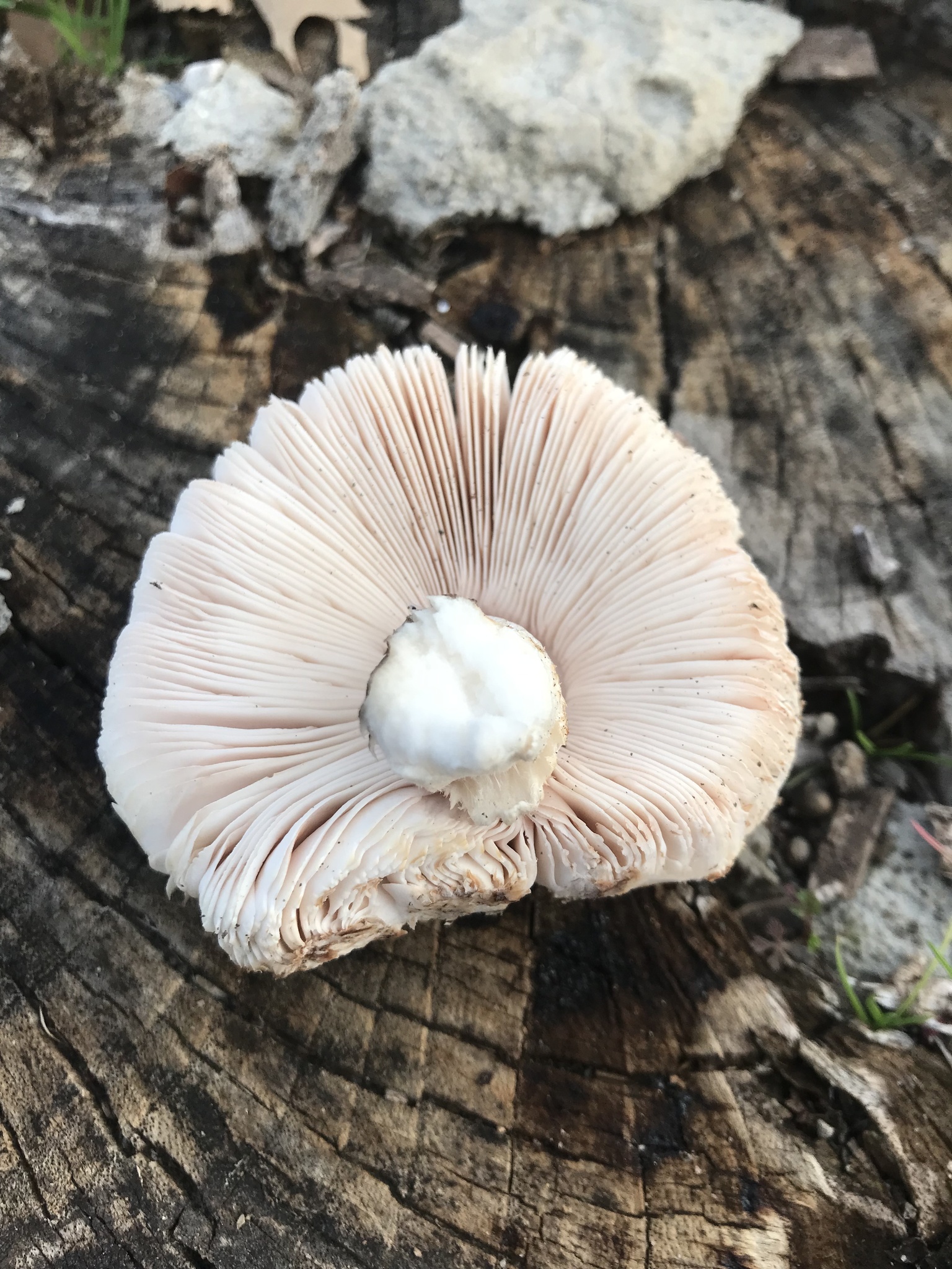 Lamellen: ganz frei, gedrängt, weiss, später blassrosa, breit, bauchig.