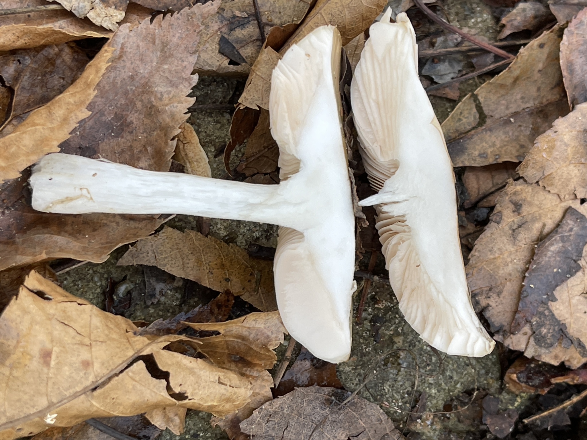 Stiel: fest, weiss, zur Basis eingewachsen braun faserig-filzig, Basis verdickt und oft mit anklumpenden Wurzelfasern.