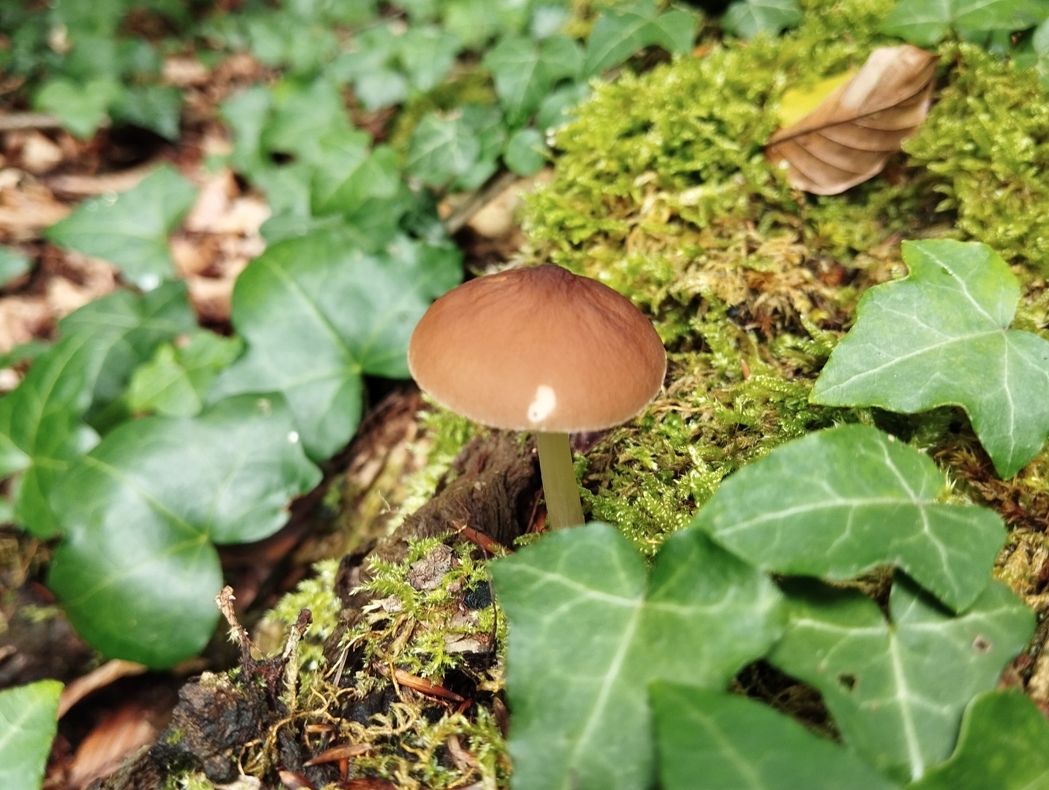 Hut: jung halbkugelig-kegelig, später flach und mehr oder weniger gebuckelt, auffällig rund, von der Mitte in richtung Rand deutlich aderig, oft bis zum Rand, schwach hygrophan, feucht dunkelbraun, trocken blassbraun, Rand feucht durchscheinend gerieft.