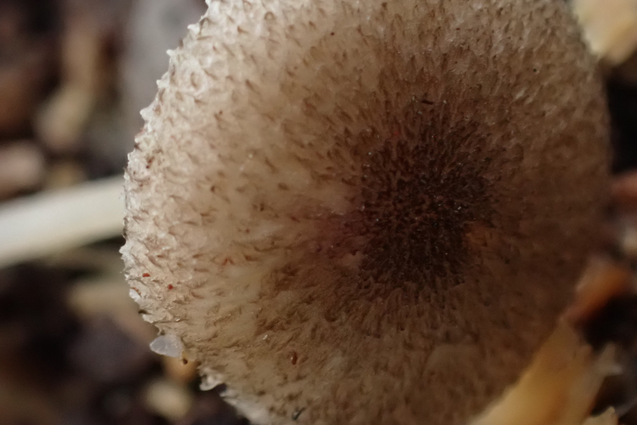 Hut: jung halbkugelig-kegelig, später flach gewölbt bist ausgebreitet flach, etwas gebuckelt, dunkel braungrau, Mitte dunkler und fein faserig haarig bis schuppig, Rand blasser, mit zum Teil überstehenden Fasern, später rillig.
