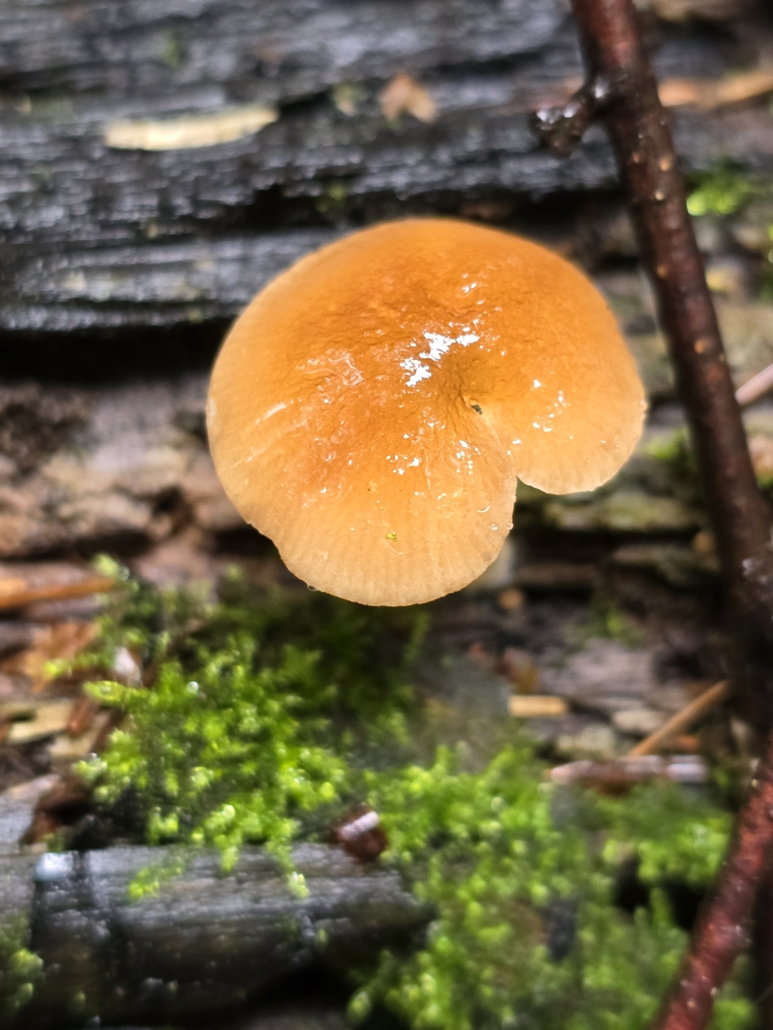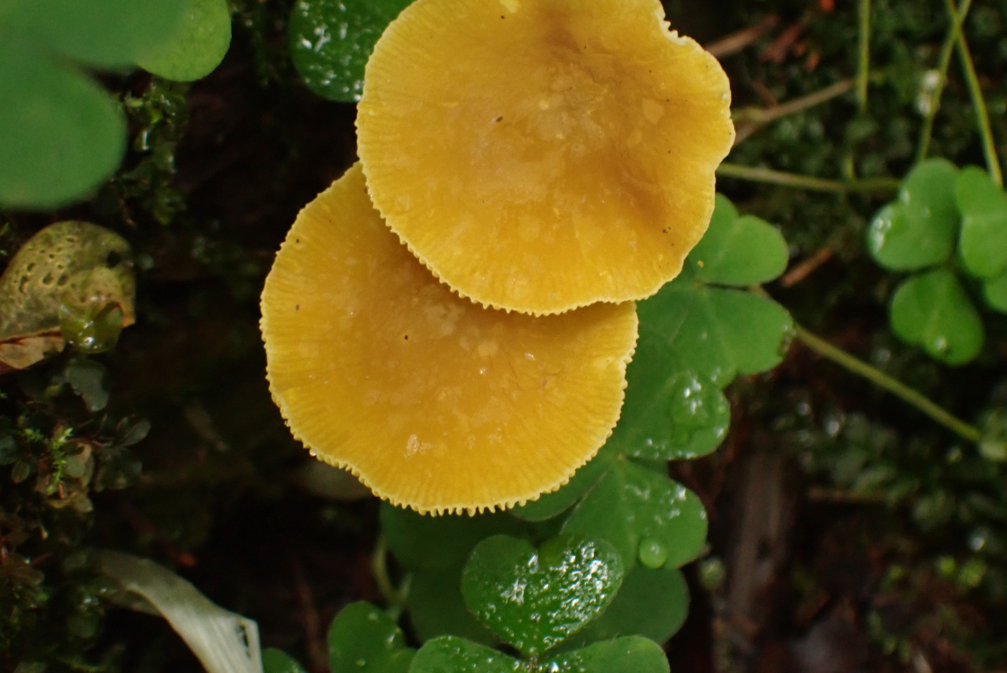 Hut: jung glockenförmig, dann ausgebreitet, glatt und Mitte runzelig-aderig, radial riefig, Rand wellig, hygrophan, feucht olivgelb bis ockergelb, durchscheinend gerieft, trocken goldgelb mit olivgrünem Schein in der Mitte.