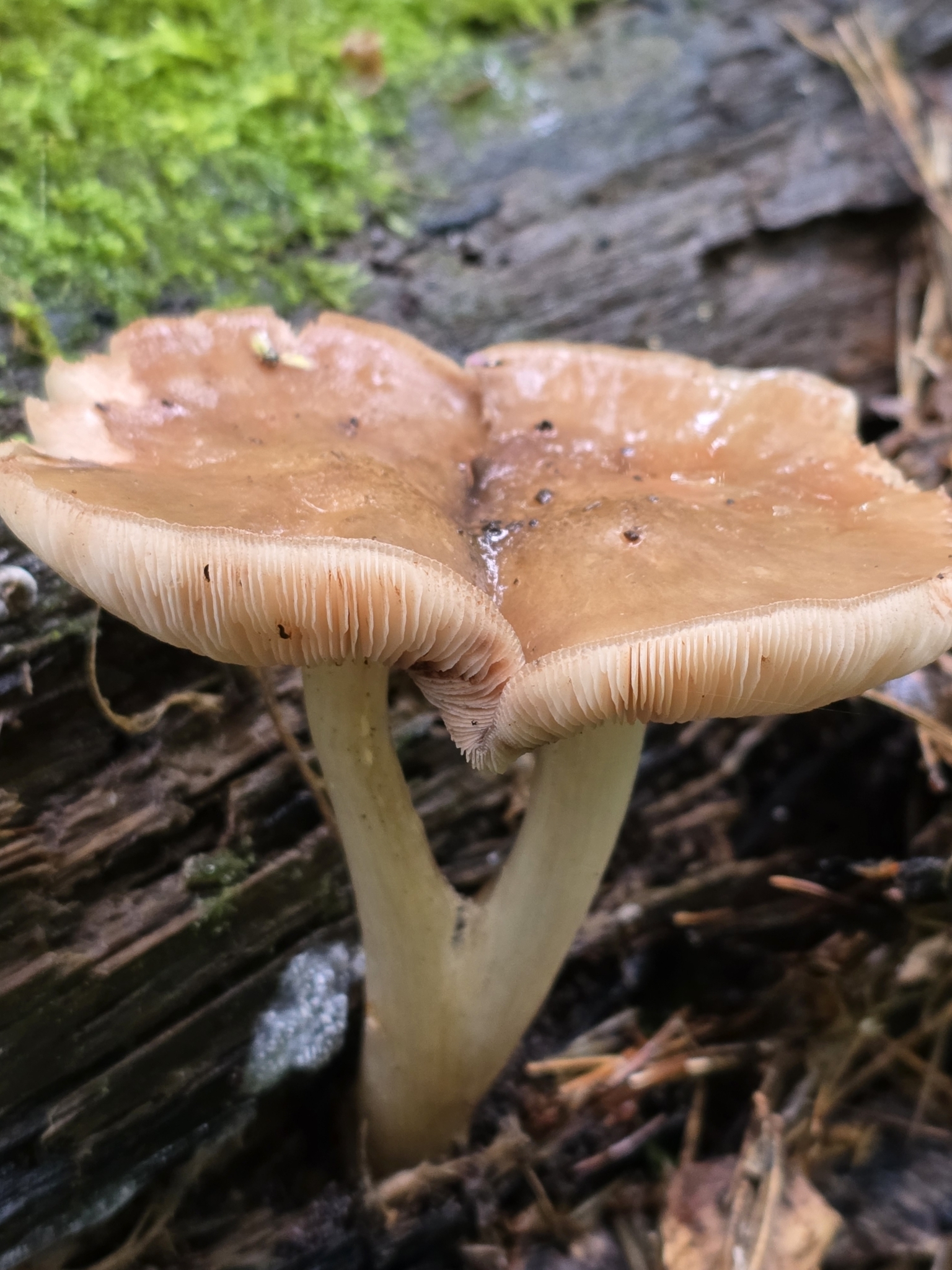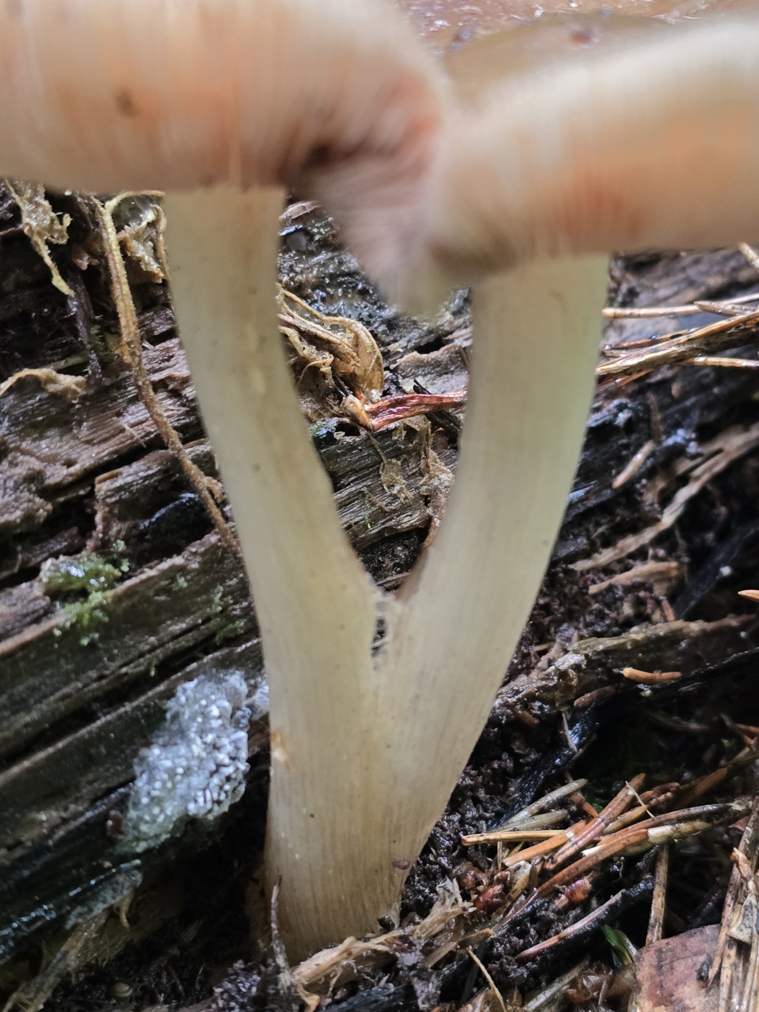 Stiel: blasscreme bis lederfarben, eingewachsen faserig, kahl, glänzend, Basis oft verdickt gekrümmt und weisslich filzig.