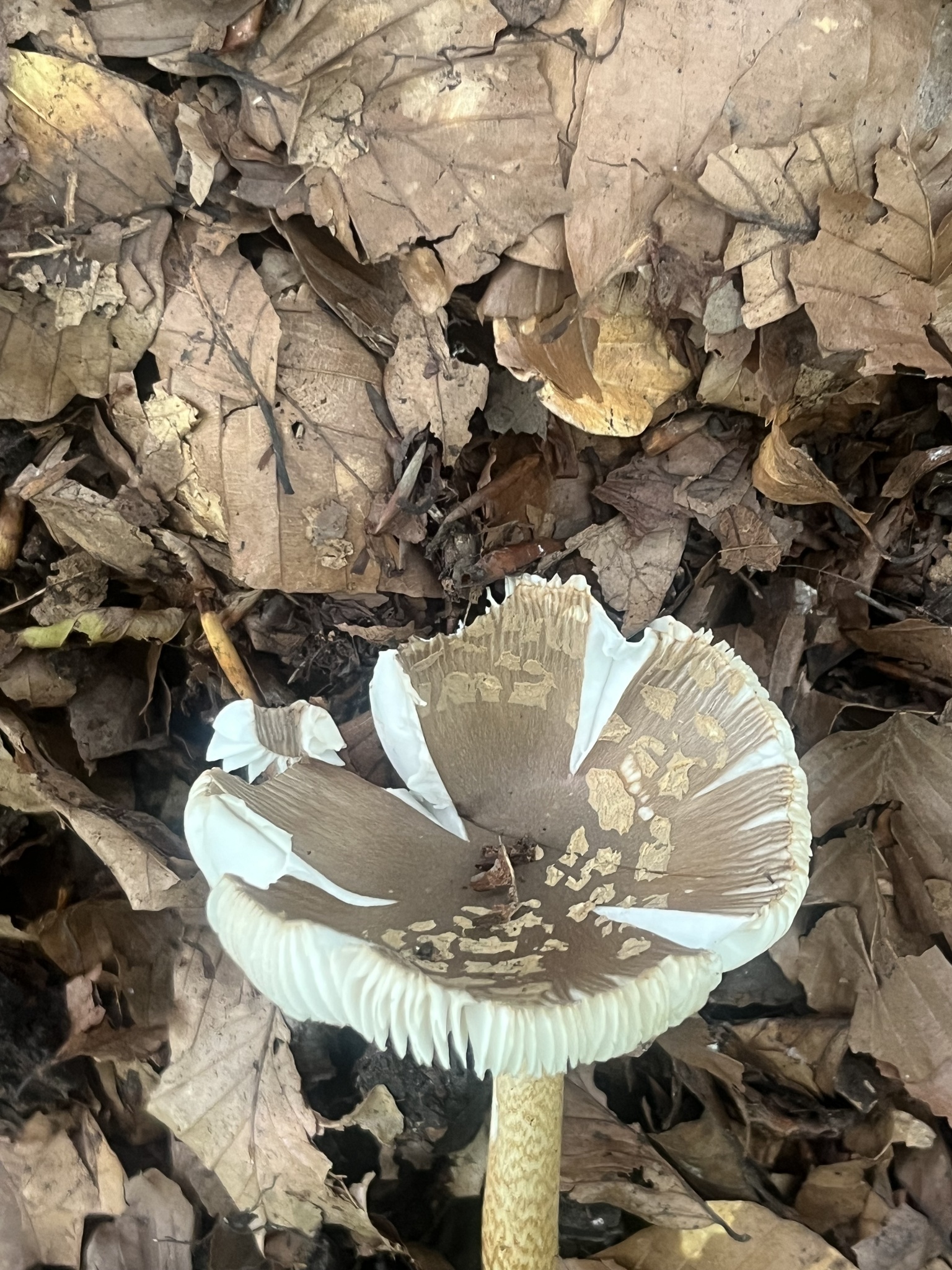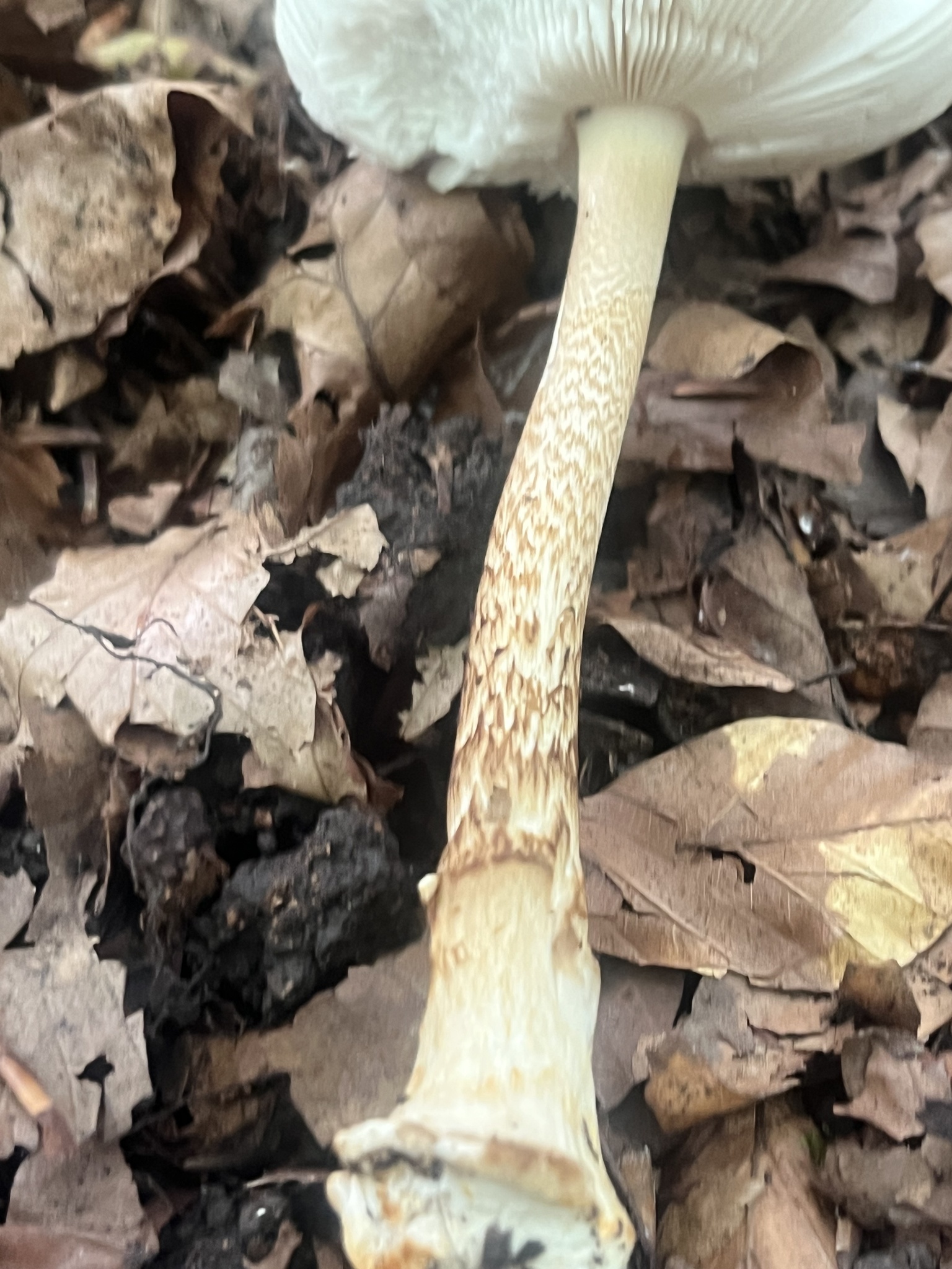 Stiel: weisslich, blassbräunlich genattert, flockig, Spitze mit feinen Rillen, Volva sehr brüchig warzig, weiss, später bräunend.